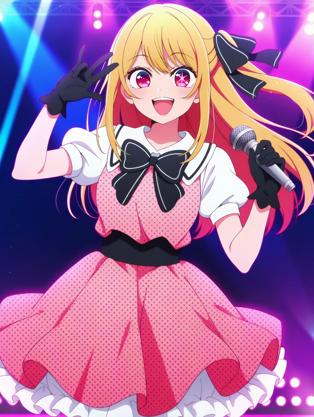 idol_popin2, pink dress, short dress, white shirt, puffy short sleeves, white collar, black waistband, white frills, black polka dot dress, white petticoat, black gloves, black bow, black bowtie, hair ribbon