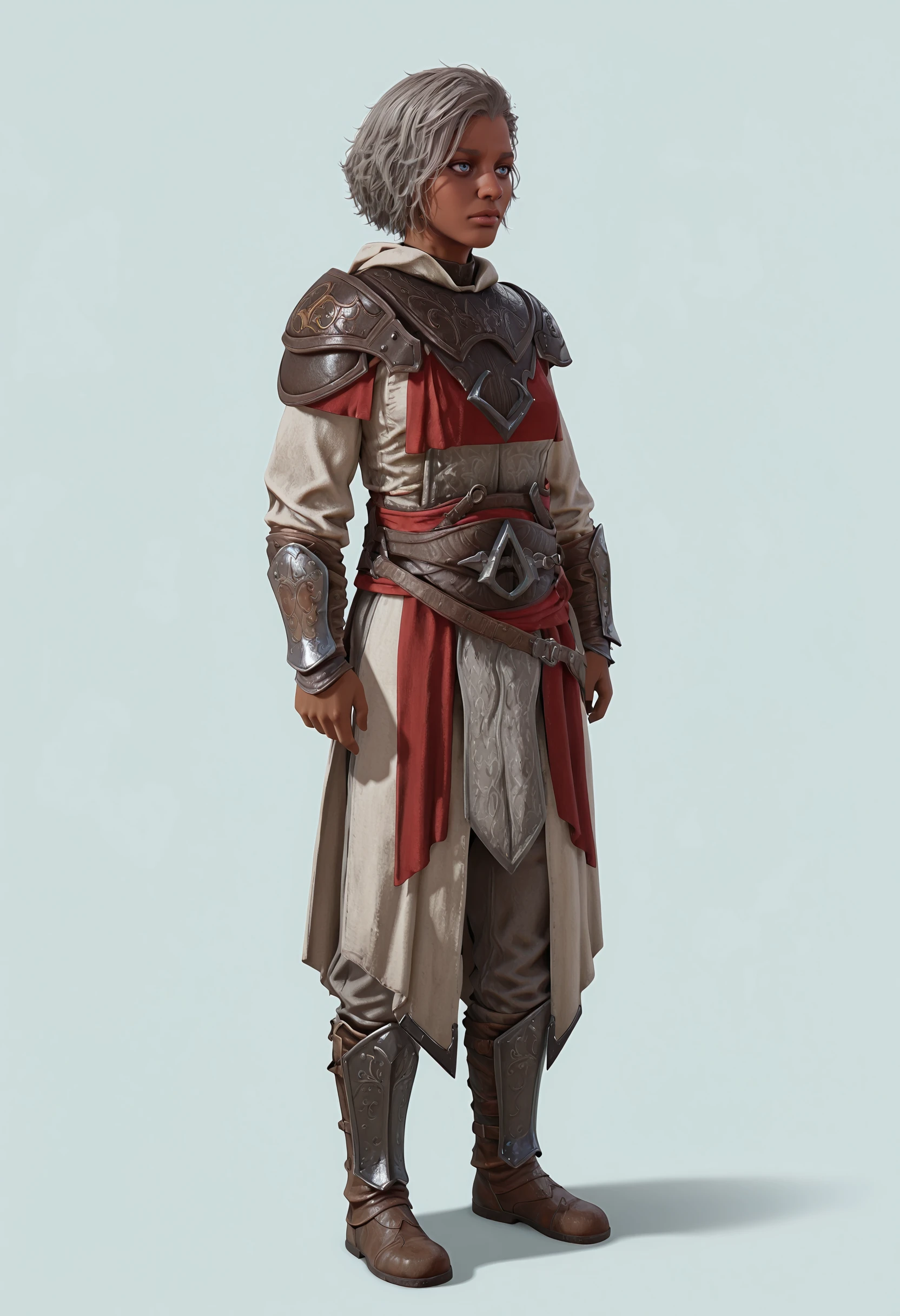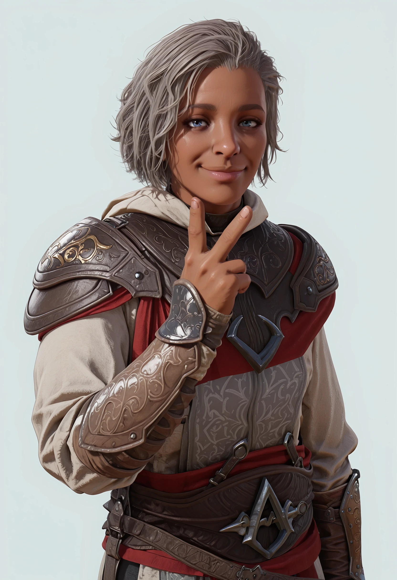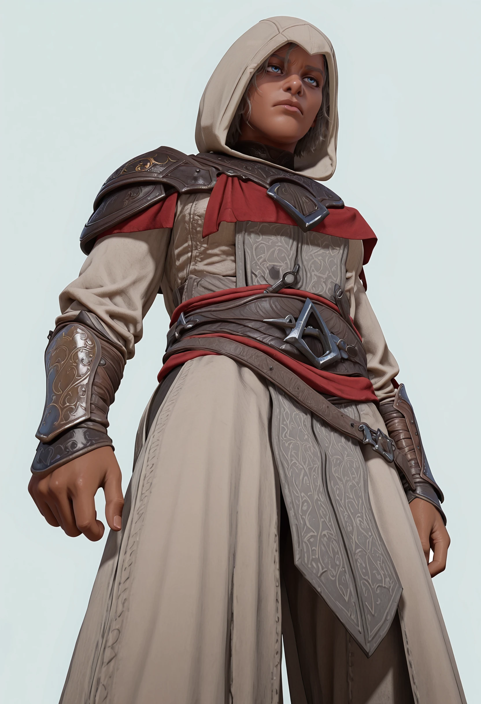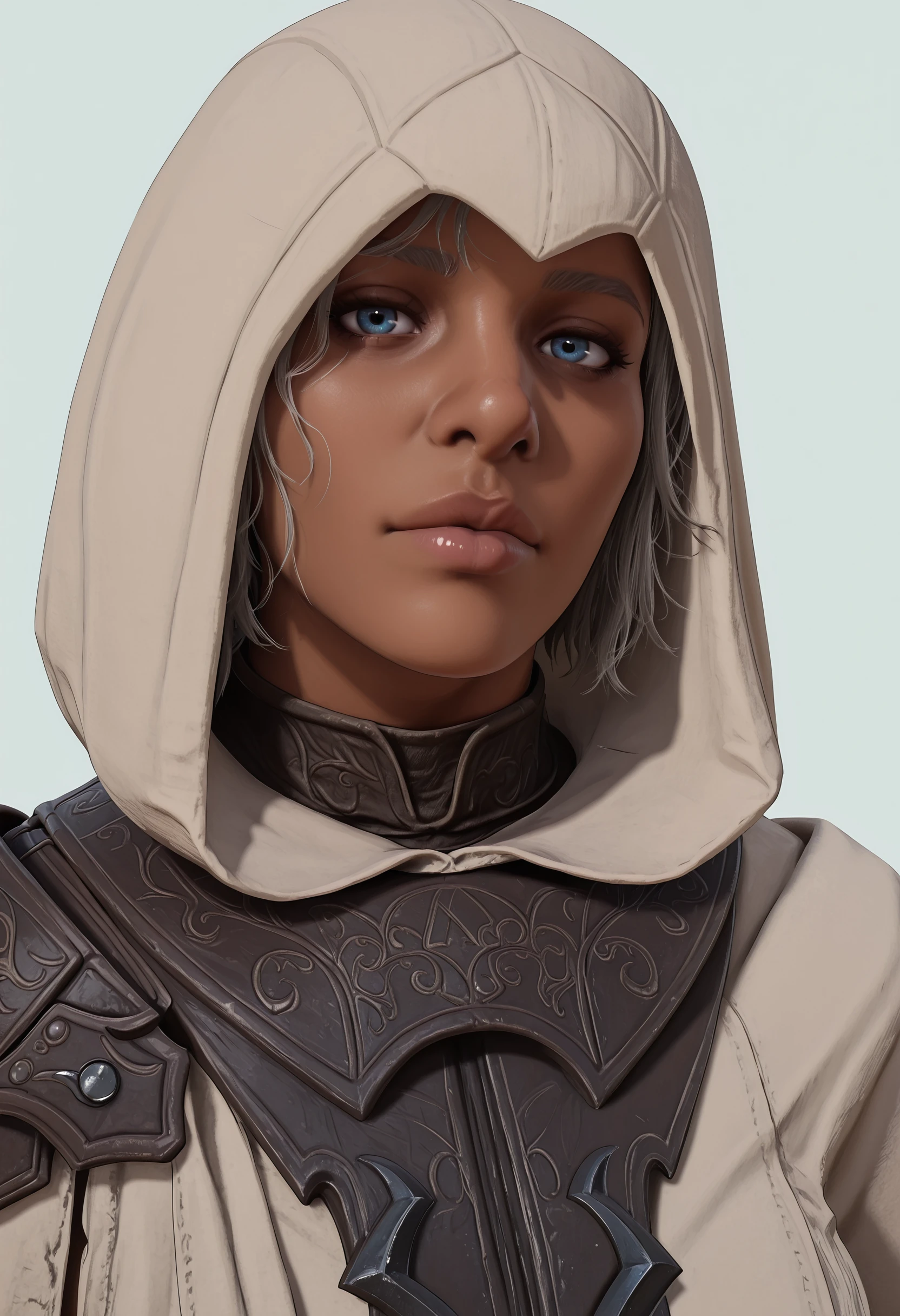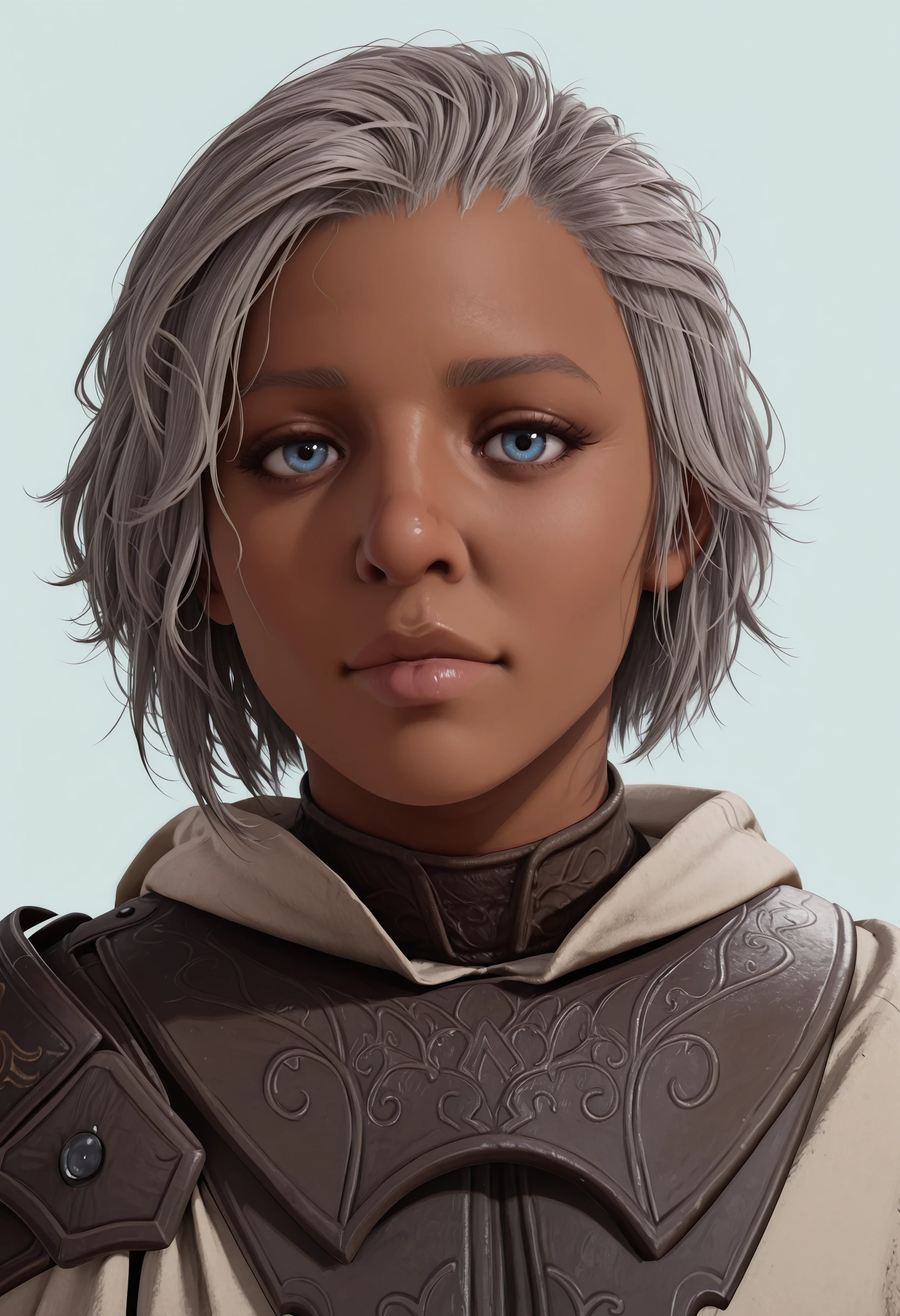 railf, 1girl, short hair, grey hair, blue eyes, dark skin, dark-skinned female, armor, hood, vambraces, shoulder armor, boots