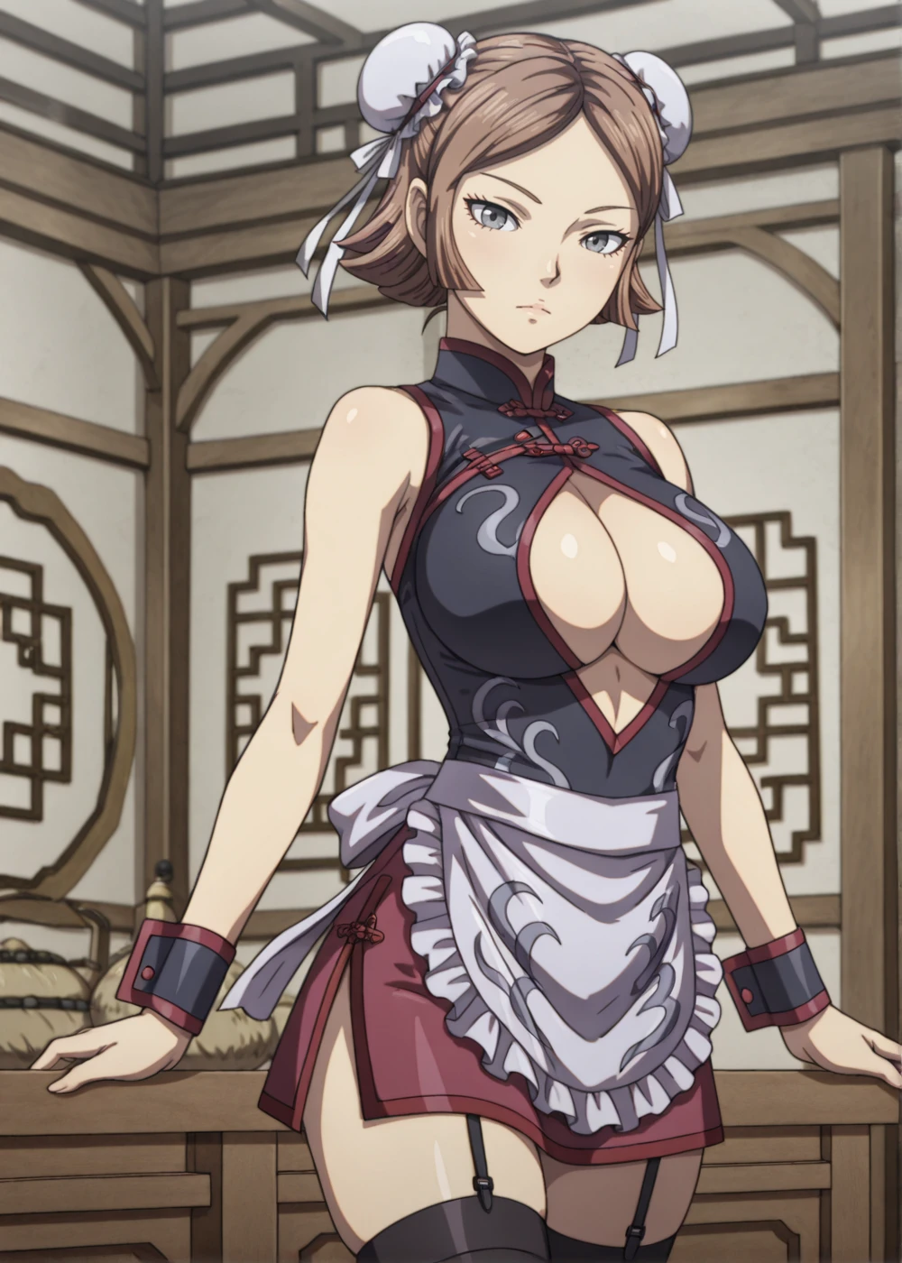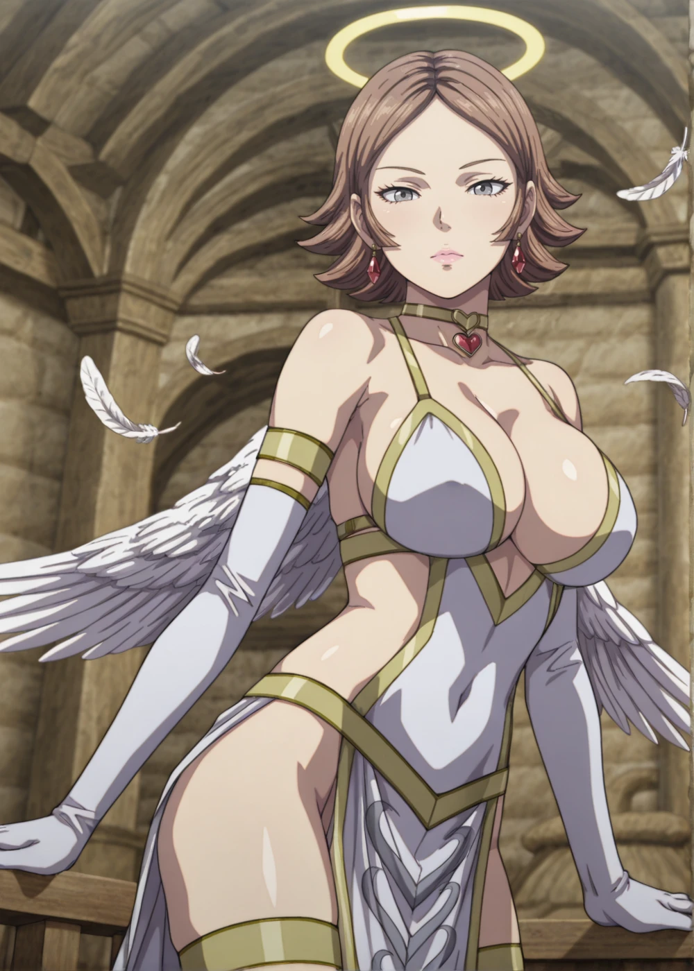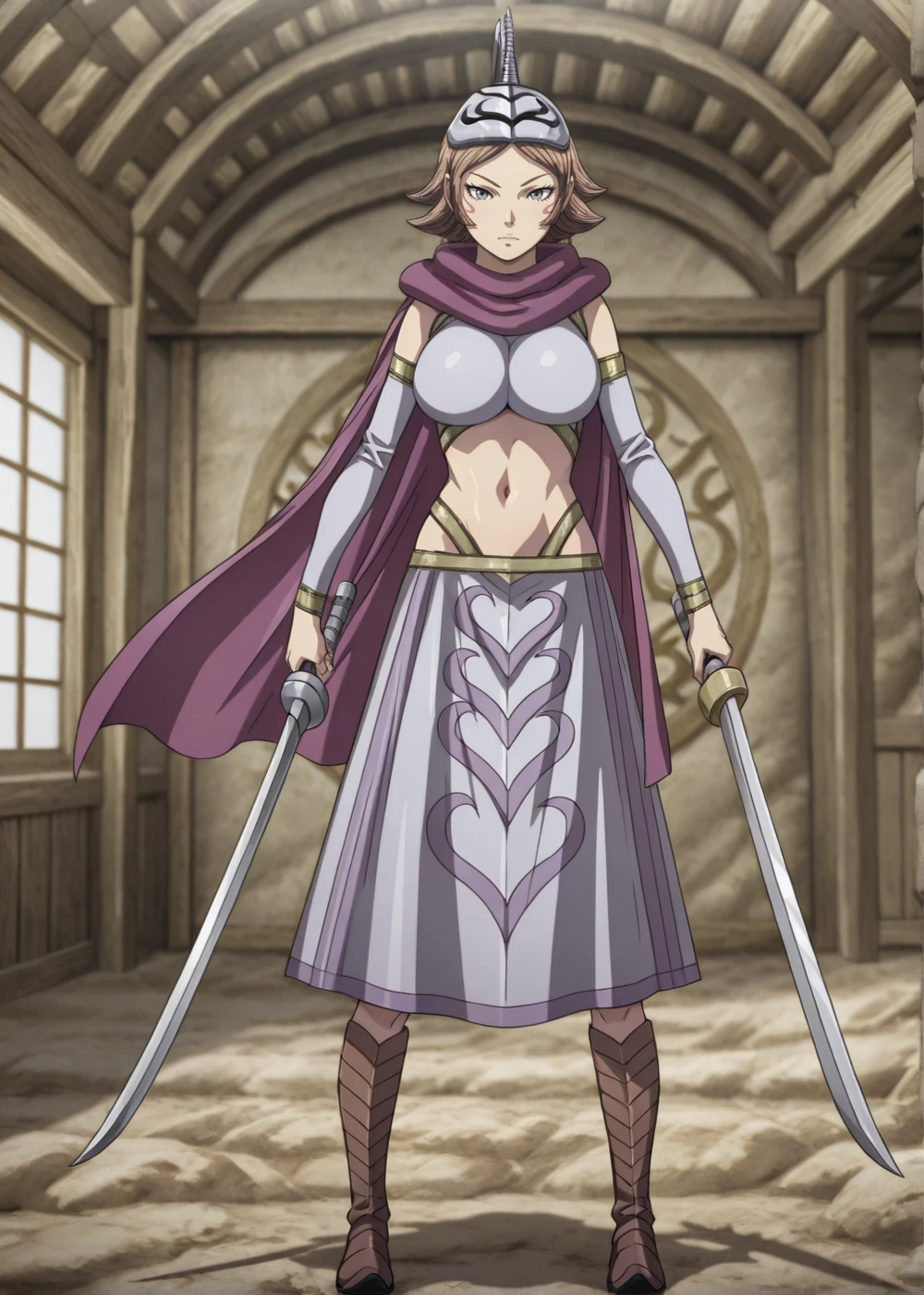 kitari (kingdom), 1girl, solo, brown hair, short hair, grey eyes, large breasts, cape, navel, skirt, detached sleeves, grey boots, armor boots