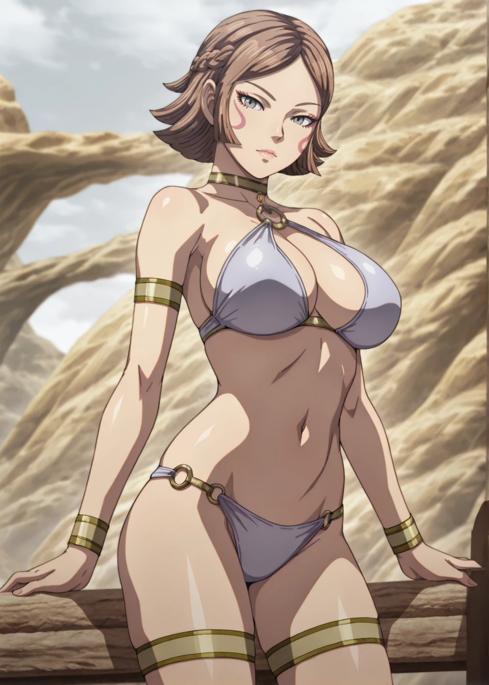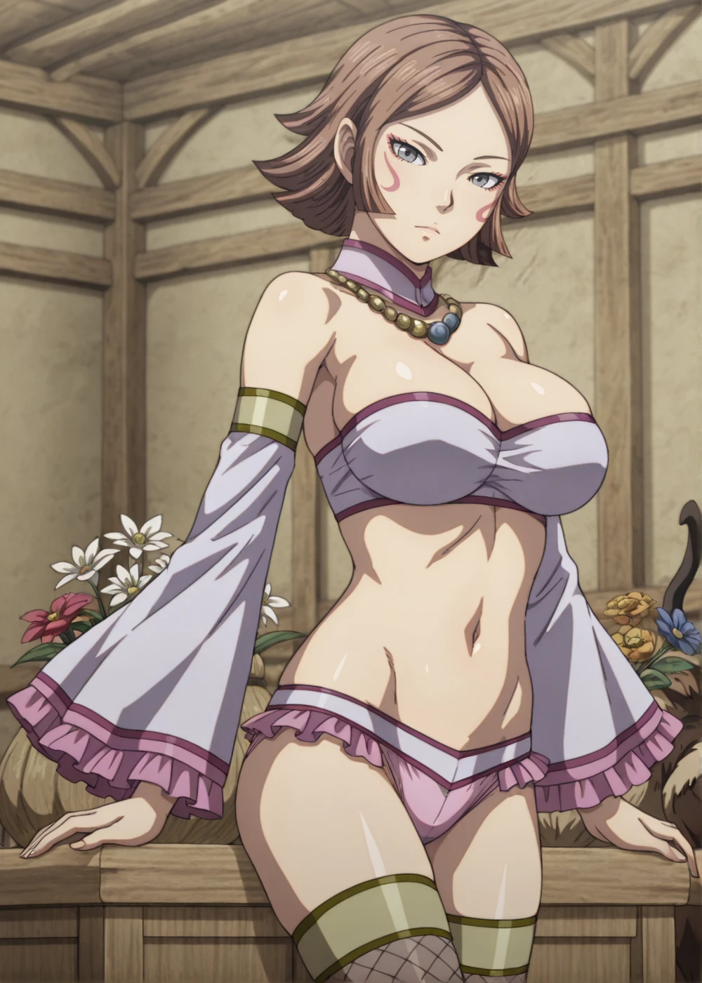 kitari (kingdom), 1girl, brown hair, short hair, facial mark, grey eyes, large breasts, white shirt, scarf, bare shoulders, sleeves