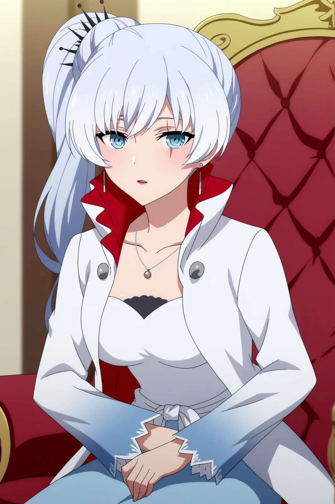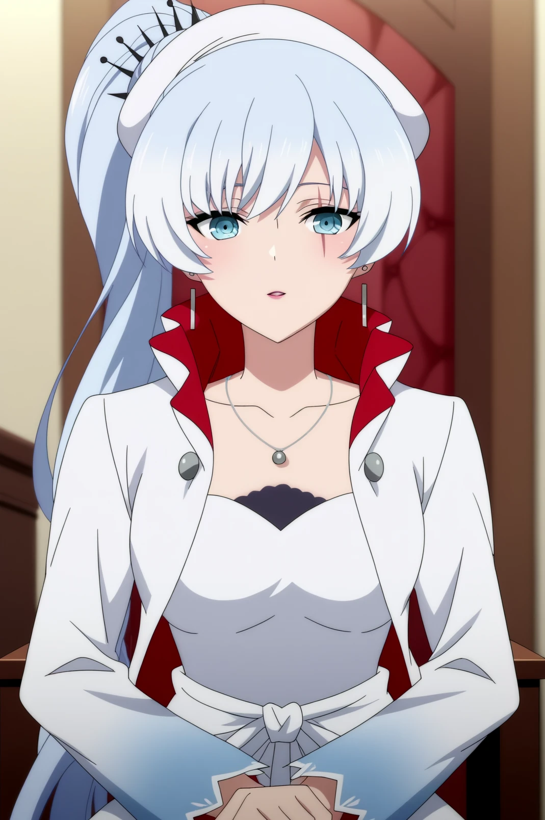 weiss schnee,anime screencap,1girl,solo,mature,blue eyes,scar,scar across eye,scar on face,ponytail,earrings,jewelry,necklace