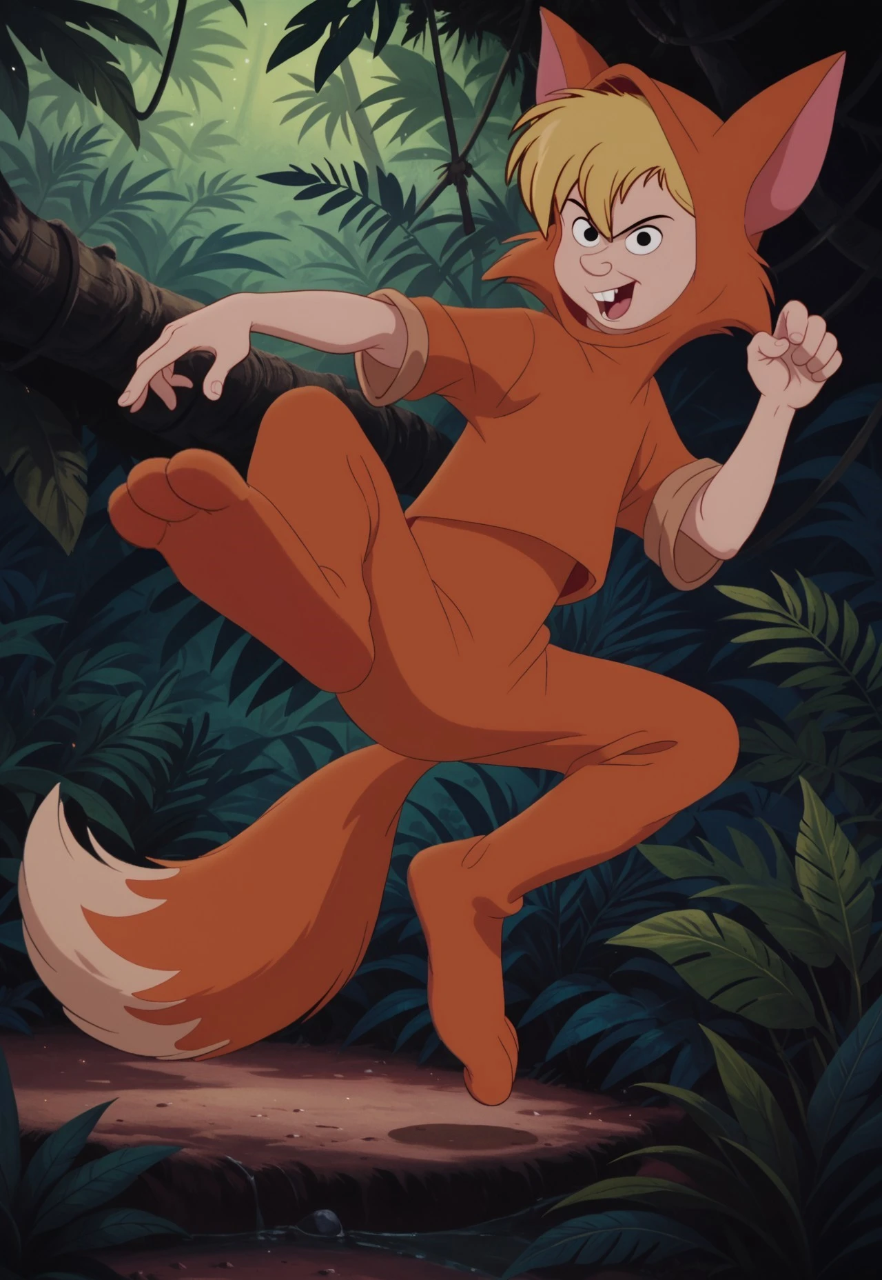 slightlypan, 1boy, solo, animal hood, blonde hair, black eyes, buck teeth, orange animal costume, fox tail