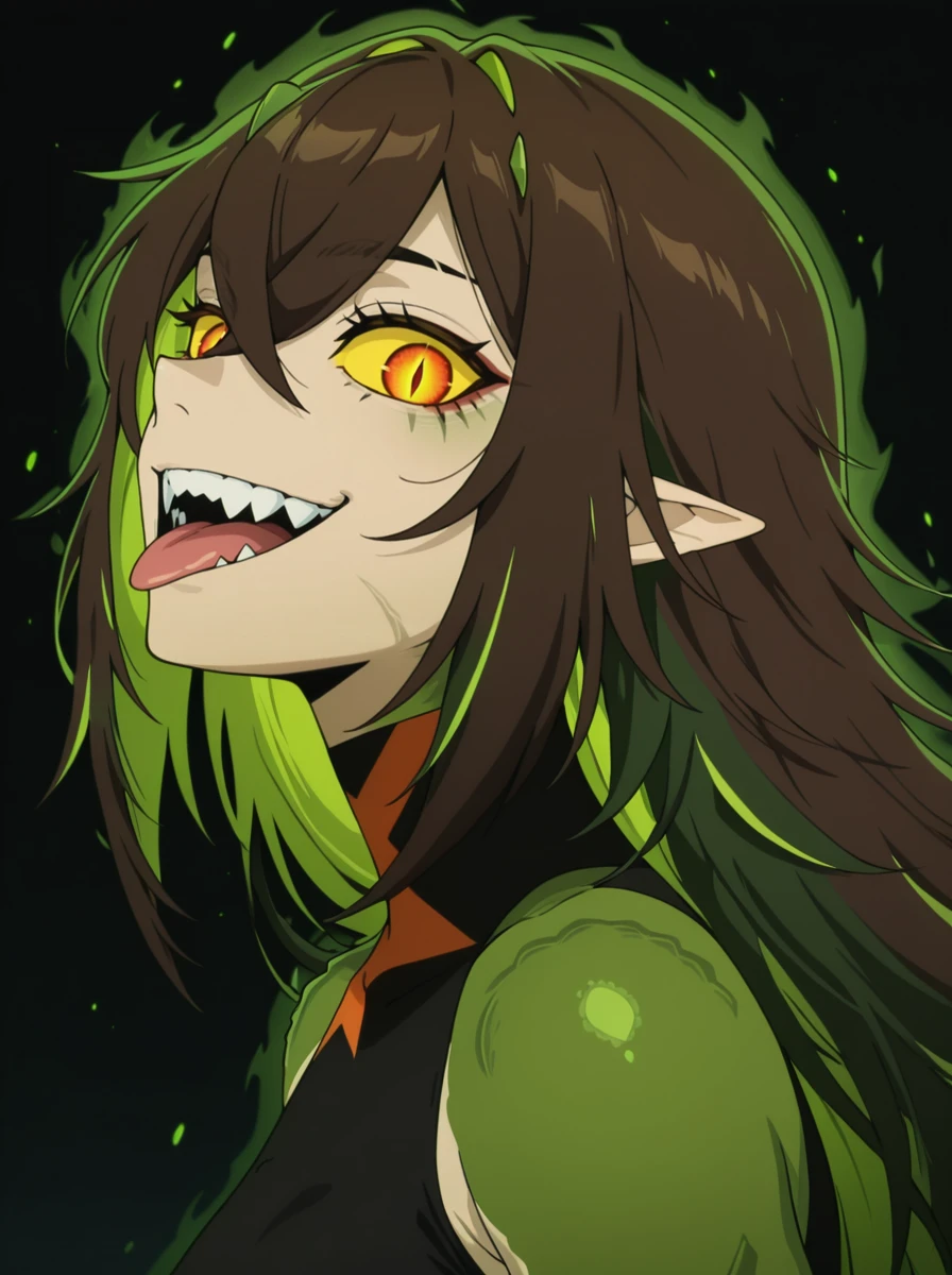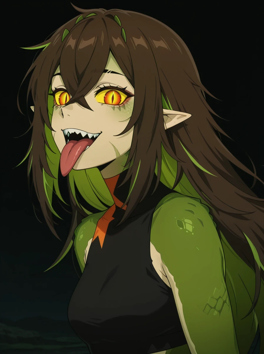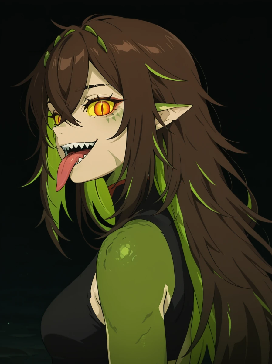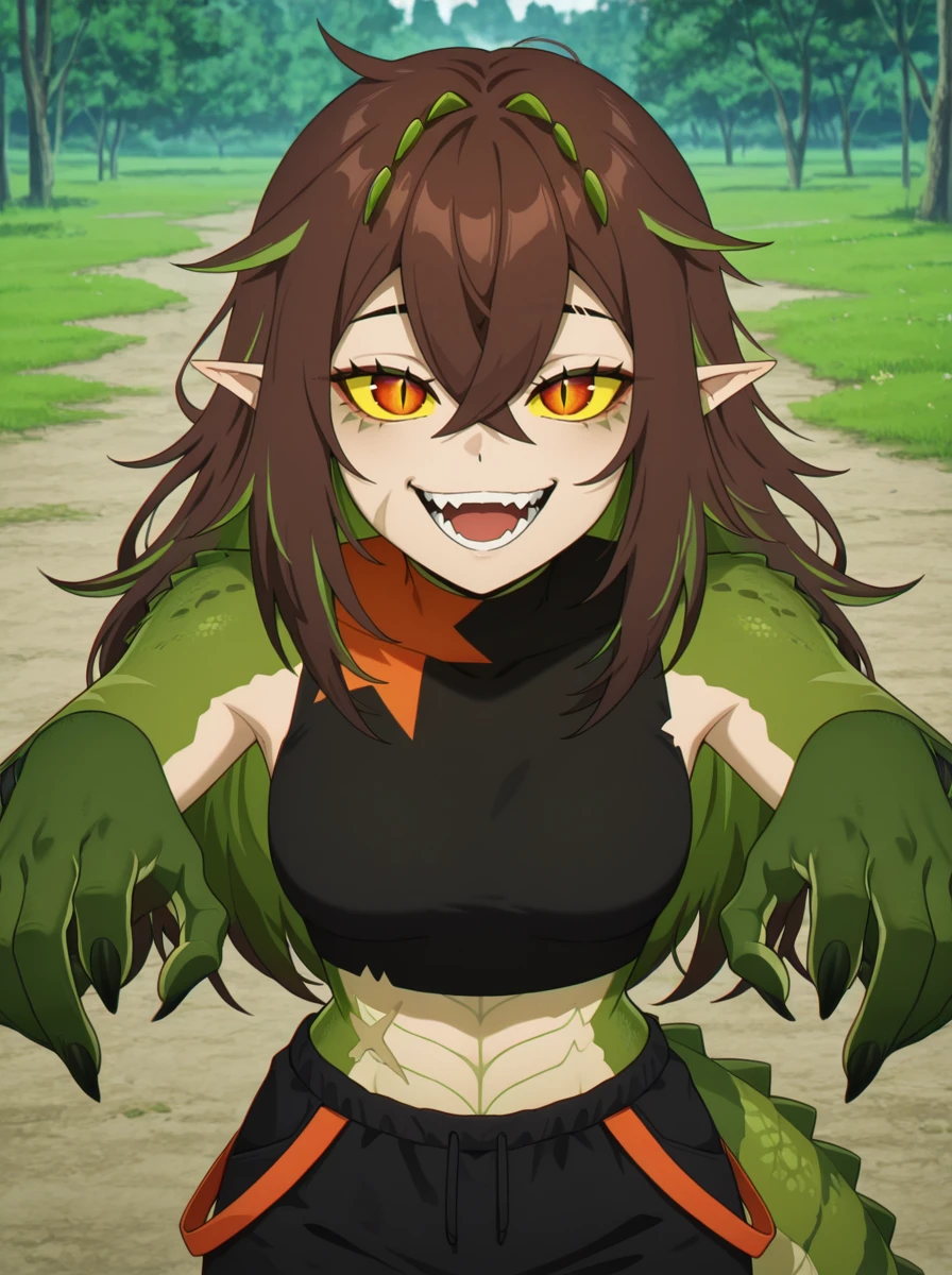 Prompts: tail, monster girl, slit pupils, scales, green skin, , multicolored skin, yellow sclera, 1girl, solo, long hair, crossed bangs, green hair, teeth, multicolored hair, black pants, brown hair, hair between eyes open mouth,sharp teeth,