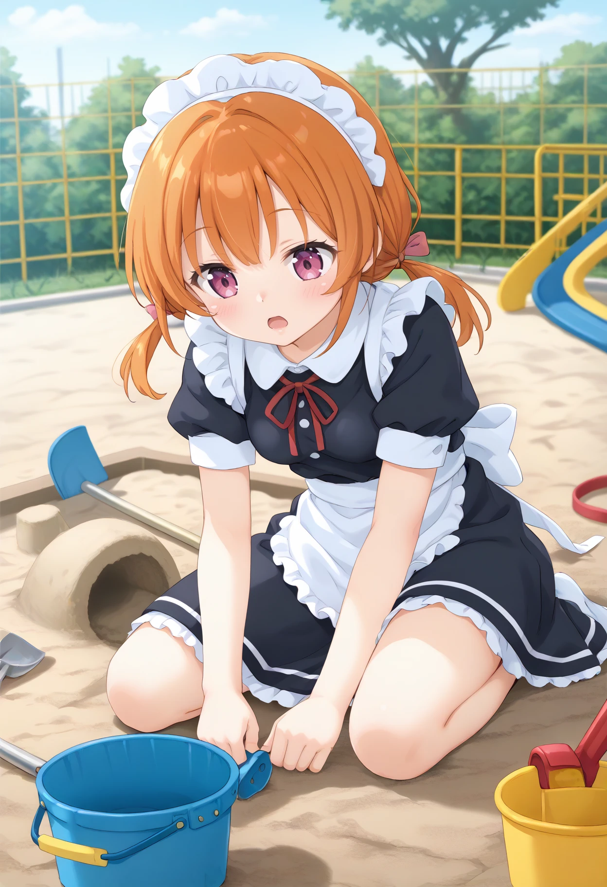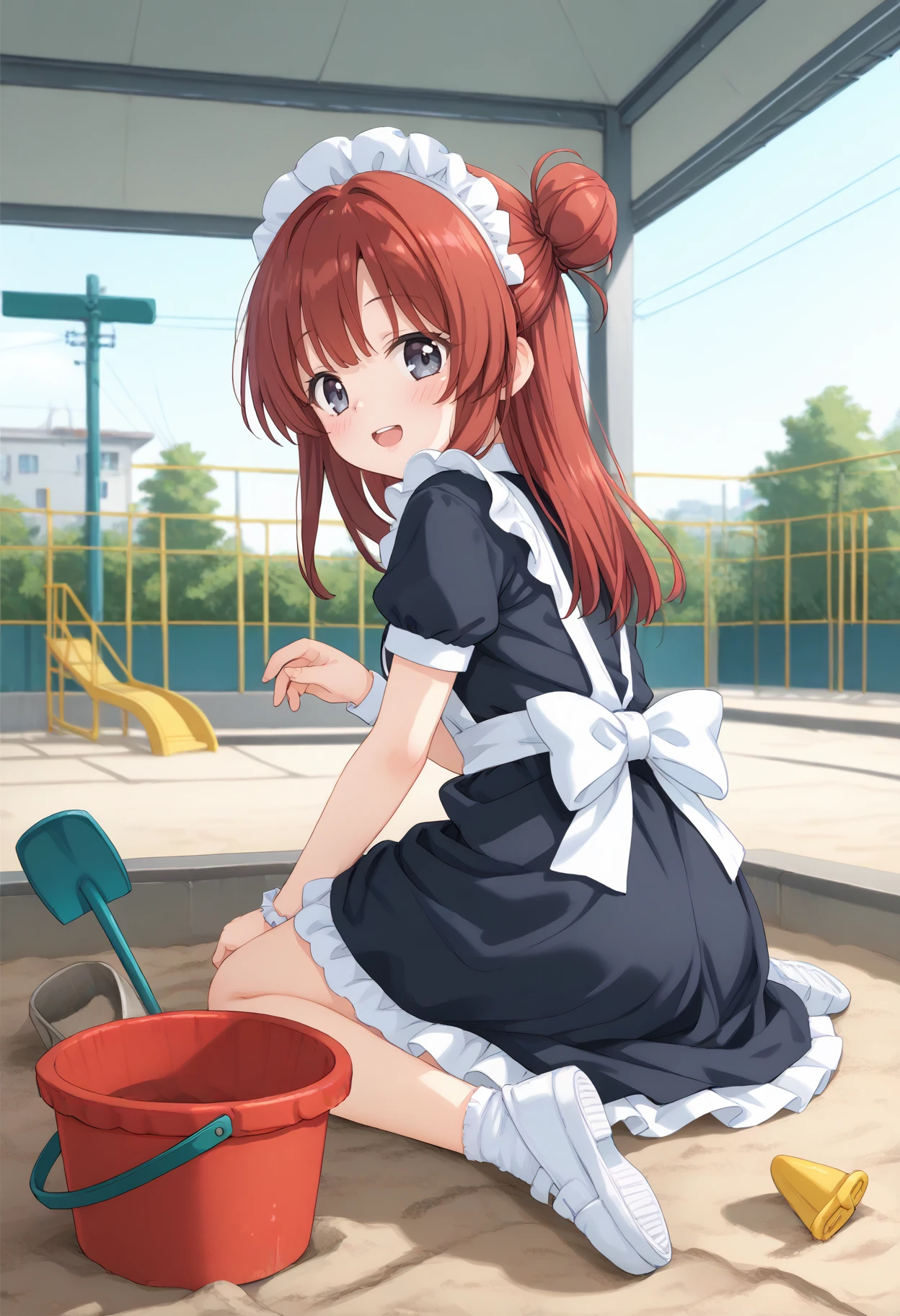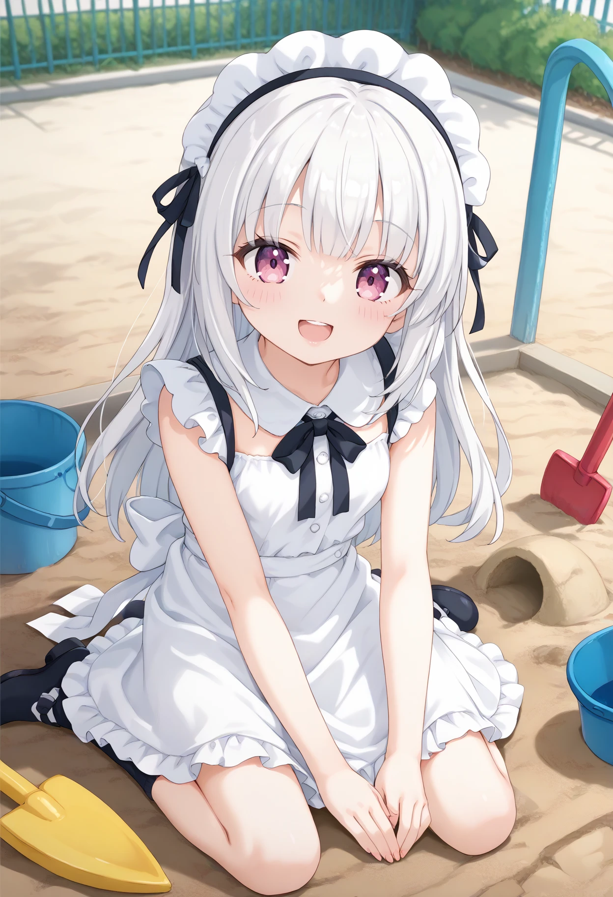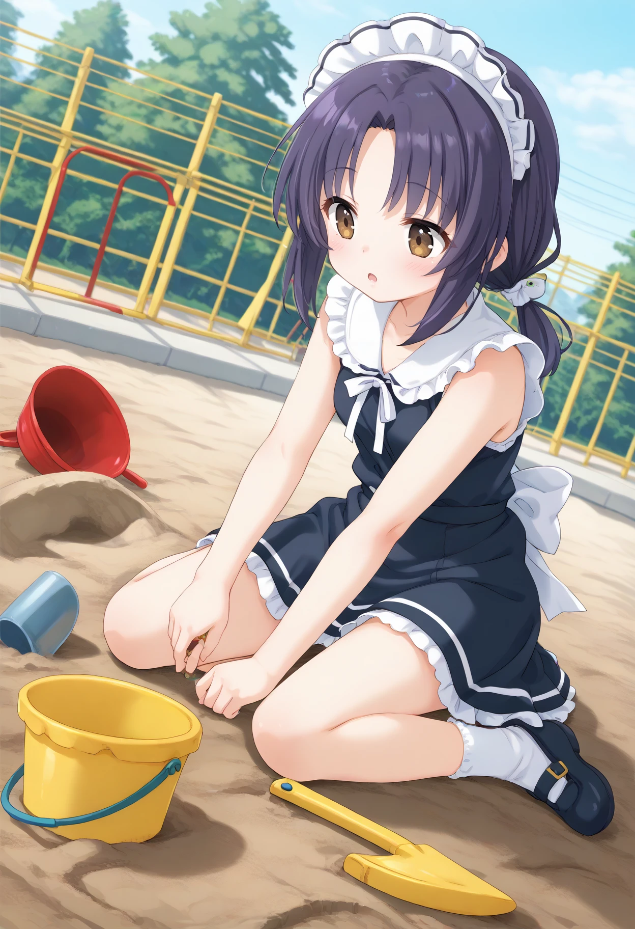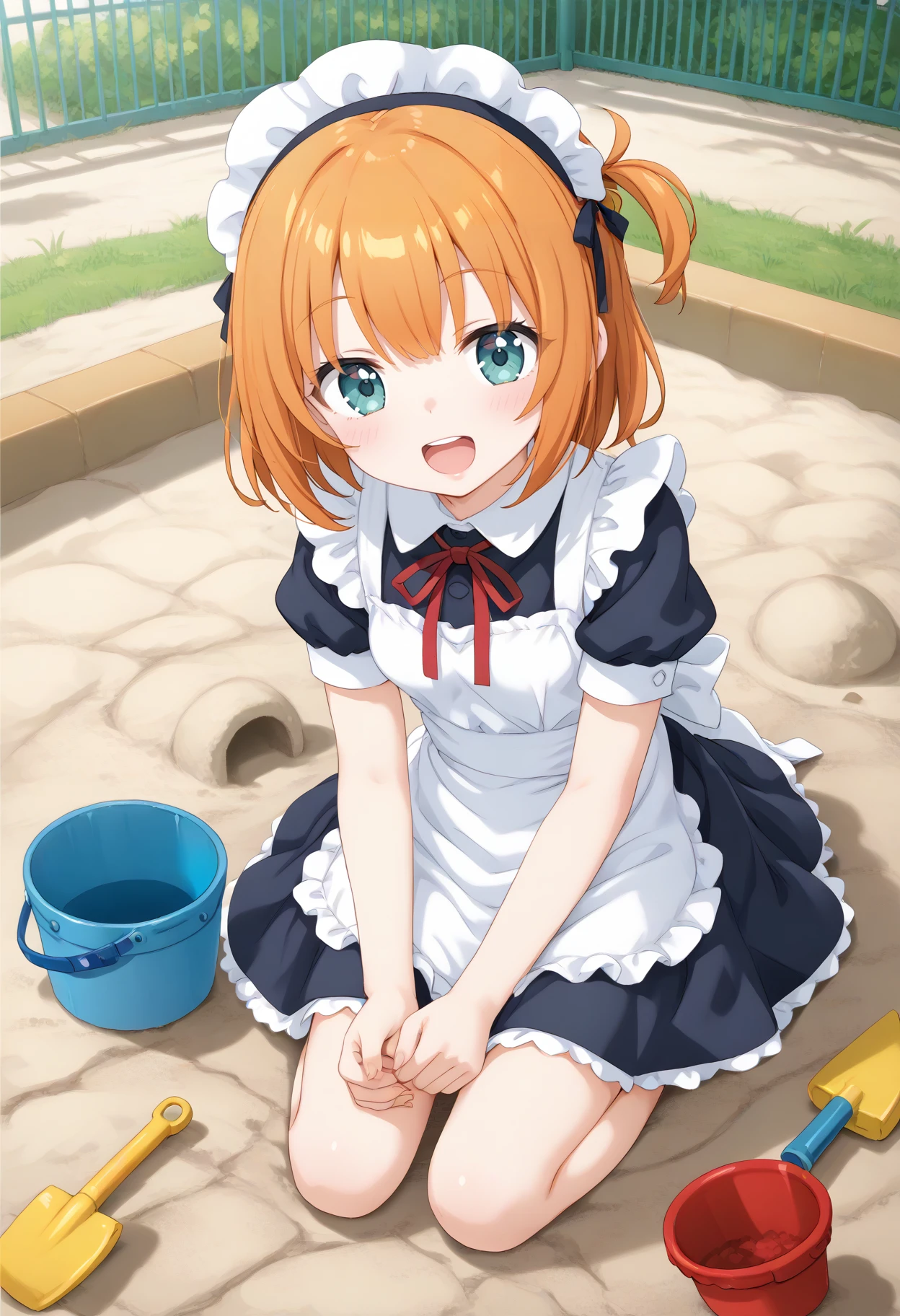 景色があった方が臨場感出ますので ,outdoors, bucket, shovel, sitting, day,playground 辺りは入れるのオススメです。