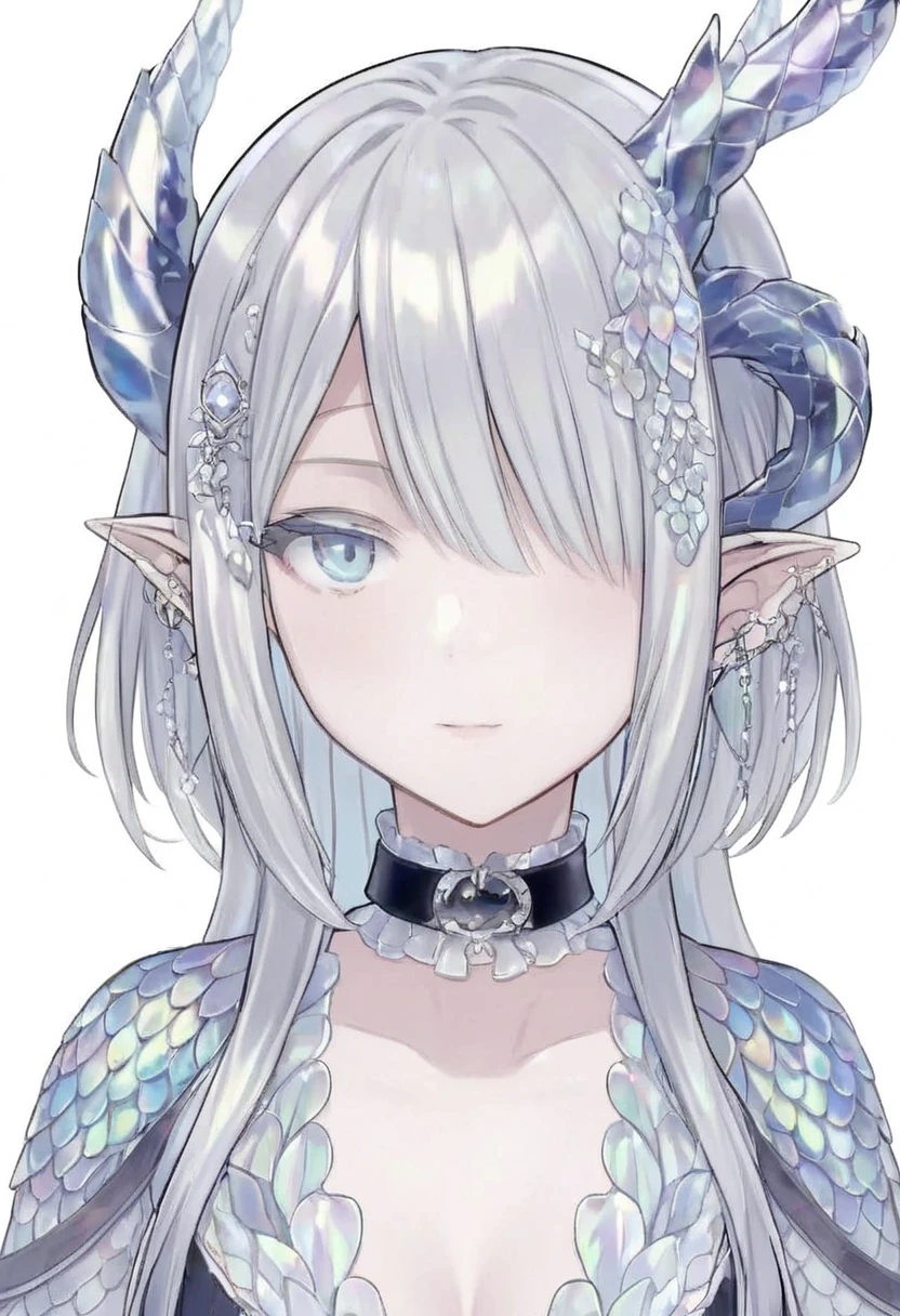 1girl, solo, long hair, white hair, blunt bangs, hair over one eye, covering one eye, mekakure, blue eyes, pointed ears, dragon horns, crystal horns, iridescent scales, scales on skin, earrings, black choker, gemstone choker, dragon tail, dragon claws, clawed feet