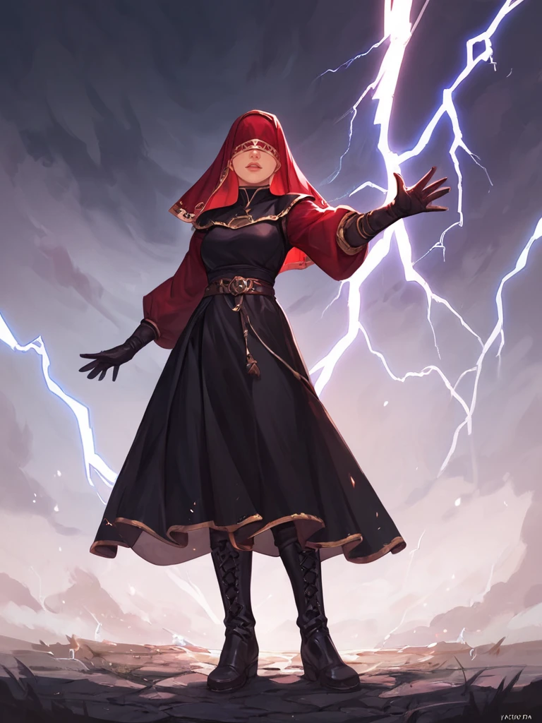 1girl, visasmarr, red veil, covered eyes,black robes, gloves, boots