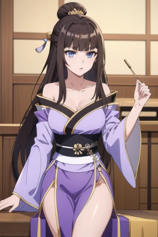 appearance : wu yao, brown hair, long hair, hair ornament, blue eyes, braid, hair bun, single hair bun, hair stick, blunt bangs