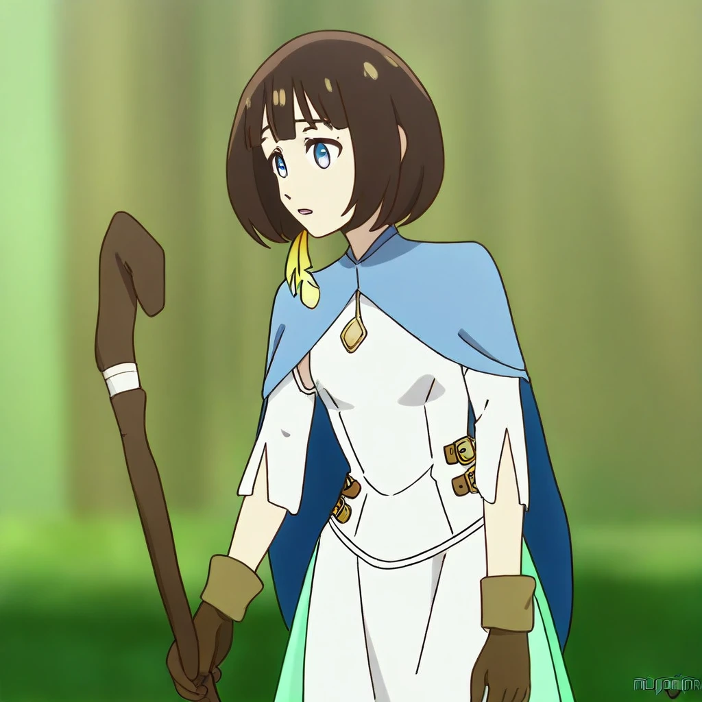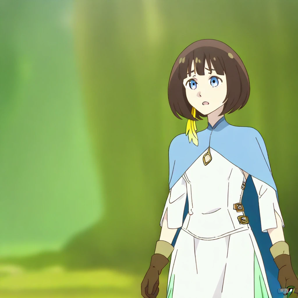 Character appearance: brown hair, short hair, bangs, bob cut, blue eyes, hair ornament, feather in the hair, yellow feather, small breasts