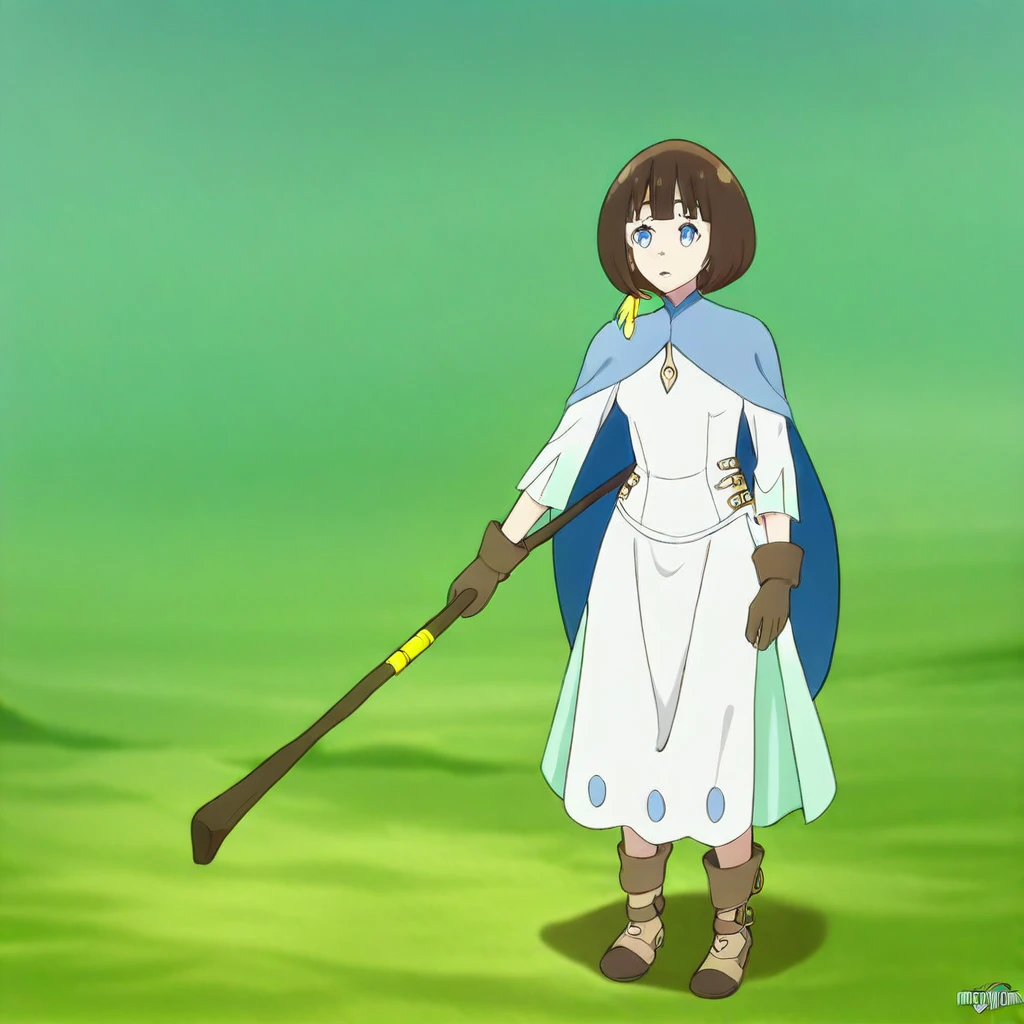 Character's basic outfit: blue cape, white dress, long dress, buckles on the sides, long sleeves, side slit, green petticoat, brown gloves, brown footwear