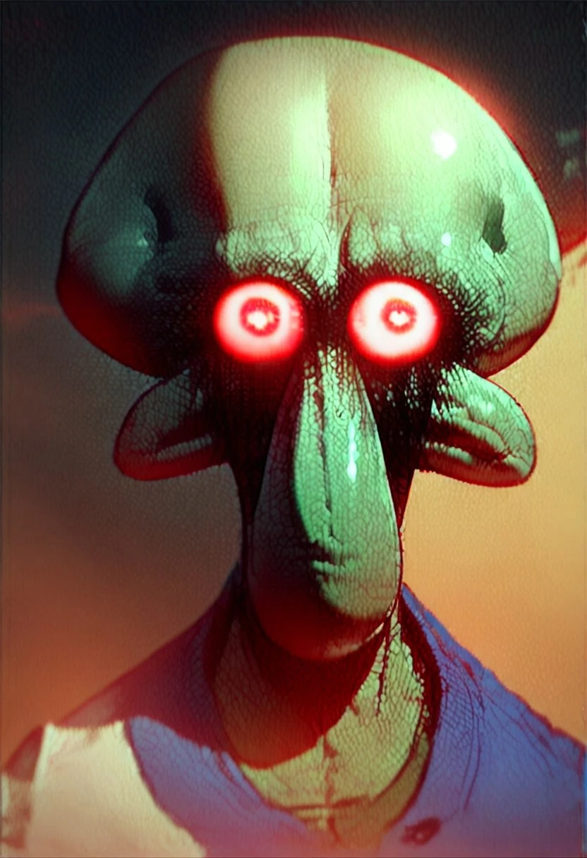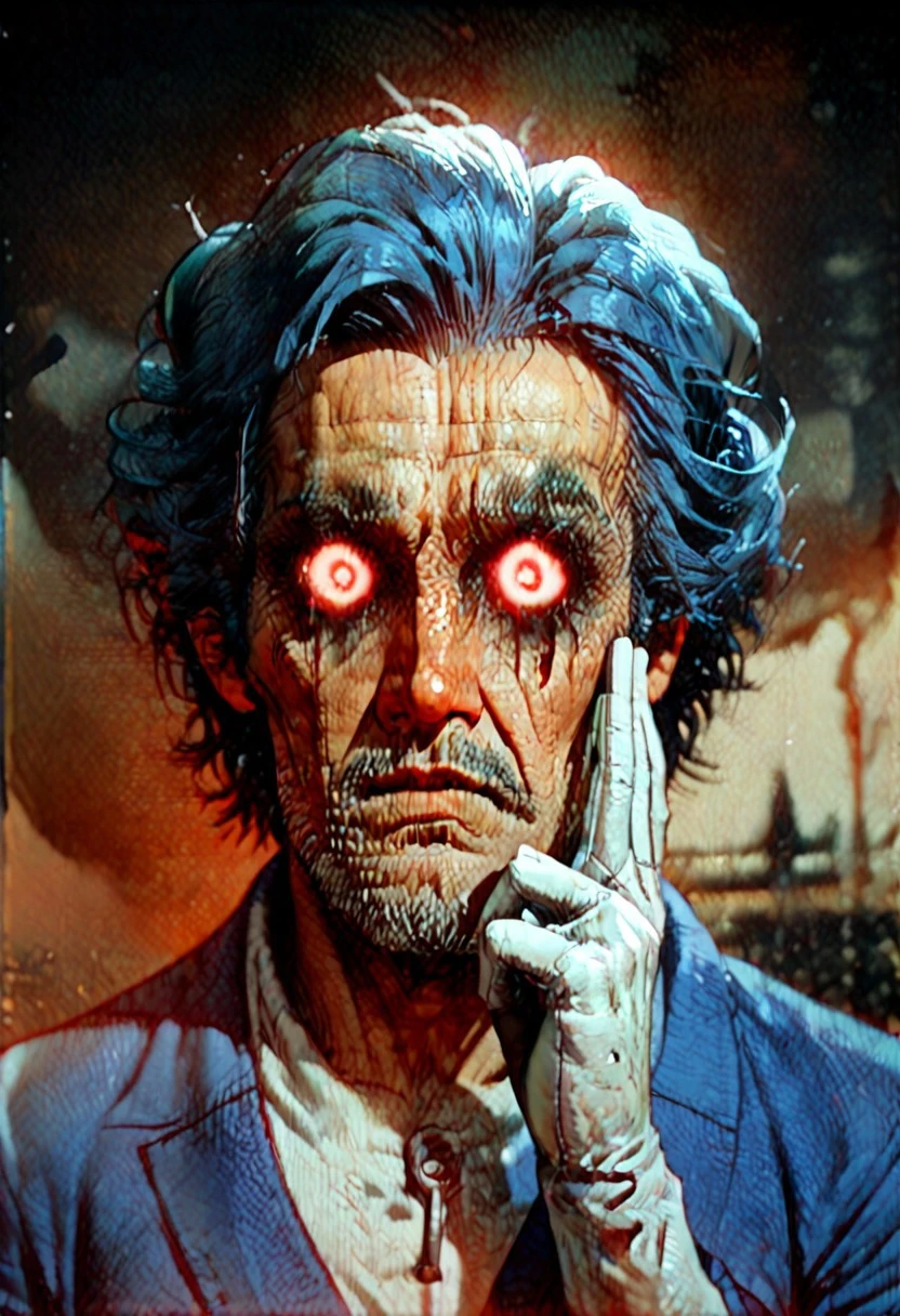 red eyes, white eyes, eye glow, black round shadow on eyes,,grainy texture resembling TV static noise.