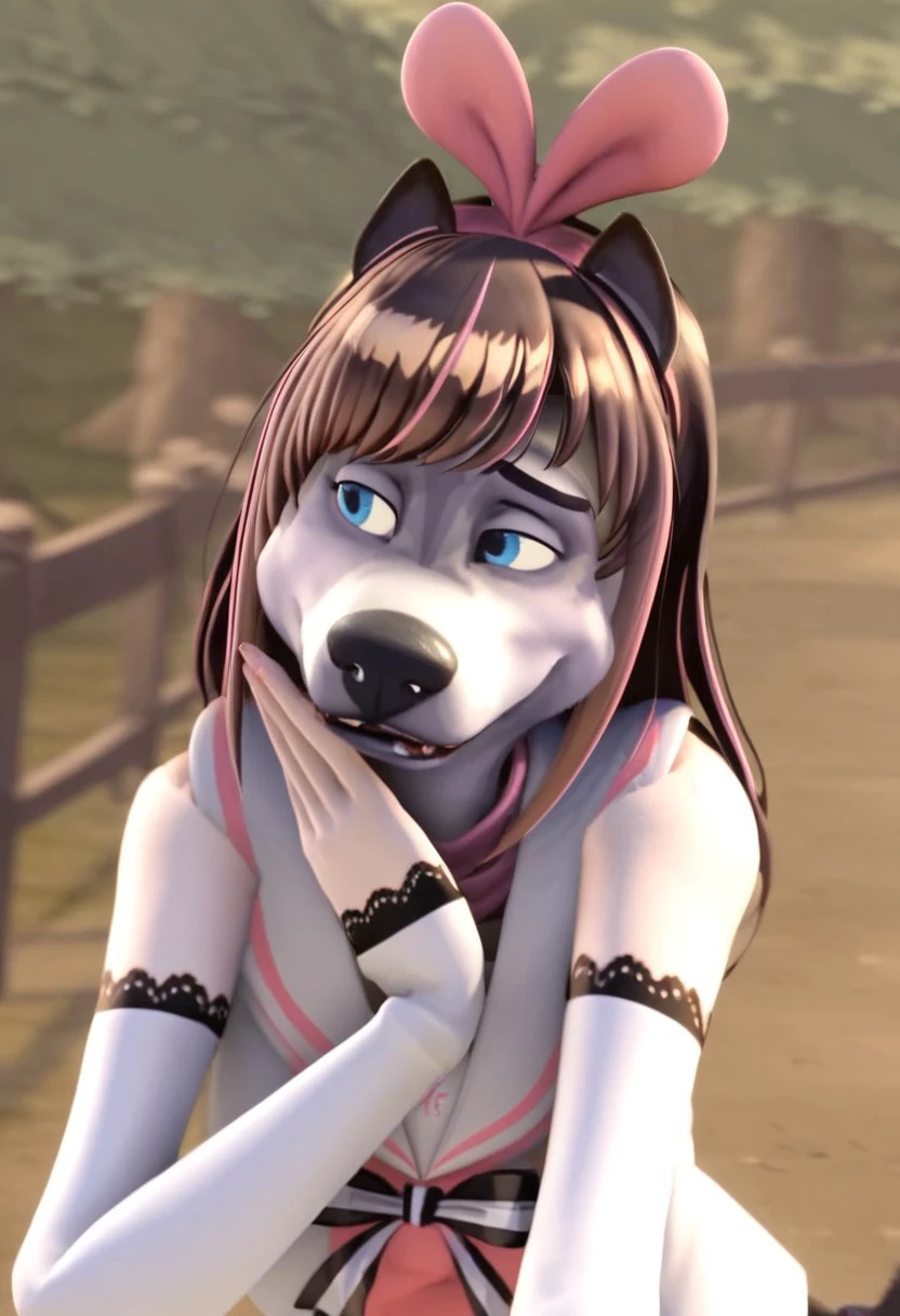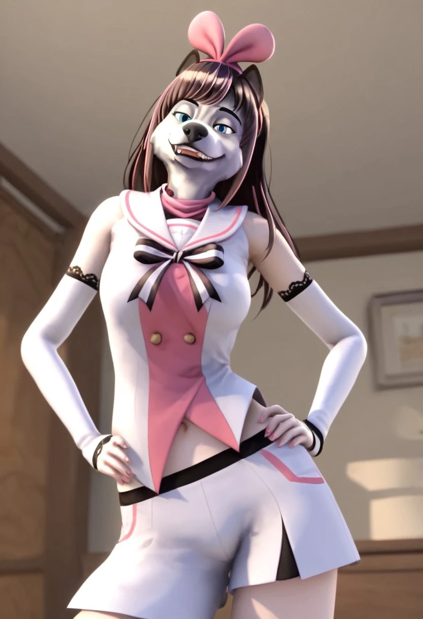 kizuna_ai_furry, 1girl, female furry, anthro, dog face, white and gray fur, small dog ears, long brown streaked hair (pink highlights and bangs), pink headband (heart-shaped), blue eyes, white and pink sailor suit (black and white striped ribbon), white arm sleeves (black lace), white short pants (pink highlights), white tigh highs (pink highlights and black lace),