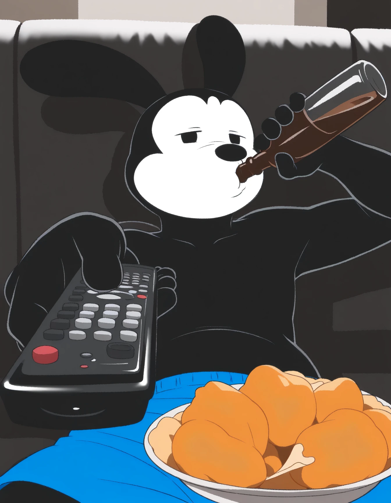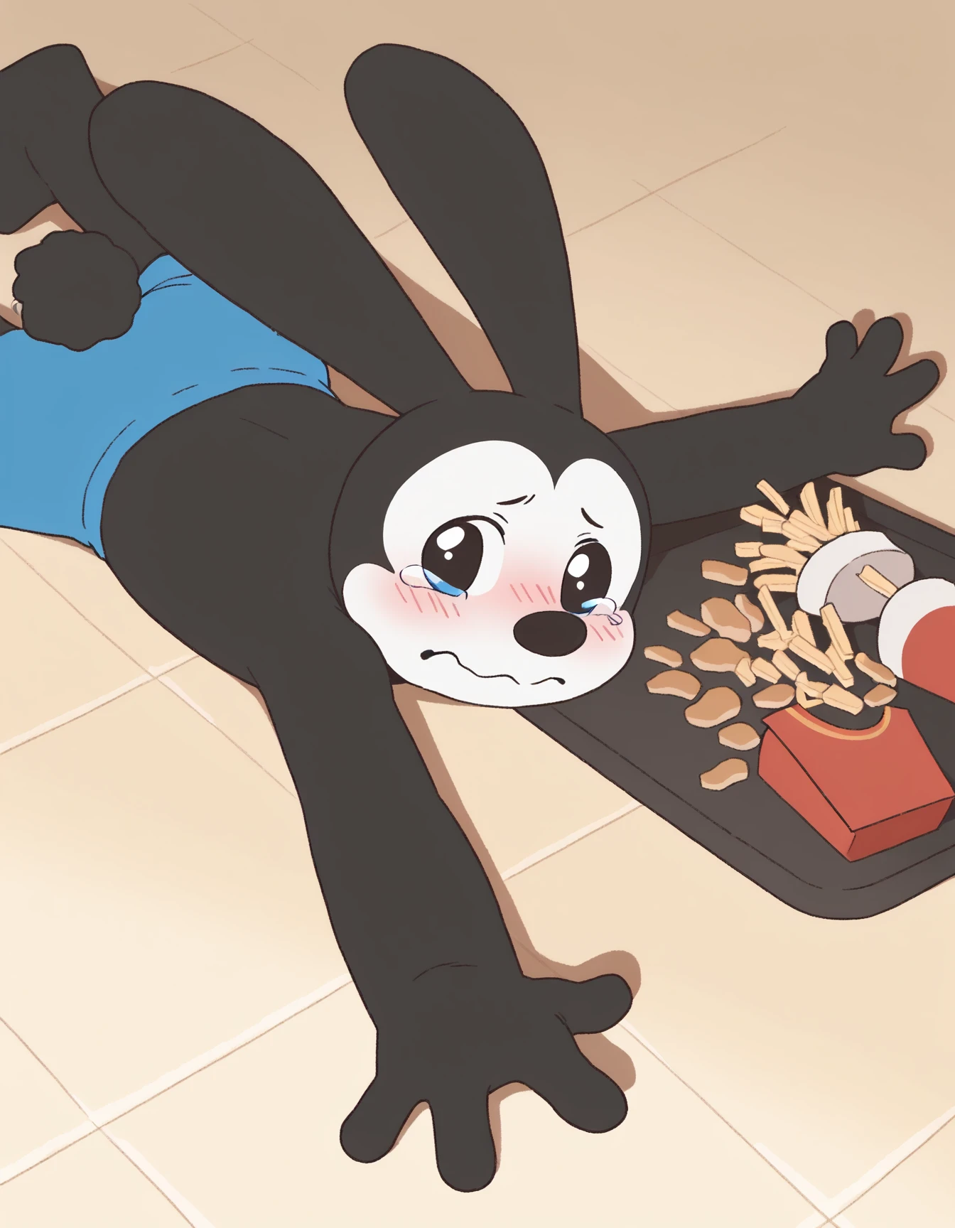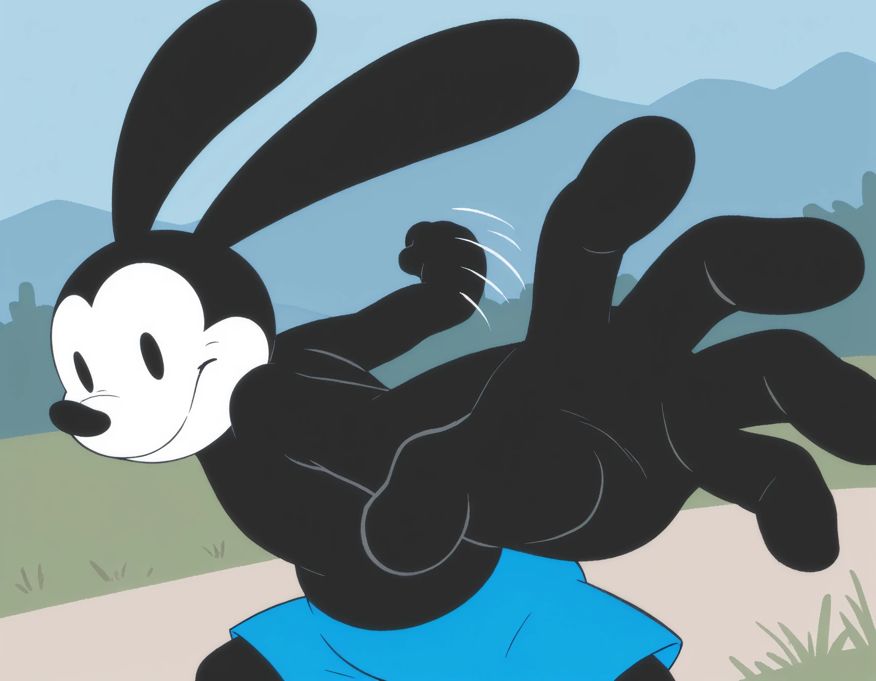 Promt: Oswald, cartoon, male, white face, blue shorts.