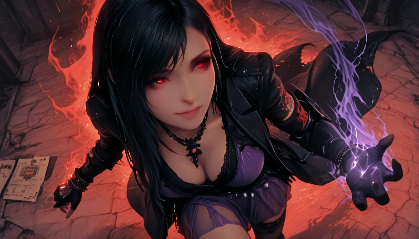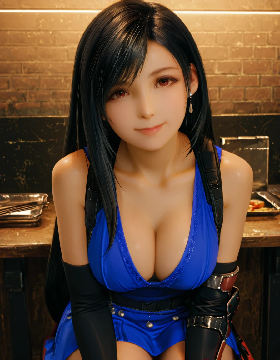 1girl, solo, tifalockhart-ff7-remake, tifalockhart, tifa lockhart, tifa, long black hair, brown eyes, gloves, blue dress, short dress, fingerless gloves, cleavage, ???????, large breastsFor a more expressive and atmospheric result, use dynamic prompts with descriptions for lighting, background, setting and focus.