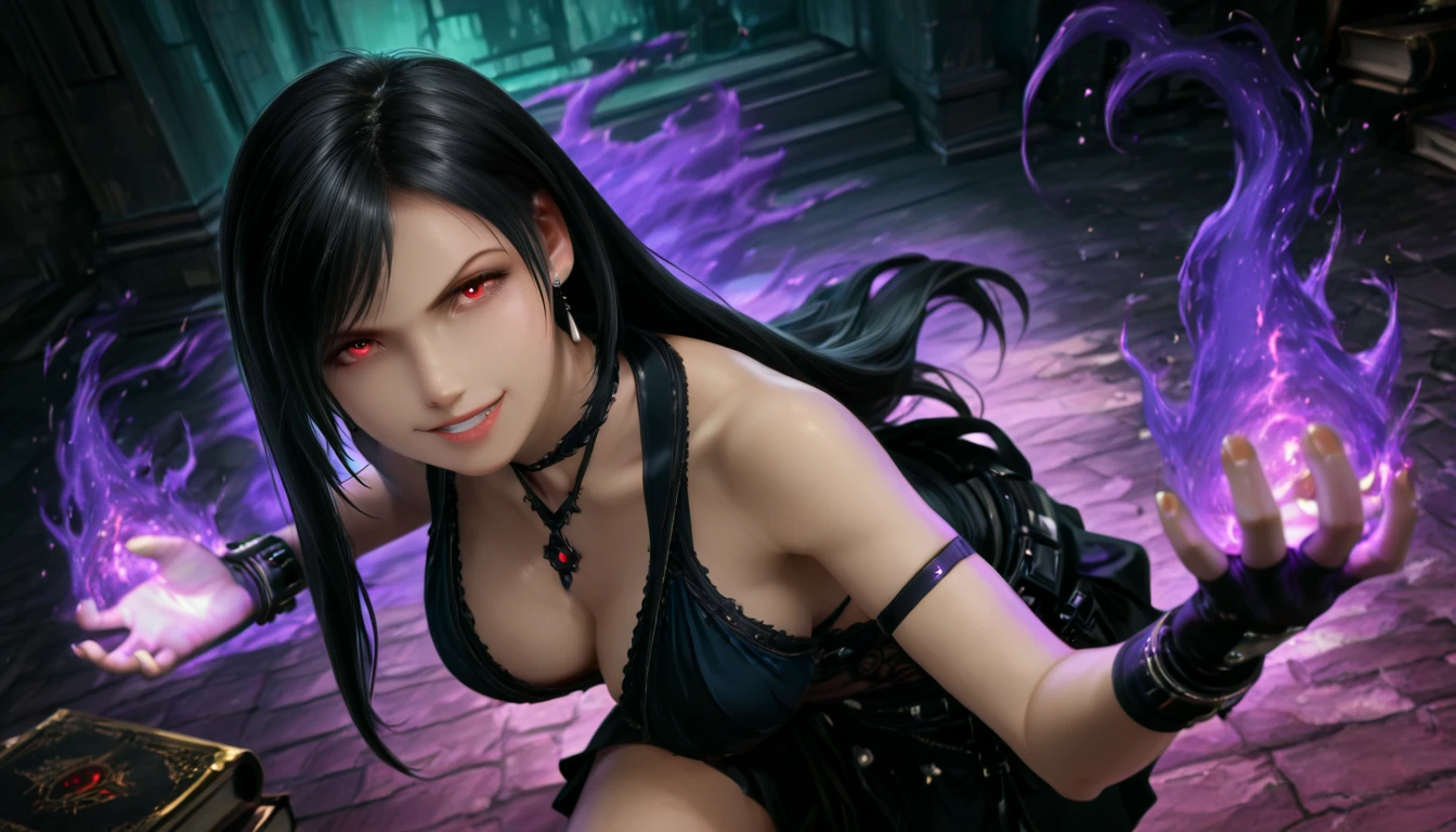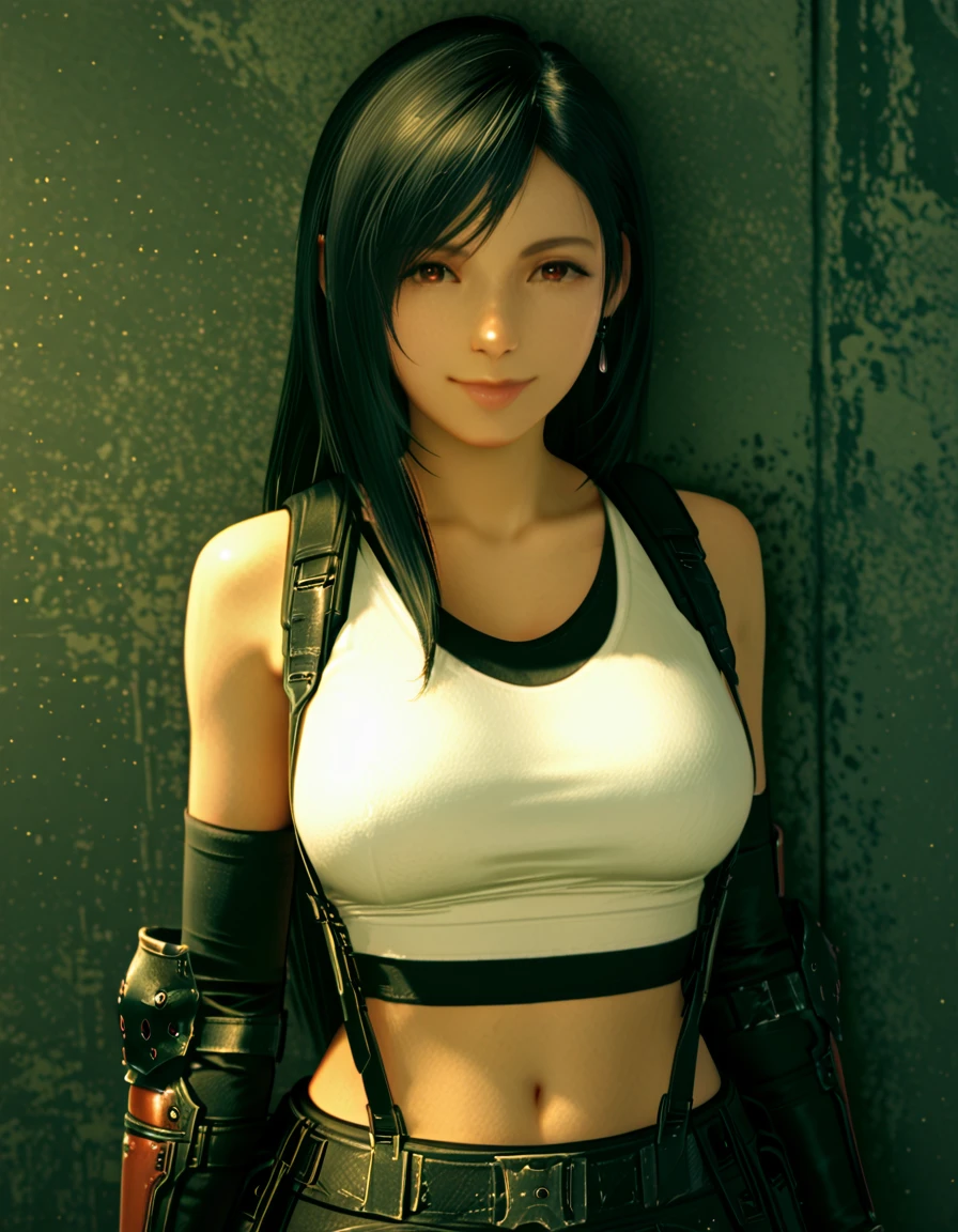 1girl, solo, tifalockhart-ff7-remake with long hair, black hair, brown eyes, dangle earringsPrompt: Tifa – Standard Outfit: