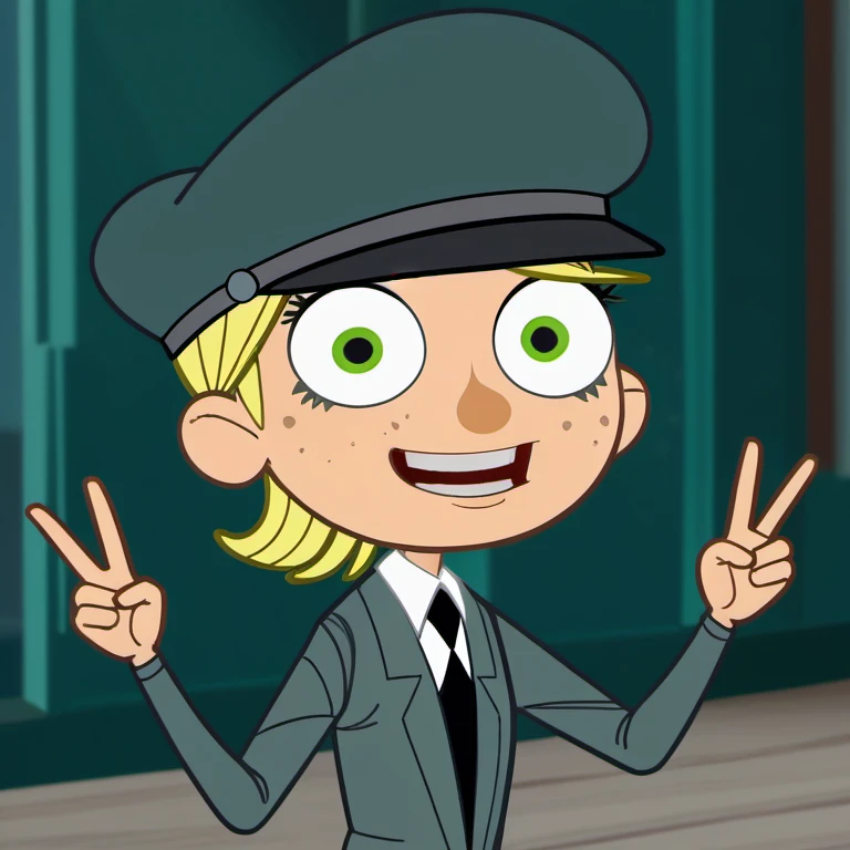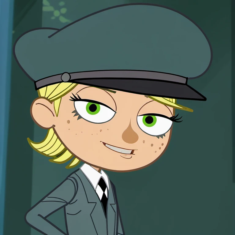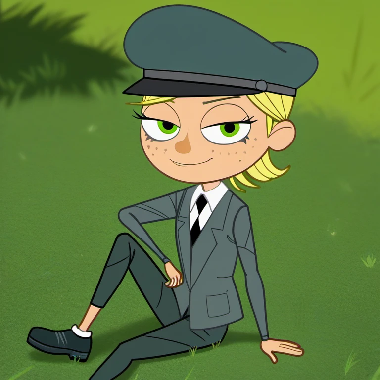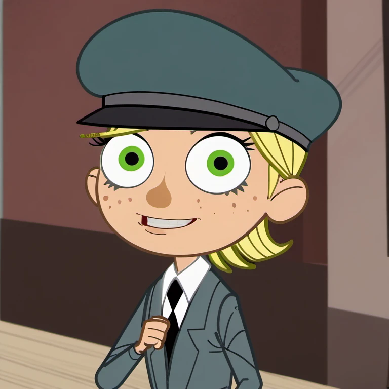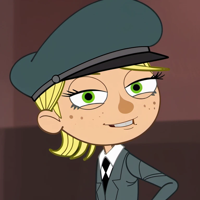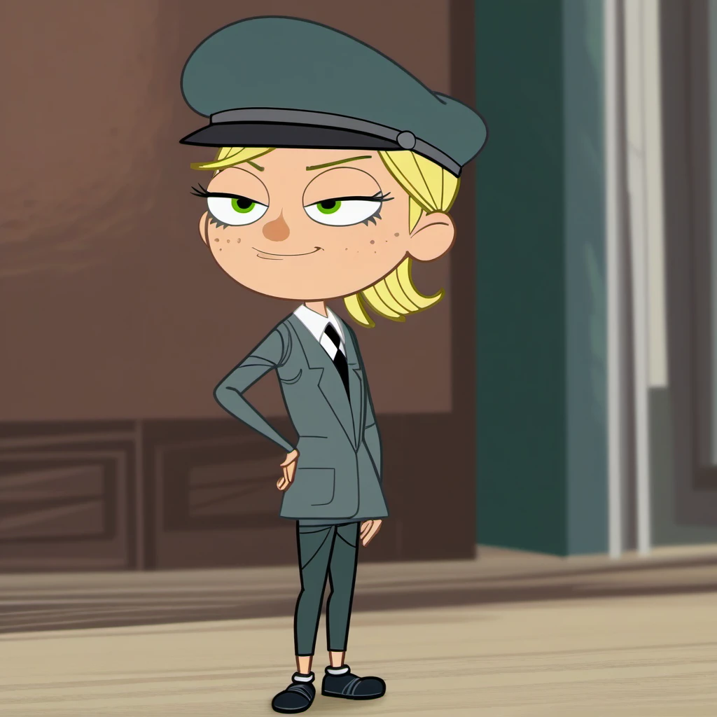 solo, 1girl, ashnfh1, freckles, blonde hair, green eyes, style parody, necktie, uniform, jacket, peaked cap, black necktie, pants, shoes, <lora:ashnfh1:1>