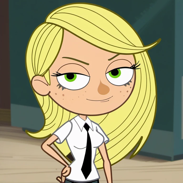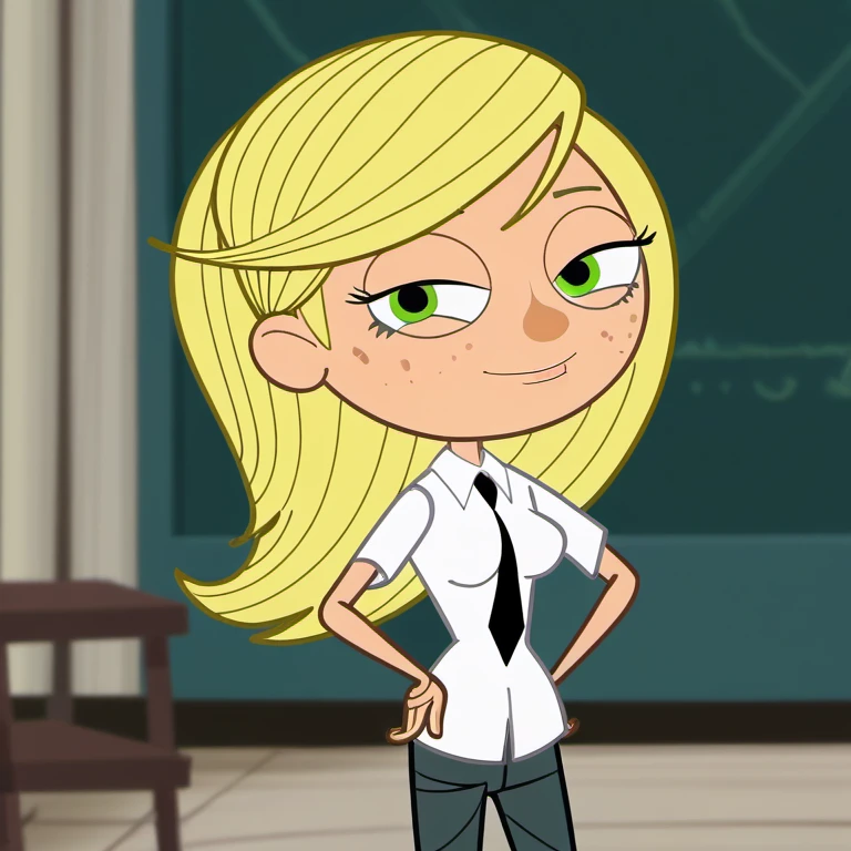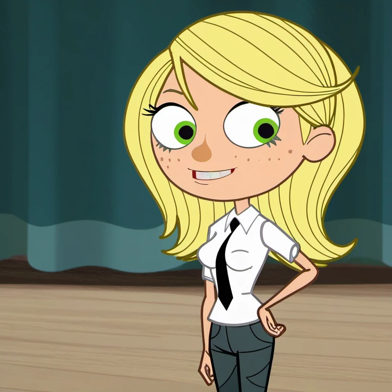 1girl, solo, ashnfh1, blonde hair, long hair, green eyes, freckles, shirt, pants, white shirt, medium breasts, <lora:ashnfh1:1>