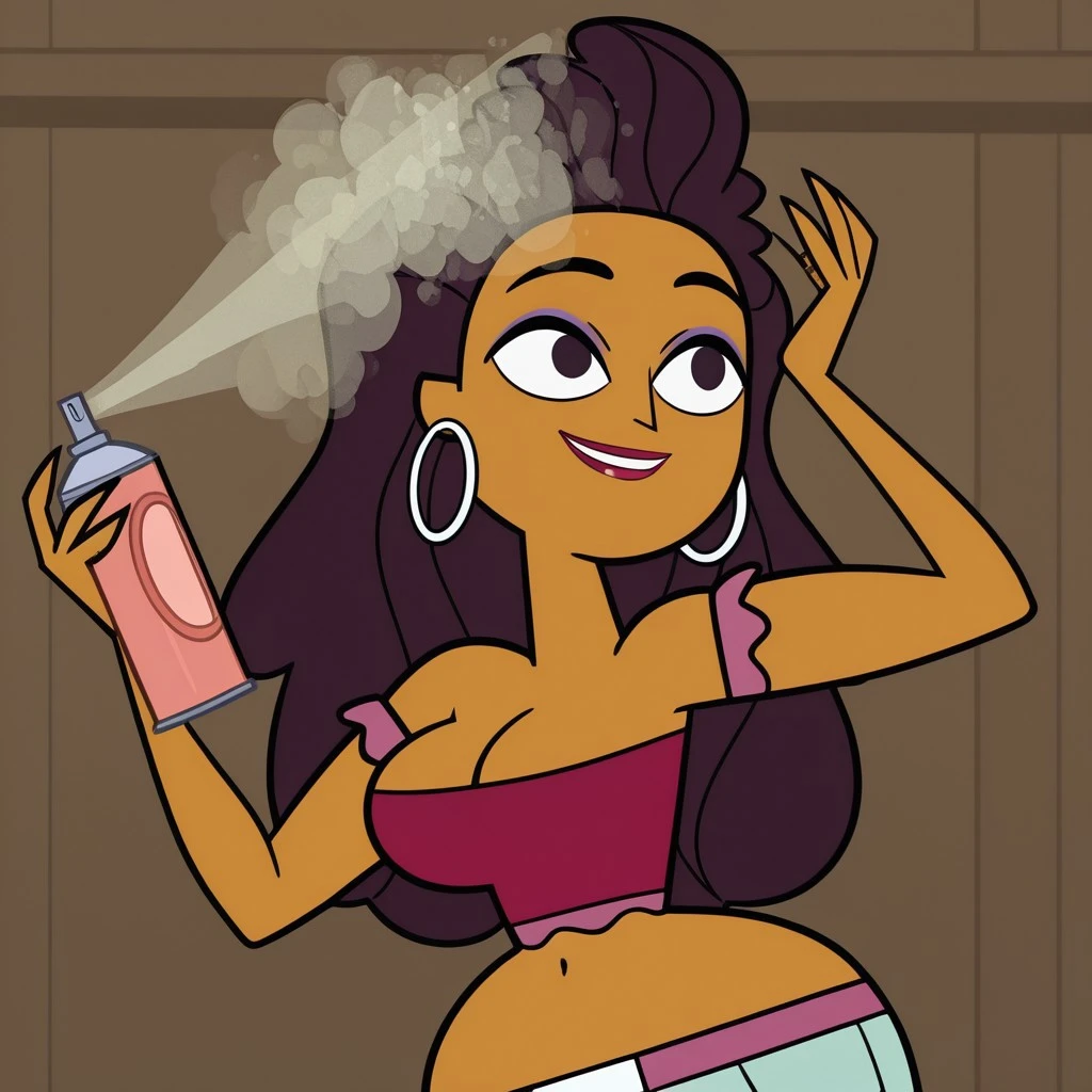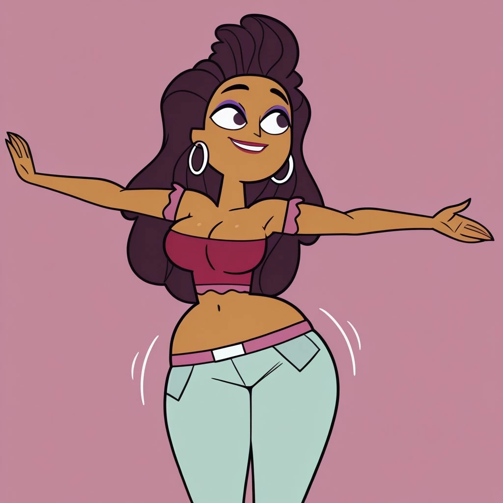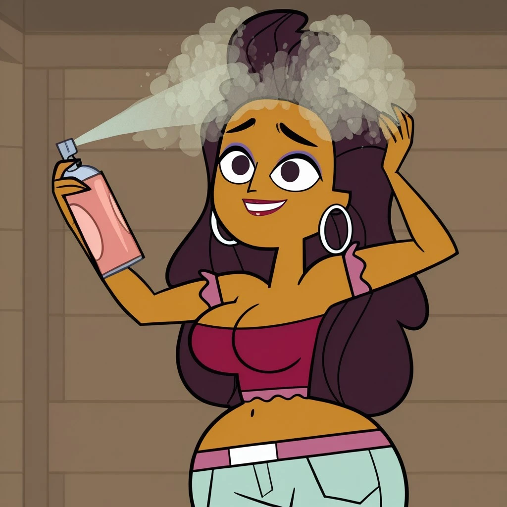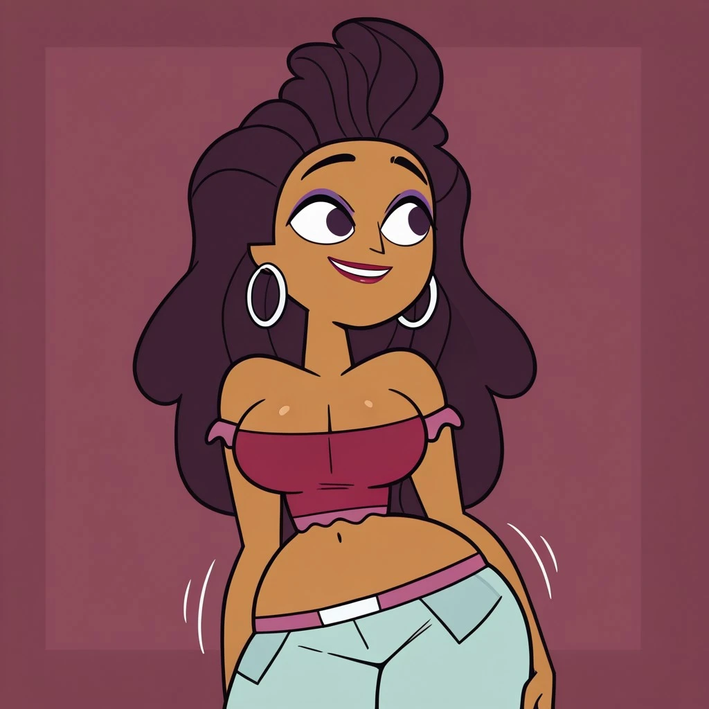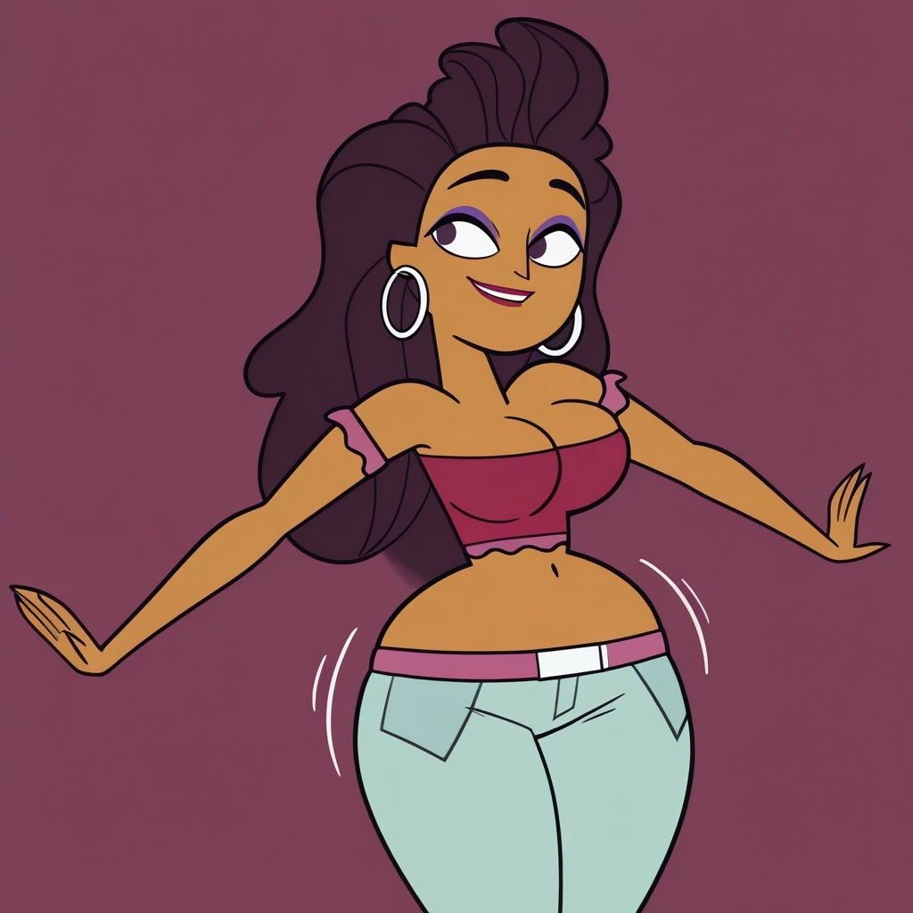 anne maria tdroti, tanned skin, voluminous hair, long hair, maroon hair, white hoop earrings, lavender eye shadow, maroon eyes, lips, red-violet lipstick, large breasts, wide hips