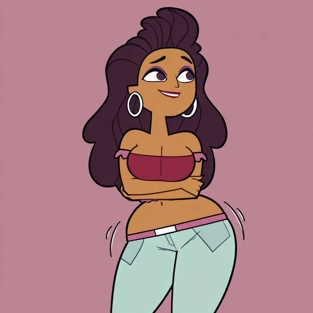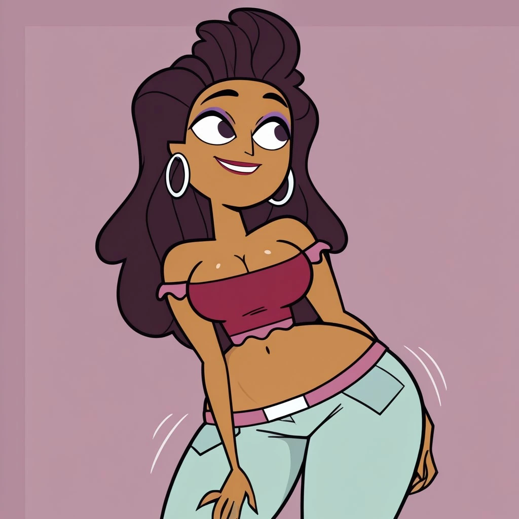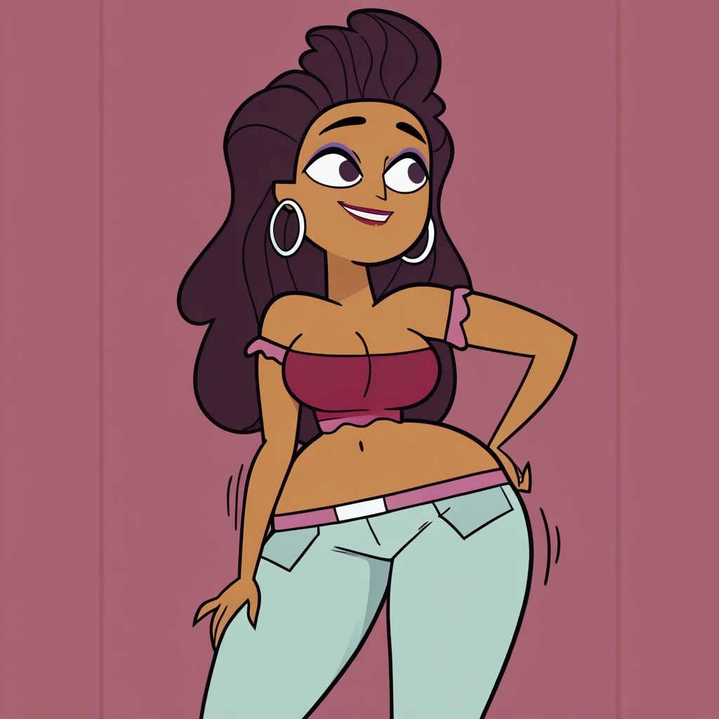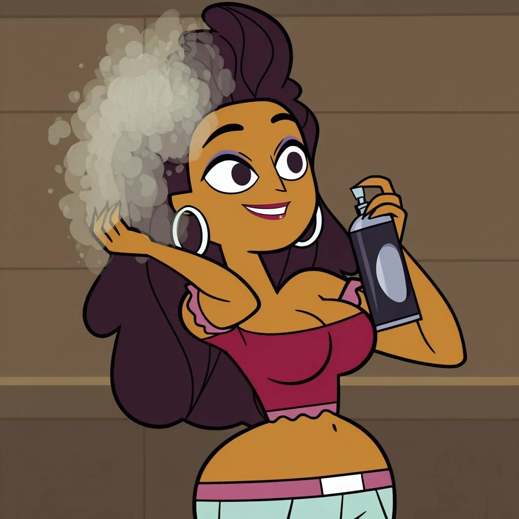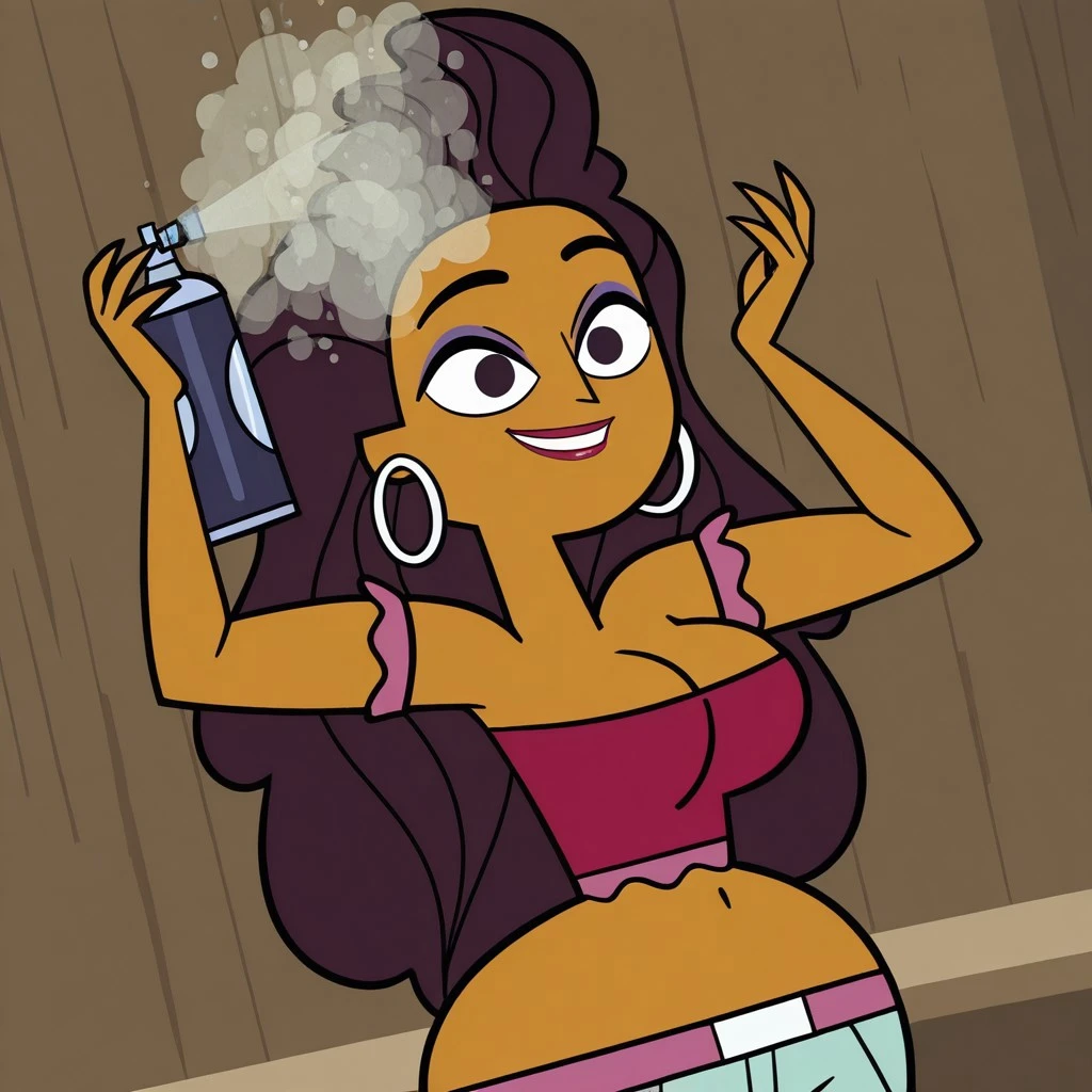 anne maria tdroti, tanned skin, voluminous hair, long hair, maroon hair, white hoop earrings, lavender eye shadow, maroon eyes, lips, red-violet lipstick, large breasts, wide hips