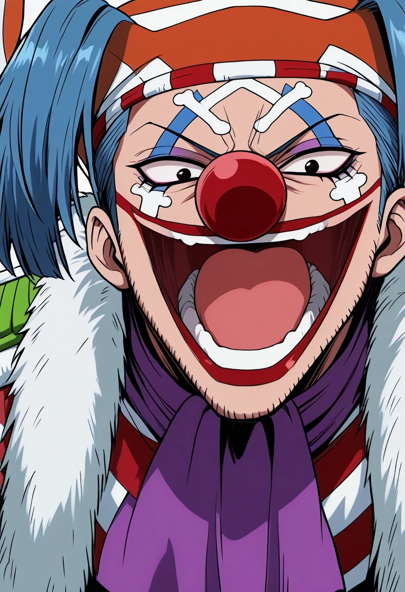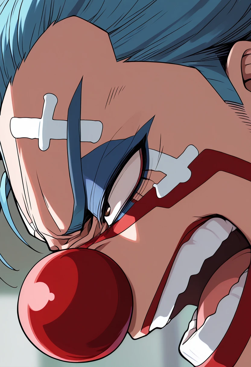 buggy, 1boy, blue hair, red nose, clown nose, makeup, red lips, facepaint, clown, facial hair, stubble