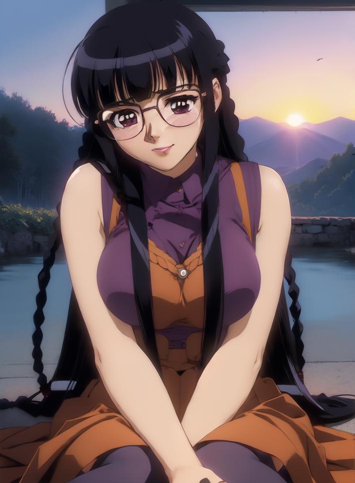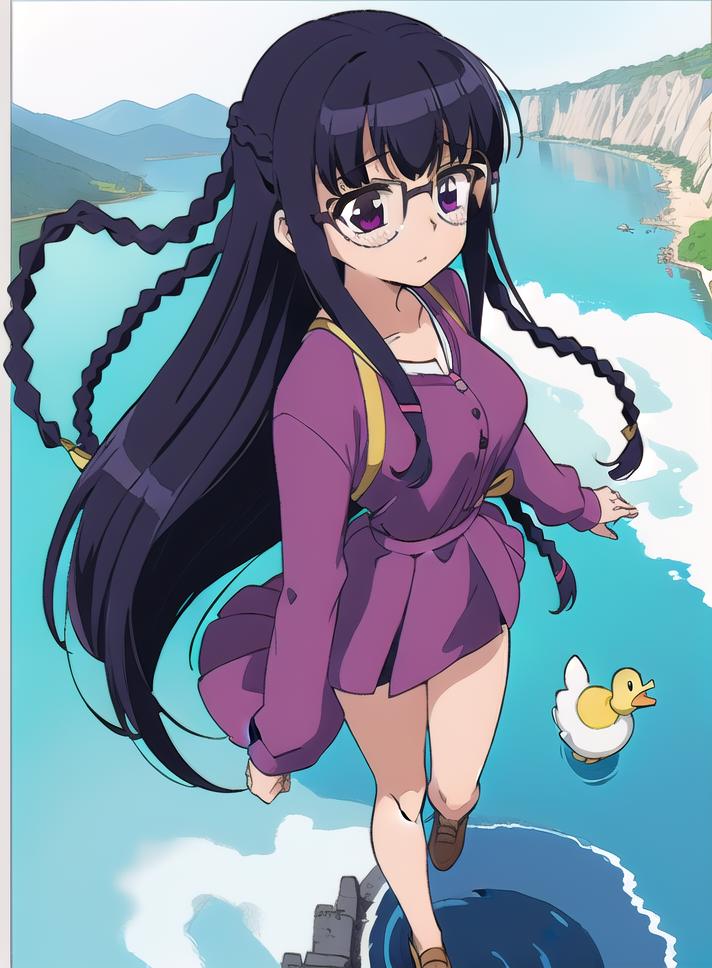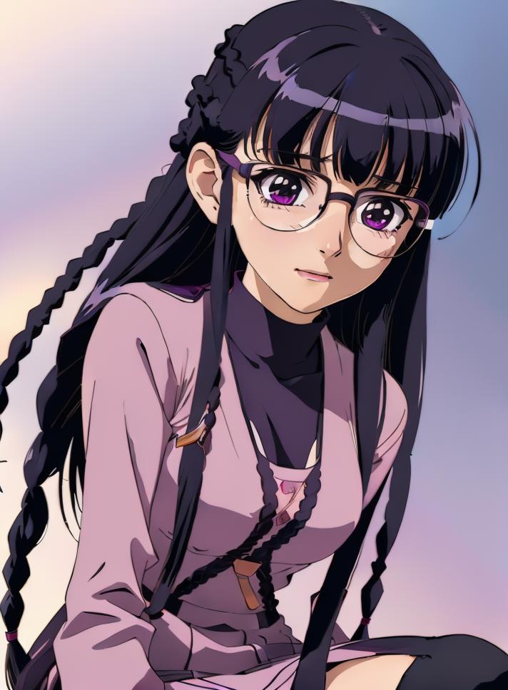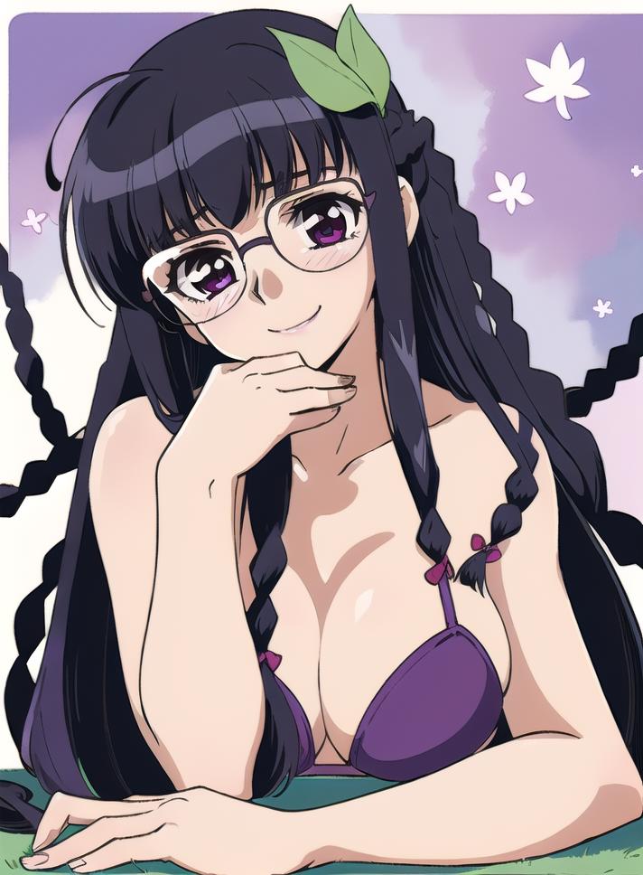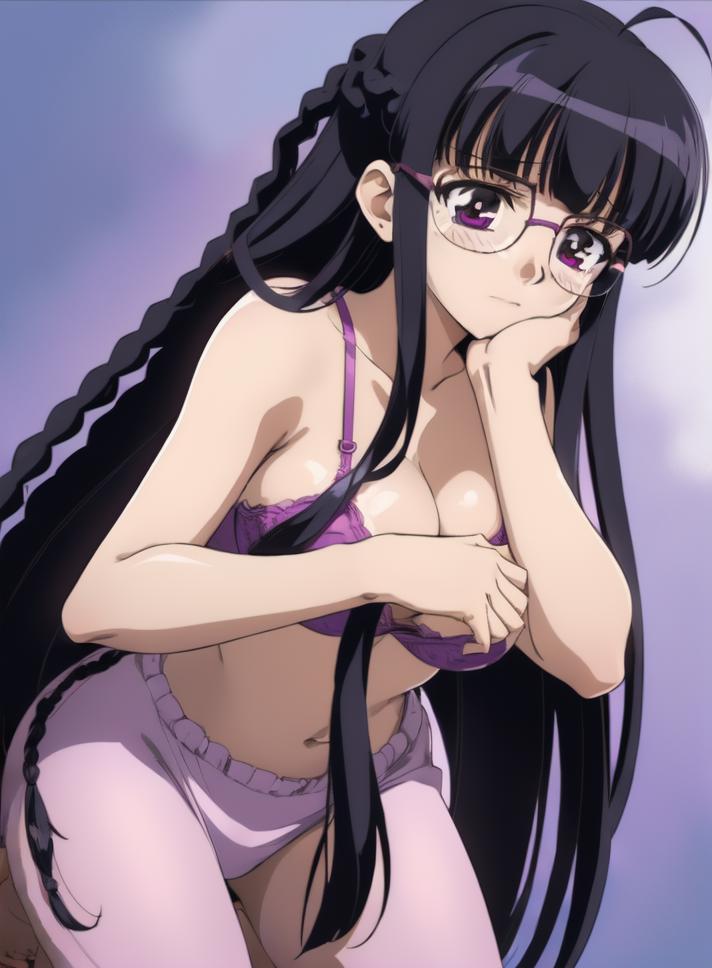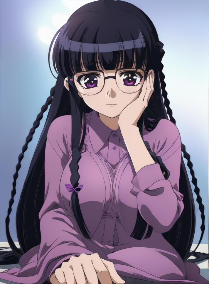 Appearance: 1girl, solo, long hair, glasses, braid, purple eyes, twin braids, bangs, blunt bangs, black hair, large breast