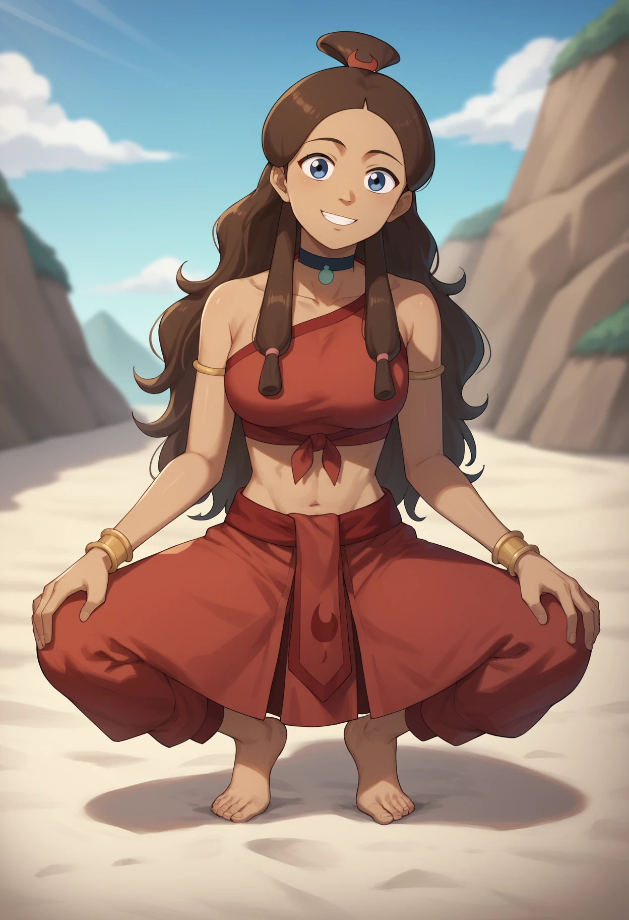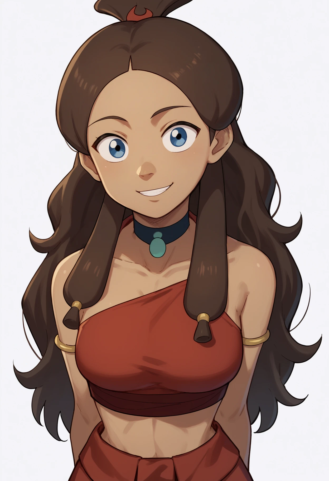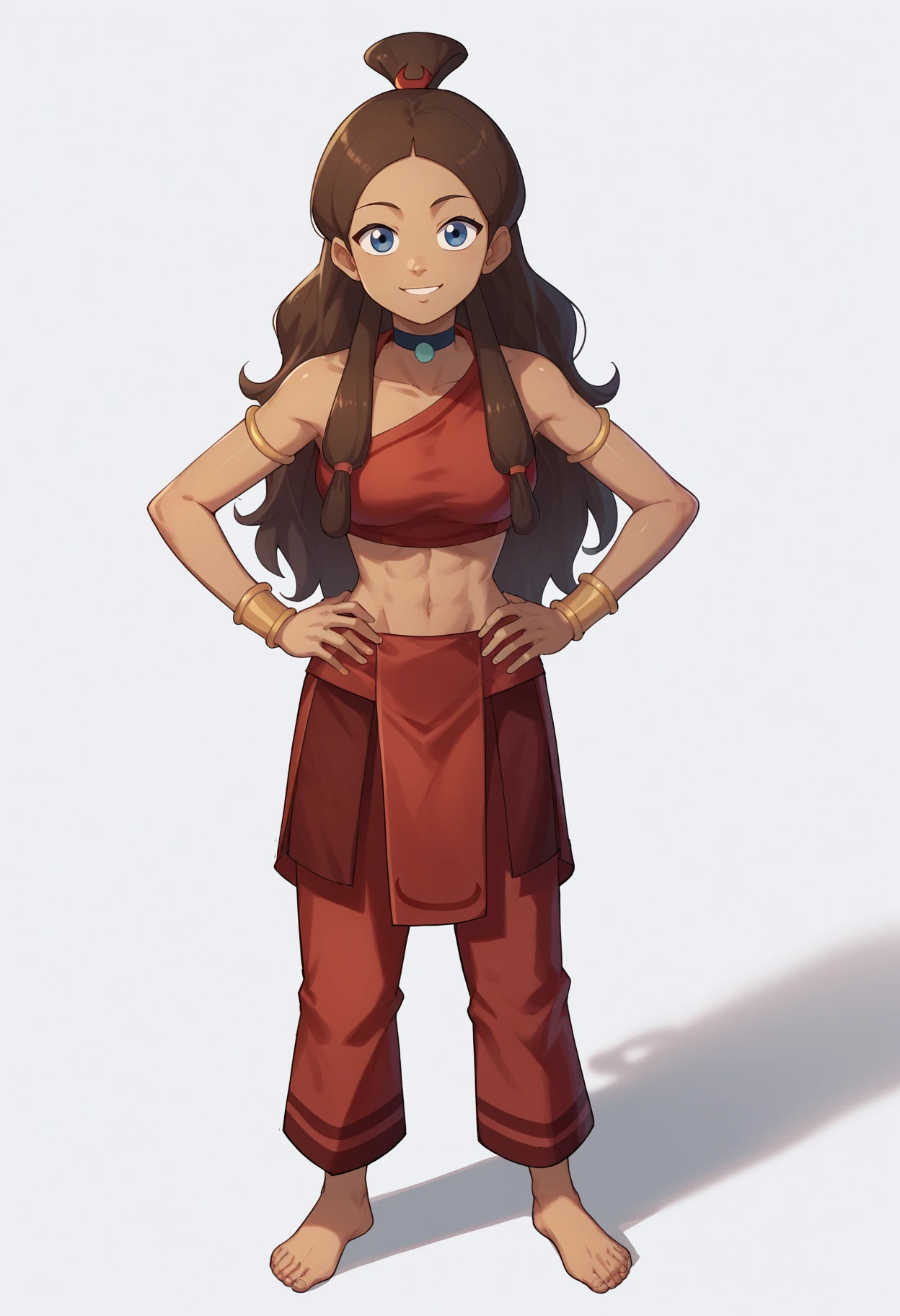 Fire Nation outfit prompts : fnkatara, long hair, topknot, armlet, bare shoulders, choker, dark skin, red crop top, red skirt, barefoot, red pants, bracelet