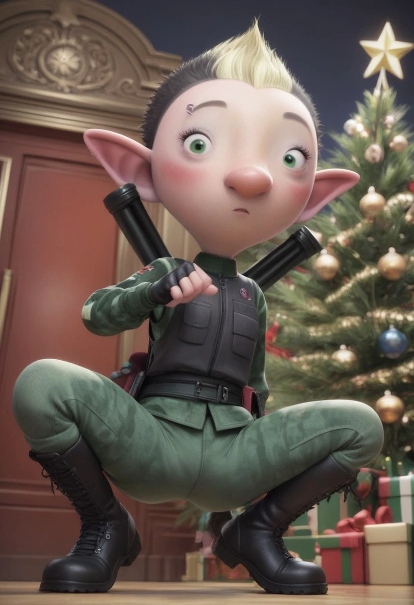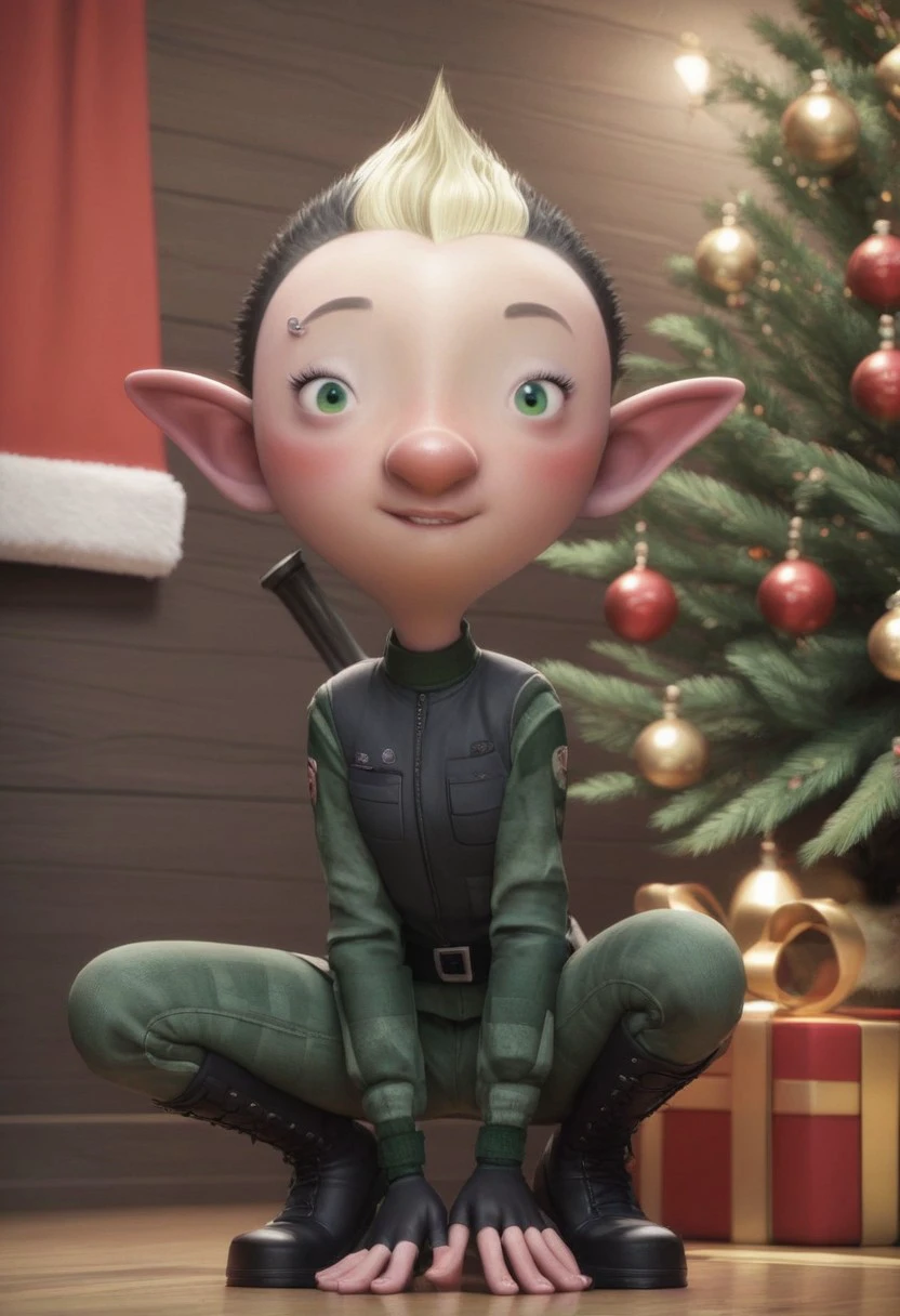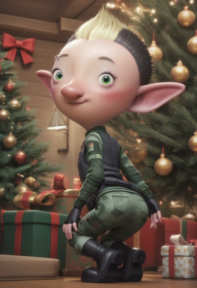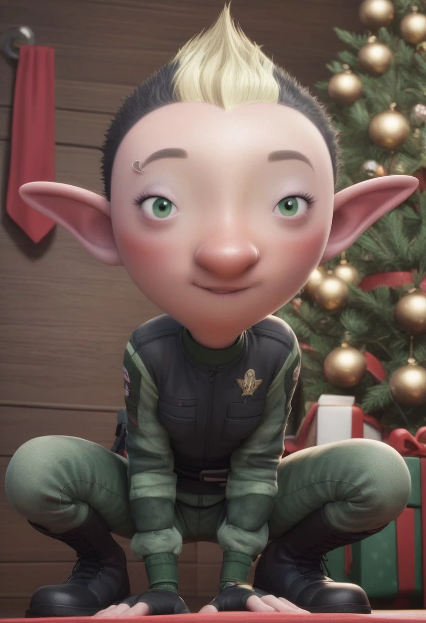1girl, elf, female elf, petite, black short hair, blond mohawk, pointy ears, elf ears, fingerless gloves, miliary uniform, black boots, piercing on right eyebrow, green eyes, small eyes, big nose, blush