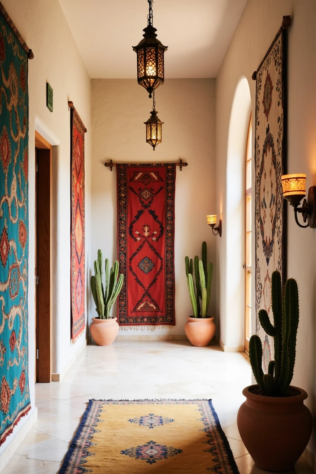 9. Moroccan - style interior design, hallway adorned with wall tapestries, floor - level lighting, and potted cacti.