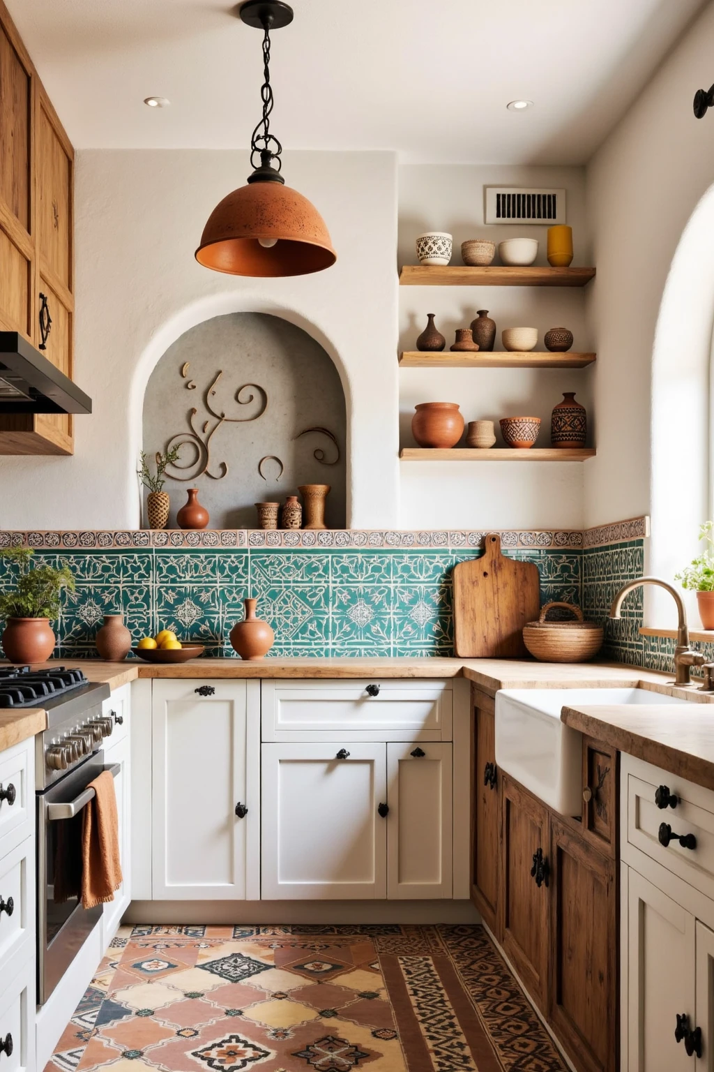 7. Moroccan - style interior design, kitchen with open shelving, hand - painted tiles, and a rustic wooden countertop.