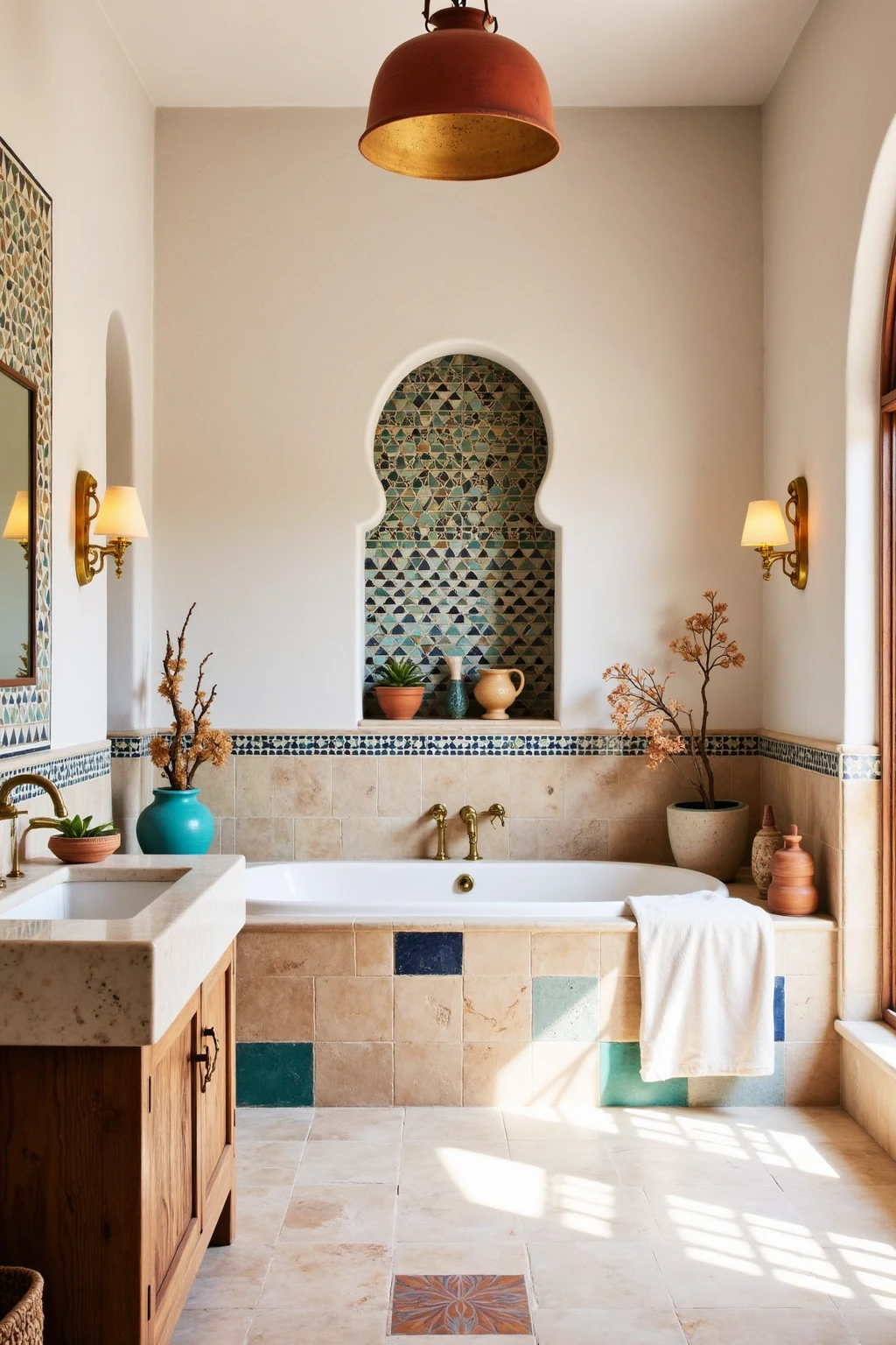 3. Moroccan - style interior design, bathroom with a sunken tub, tiled walls in geometric patterns, and brass fixtures.