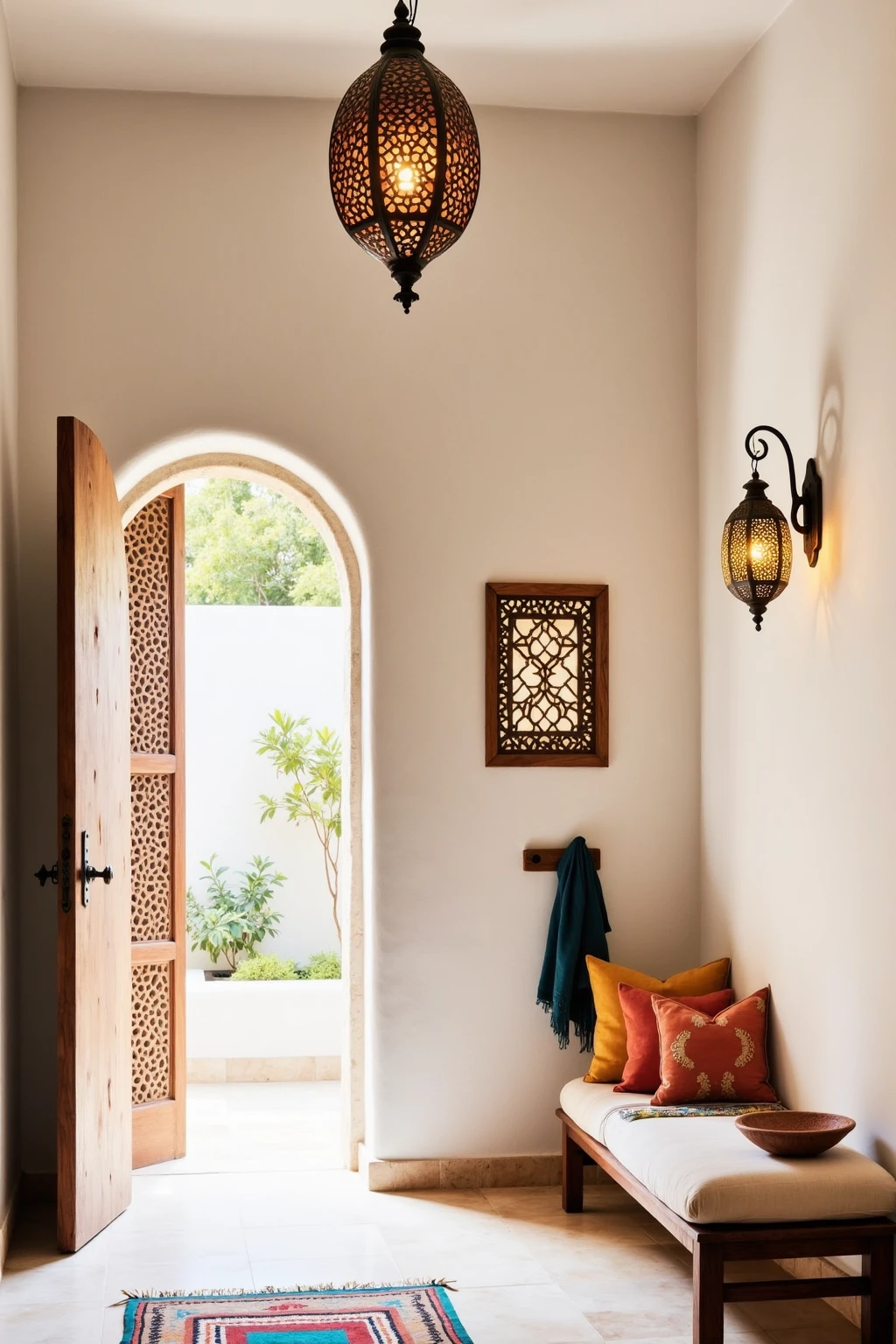 5. Moroccan - style interior design, entryway with an arched doorway, a small bench with embroidery, and wall - mounted lanterns.