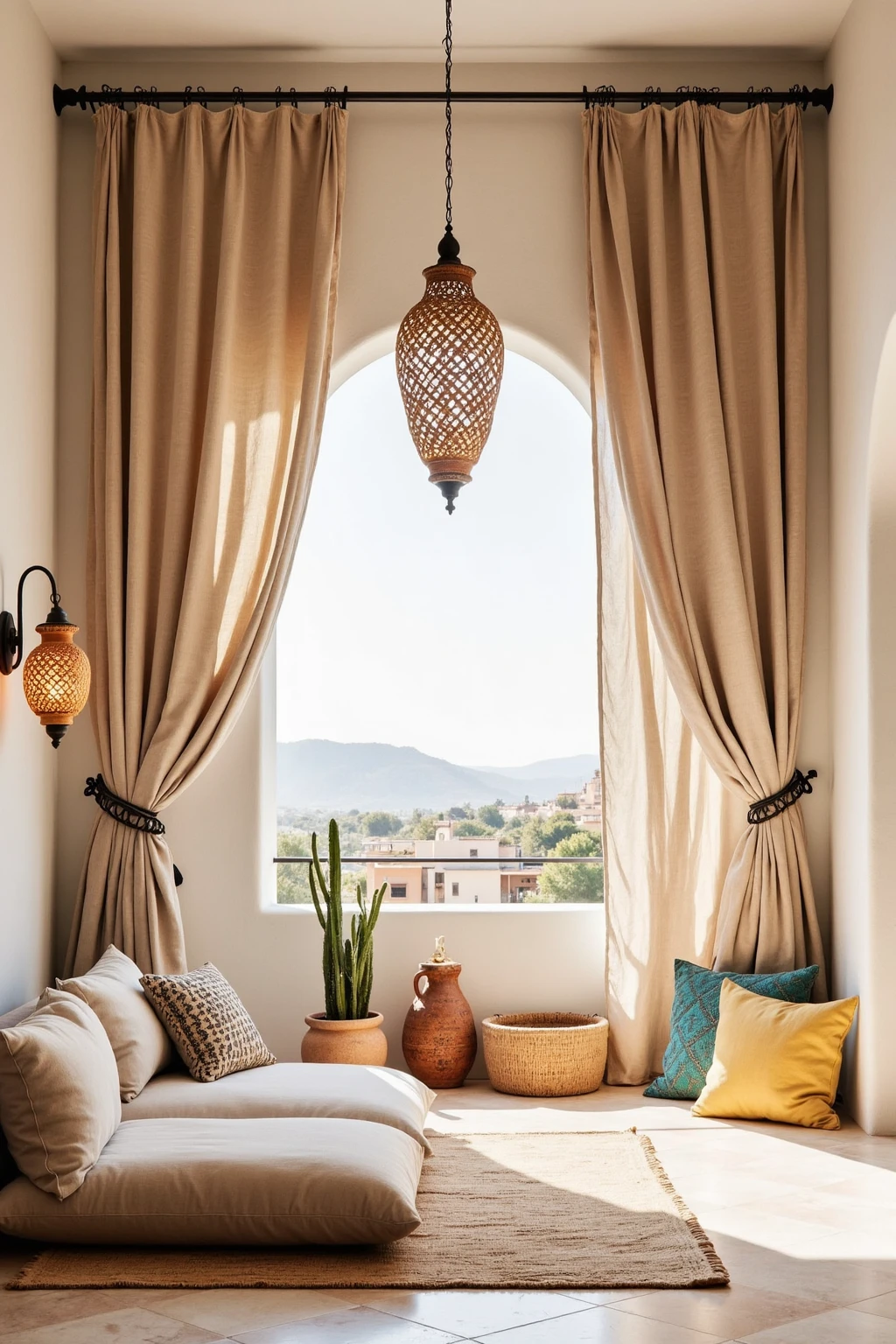 10. Moroccan - style interior design, rooftop lounge with floor cushions, sheer curtains, and a view of the sky through Moroccan - inspired arches.