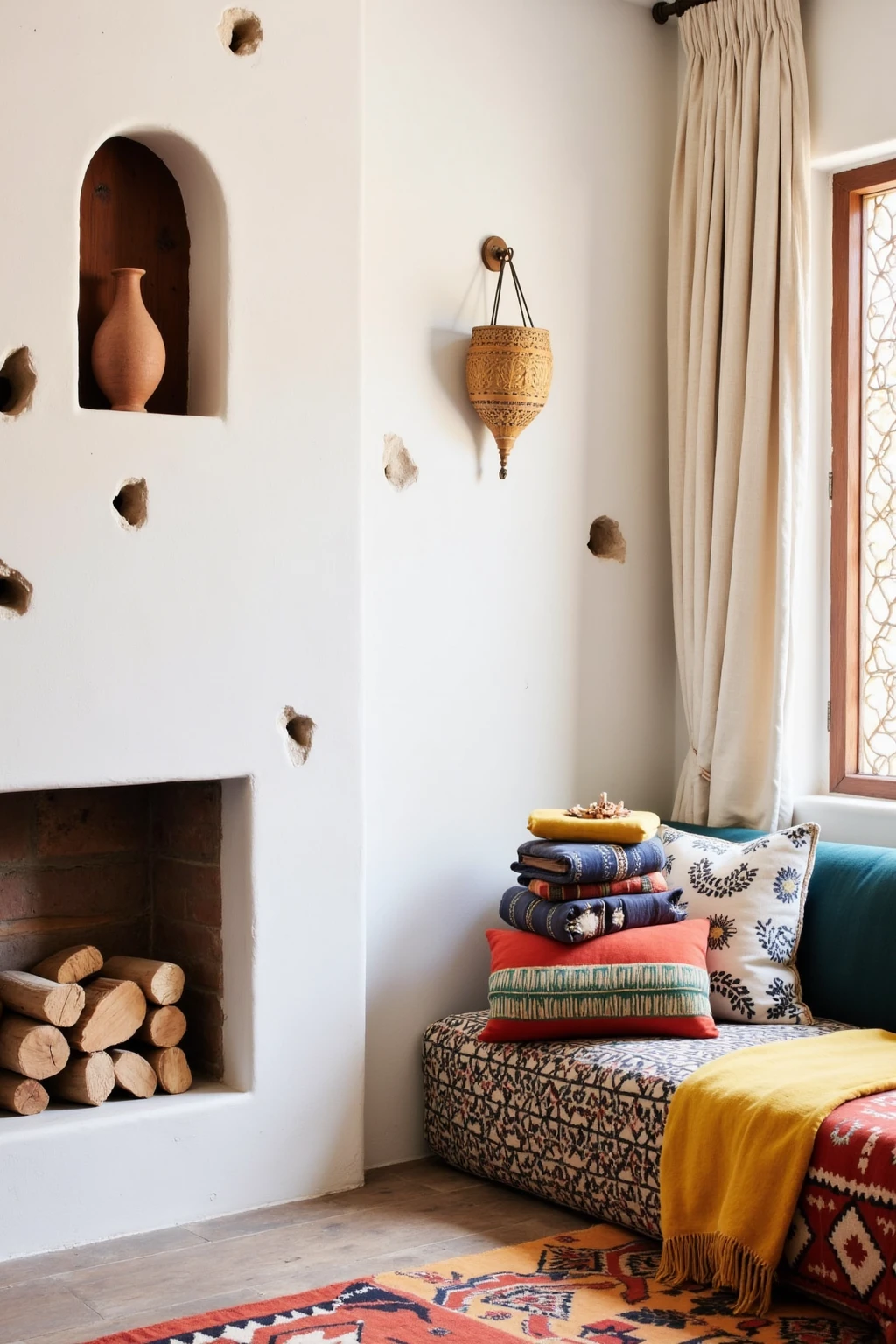 8. Moroccan - style interior design, a cozy corner with a fireplace, a stack of patterned ottomans, and a wall niche for decor.