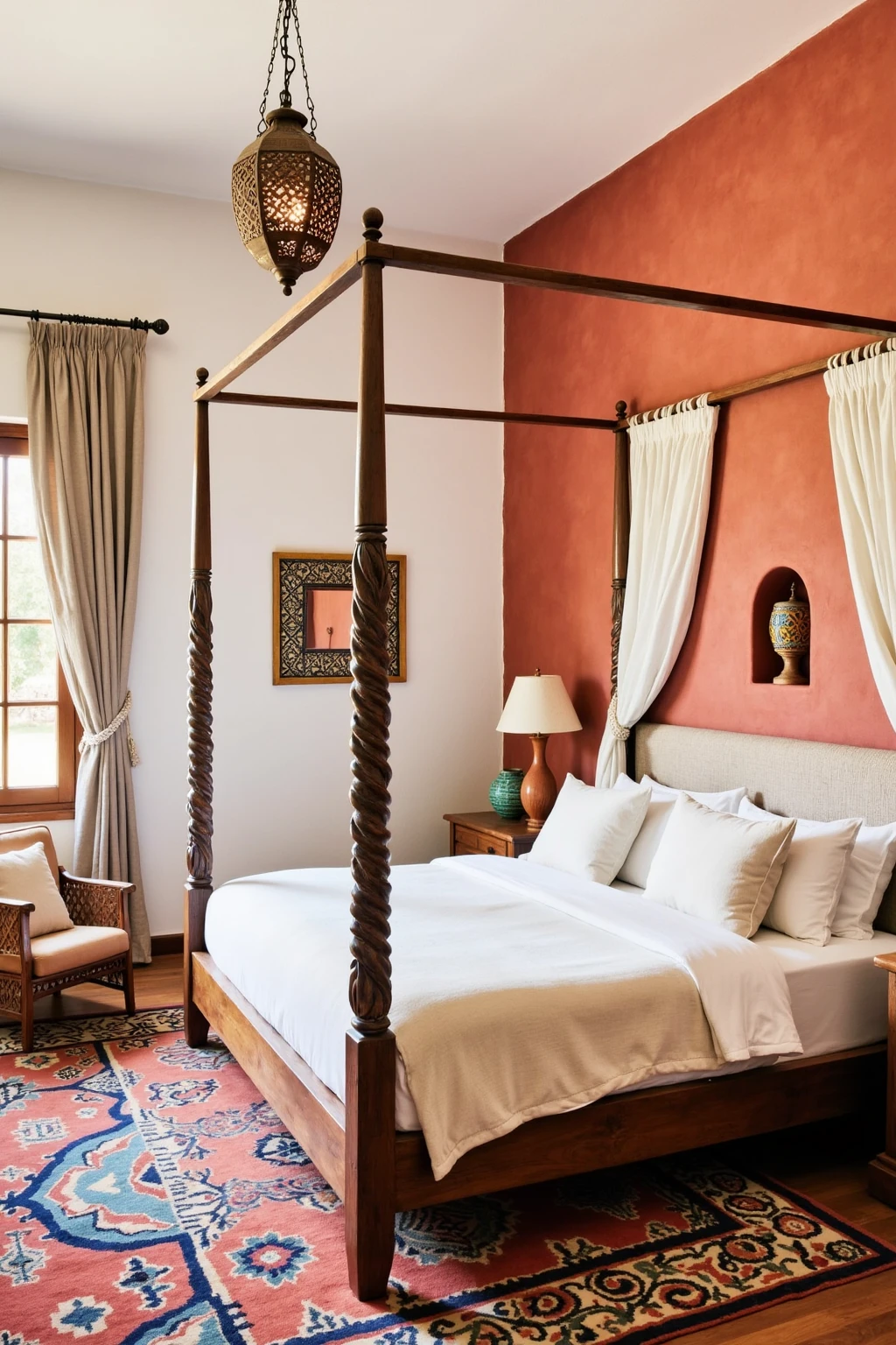 2. Moroccan - style interior design, bedroom featuring a canopy bed, patterned rugs, and hand - carved wooden nightstands.