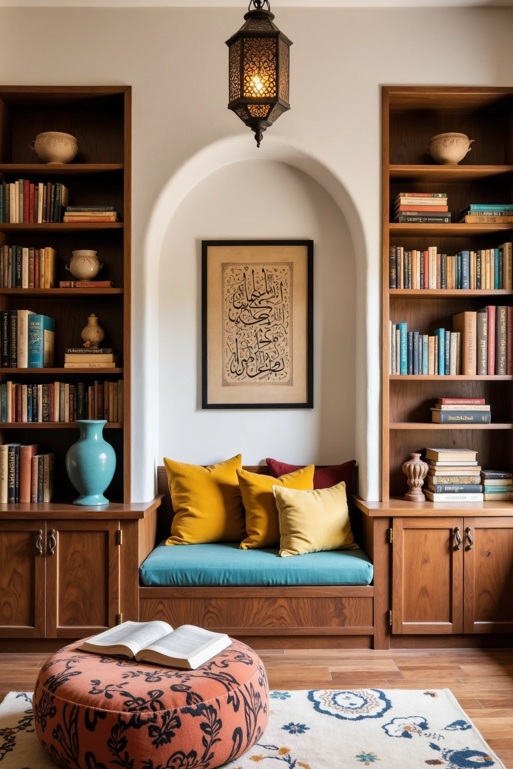 6. Moroccan - style interior design, study with built - in bookshelves, a cozy reading nook with a pouf, and framed Arabic calligraphy.