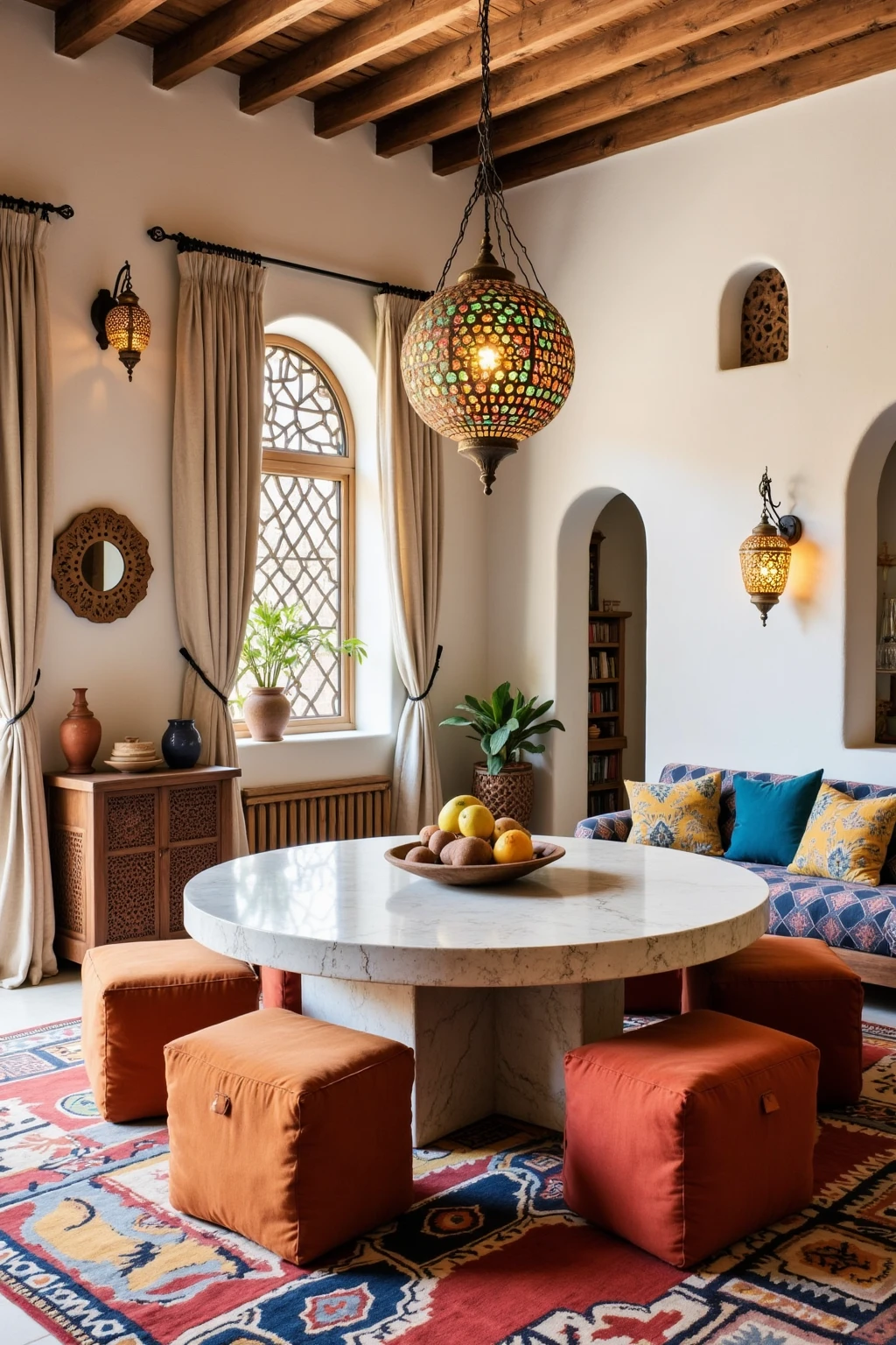 4. Moroccan - style interior design, dining area with a large, round table, colorful cushions, and hanging mosaic lights.