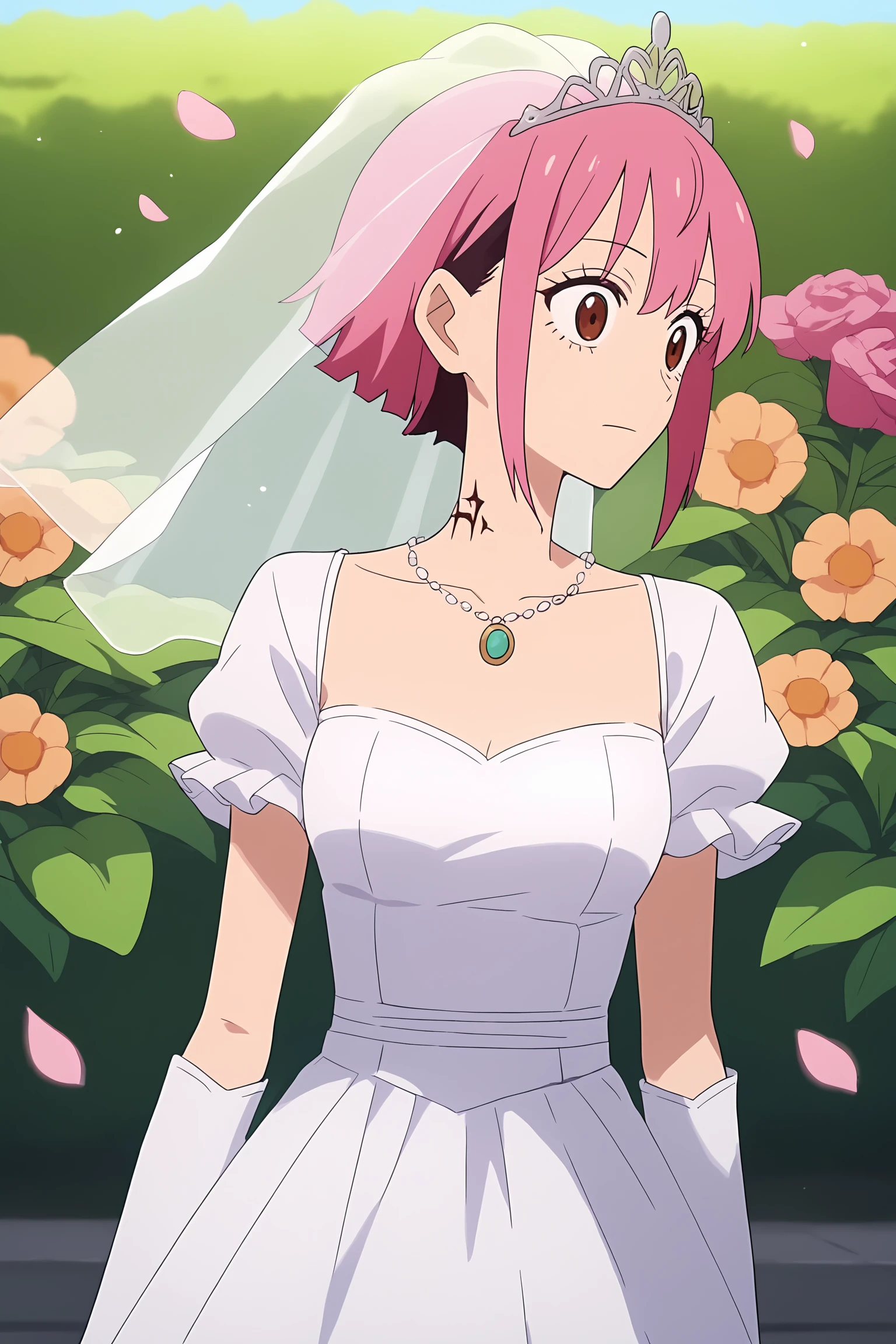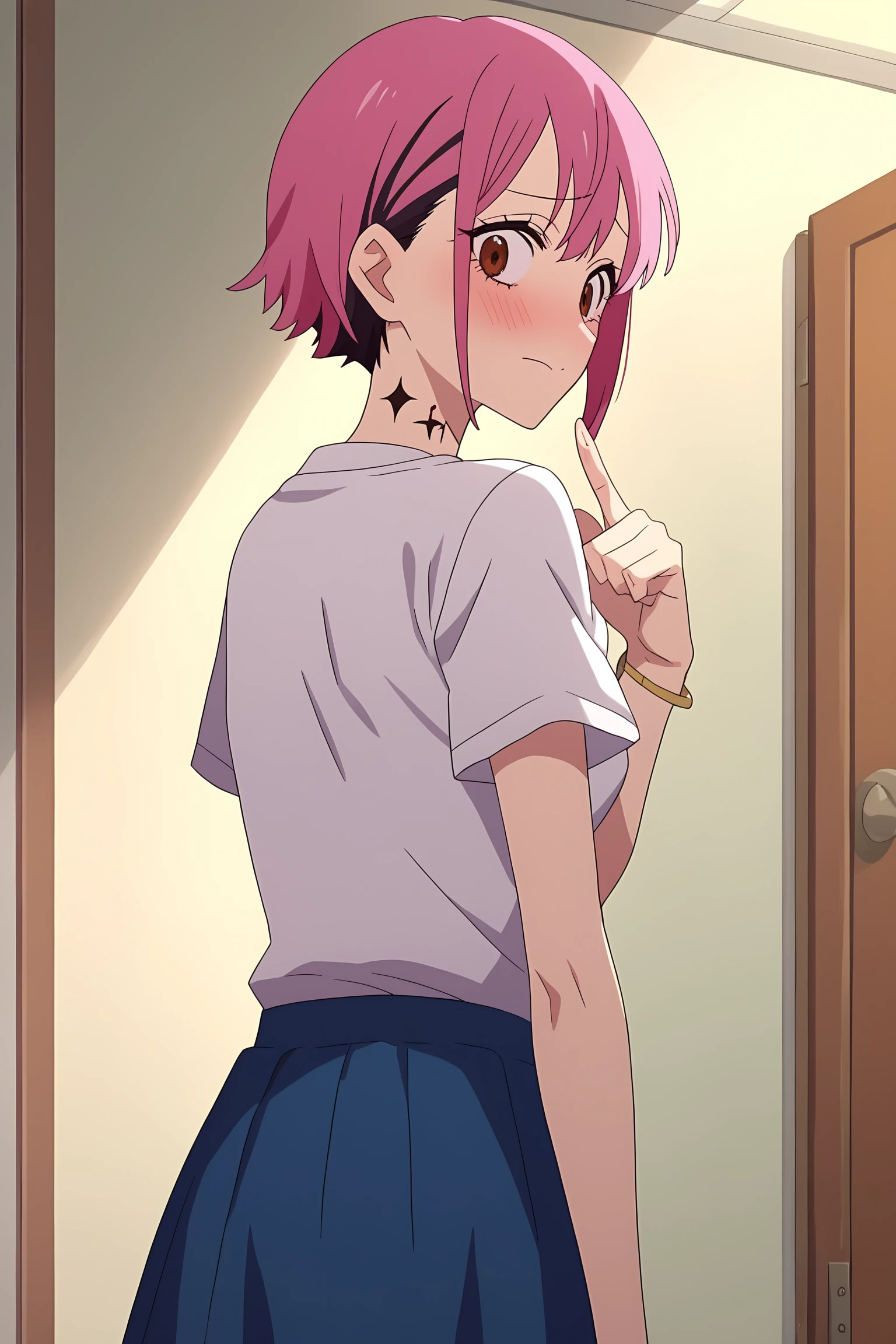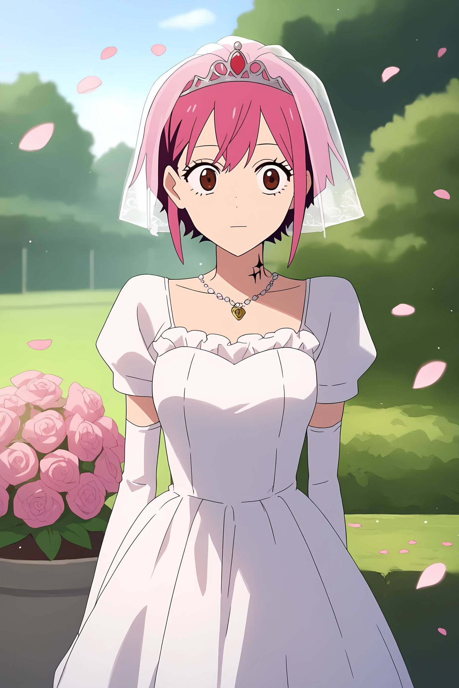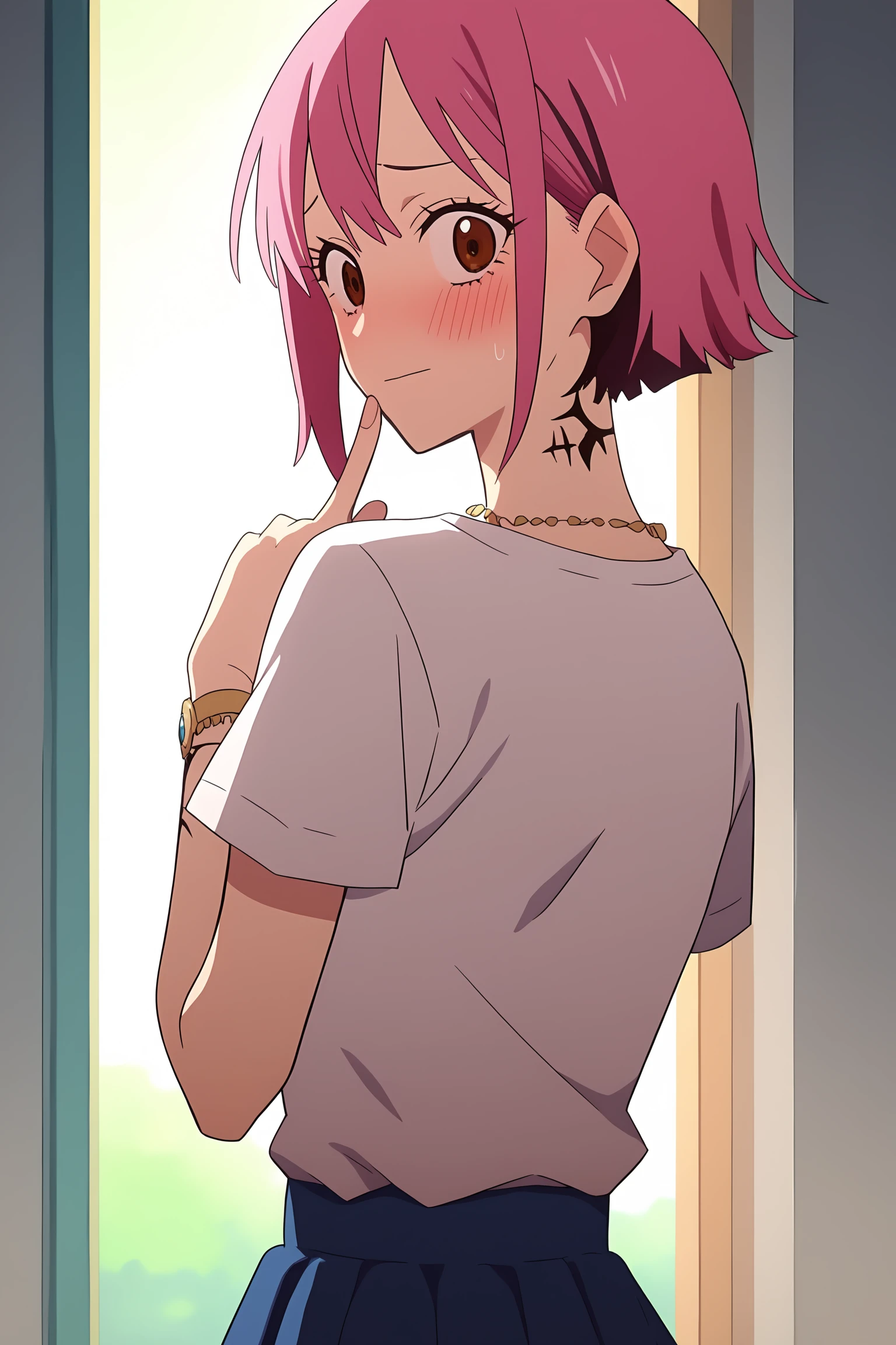1girl, solo, short hair, pink hair, brown eyes, tora-chan