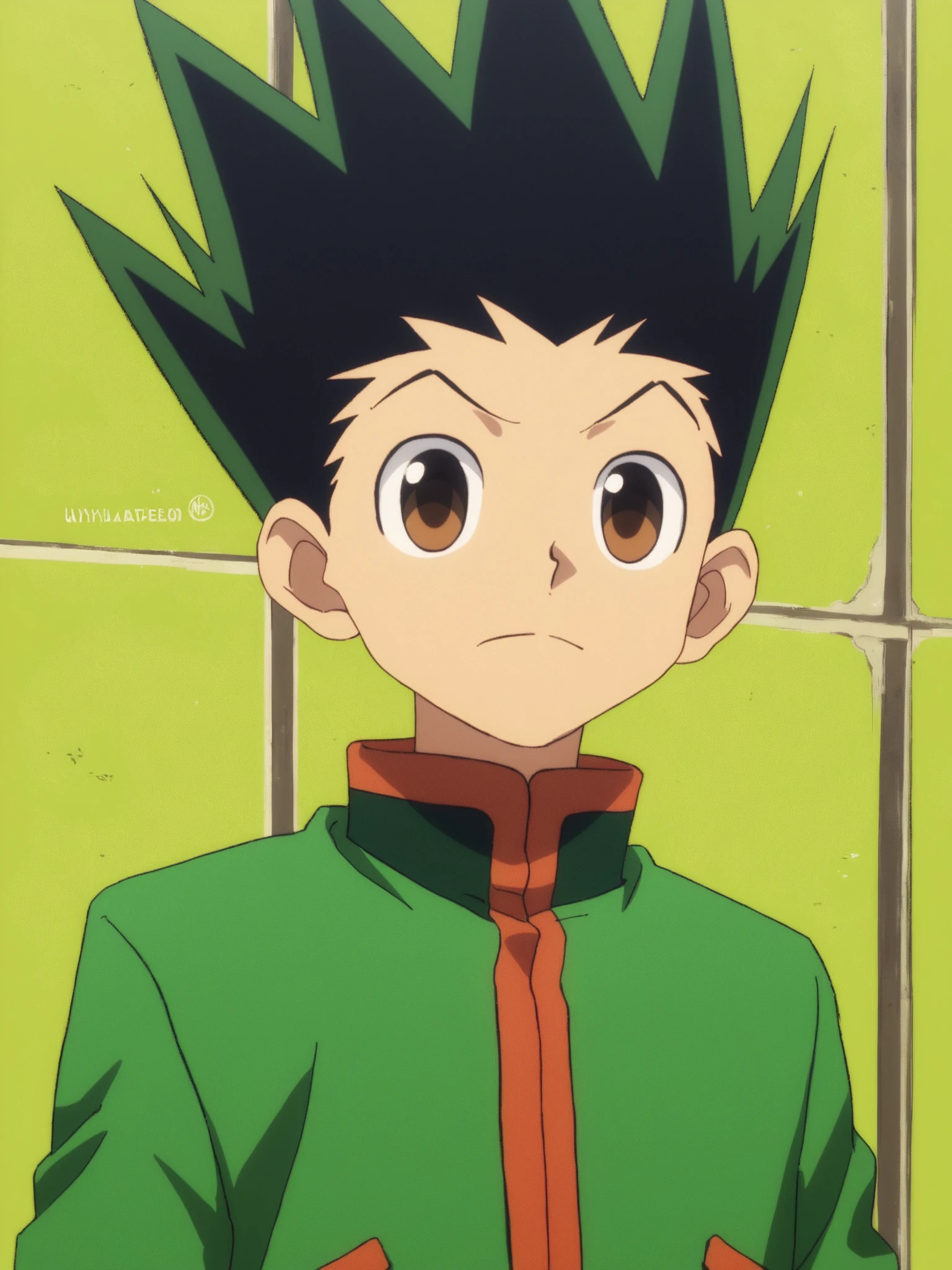 "1 boy, Gon Freecss, HxH, 1boy, male focus, spiked hair, black hair, green hair".
