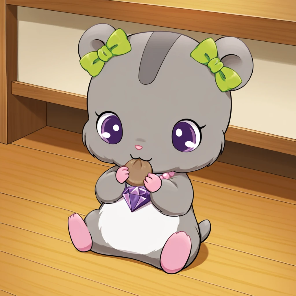 hamster, chibi, micro, light grey body, light grey fur, dark grey pattern, green headbow, pink pearl necklace, purple gem, white stomach, pink toes, grey tail, purple eyes