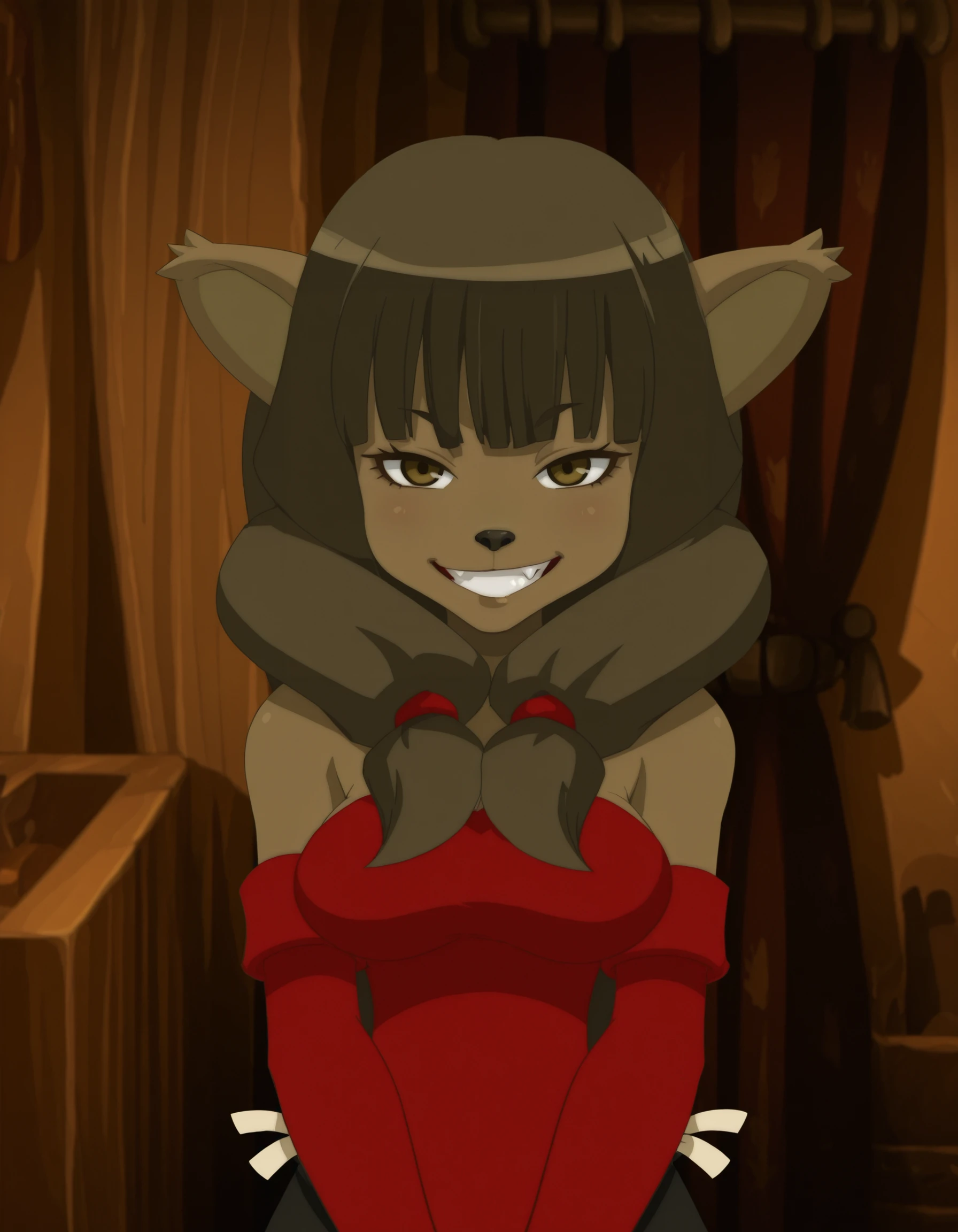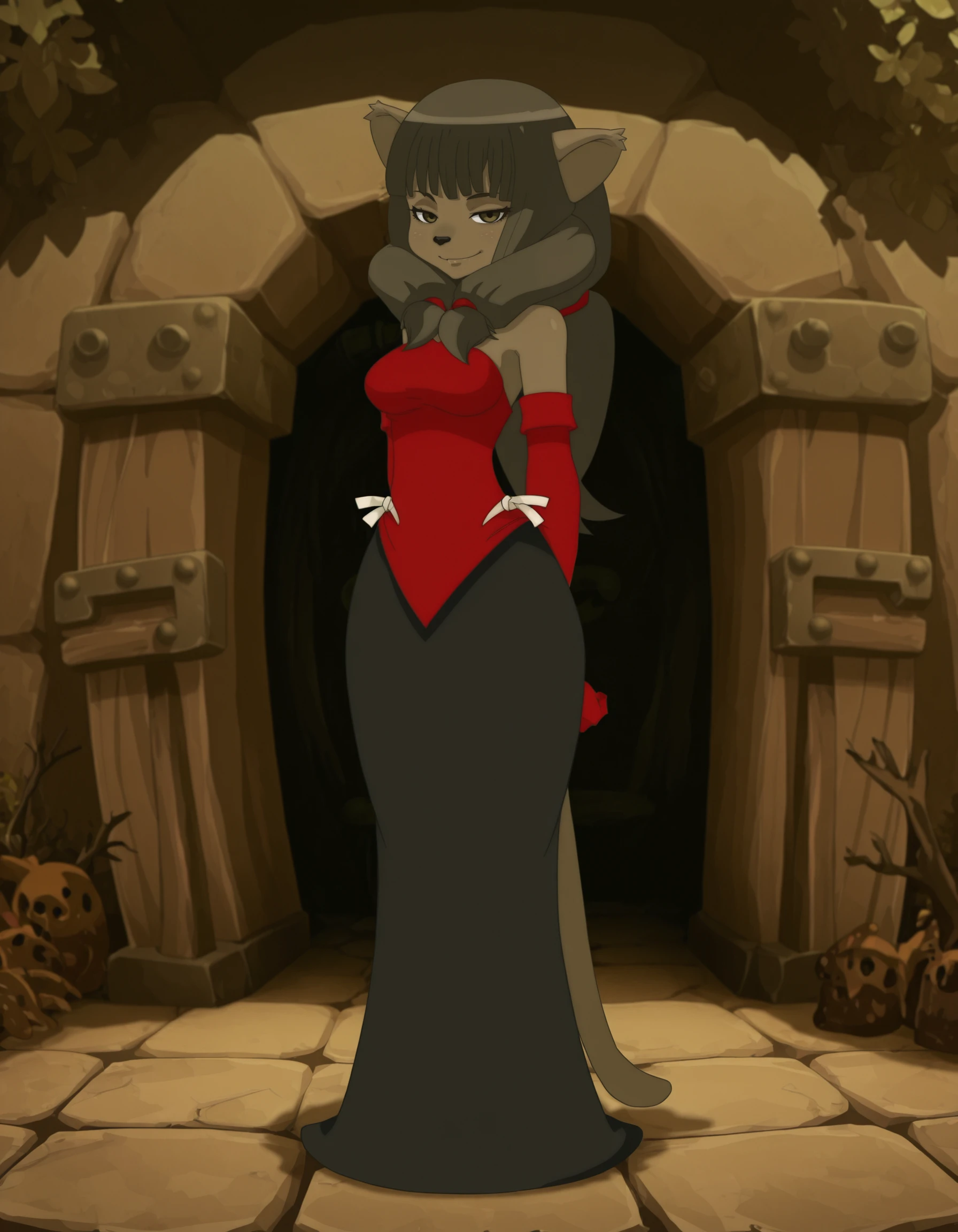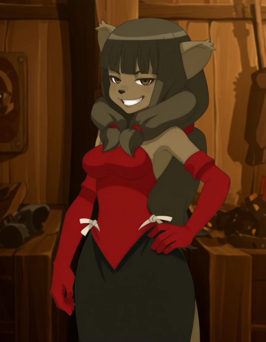 miranda, 1girl,solo furry, long hair, animal ears, elbow gloves, furry female, dress, black hair
