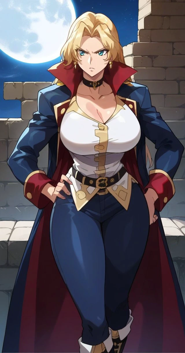 Promt example - Sarah the space pirate, source_anime, score_9_up,score_8,score_7,1woman, standing, white bricks, stone bricks, bright moon light, night, hand on waist,parted bangs,serious,( thick thighs),blonde, blue pants,huge breasts, white formal shirt, blue pants,blue eyes, long blond hair, (very sexy,)blue pants,golden earrings golden buttons, massive hips, thin waist, boots,bootlace, belt,blue coat, high colar, choker, high res
