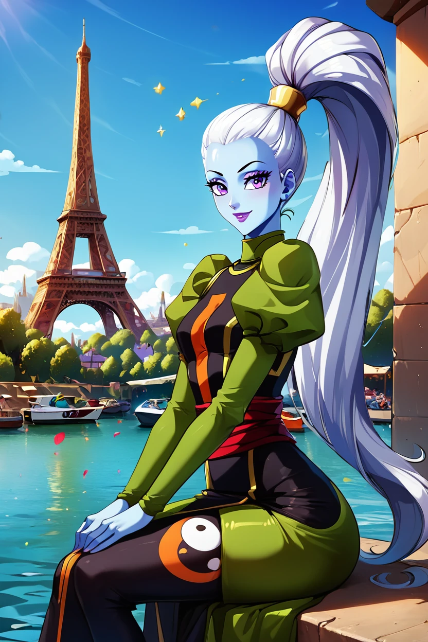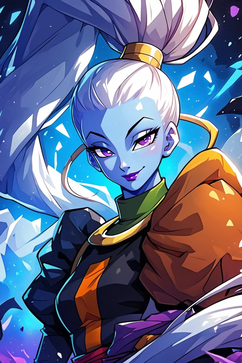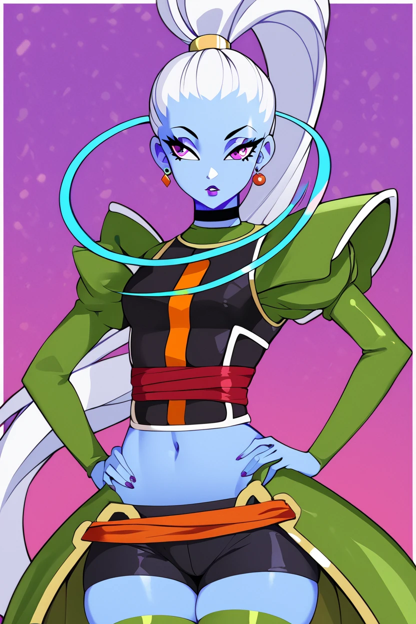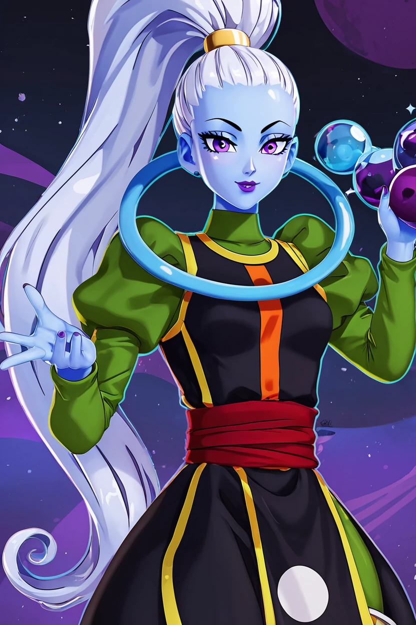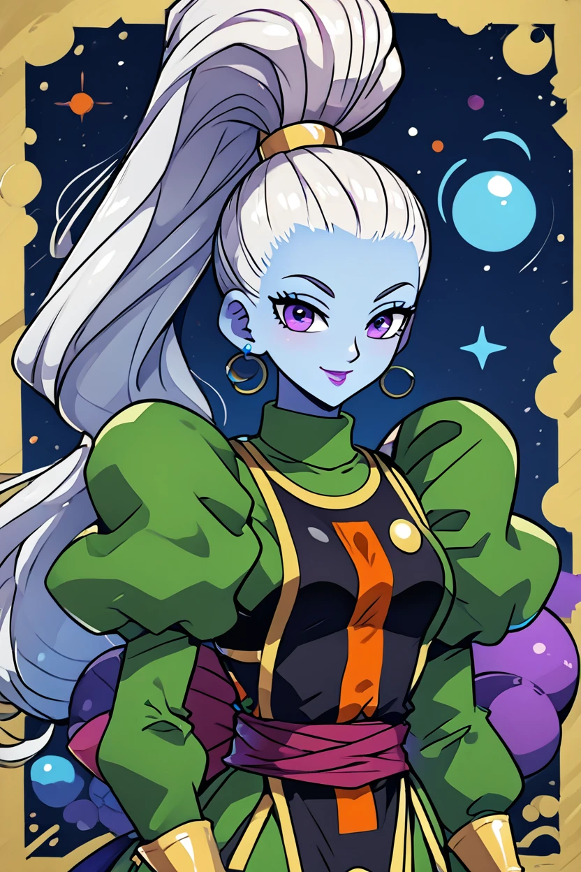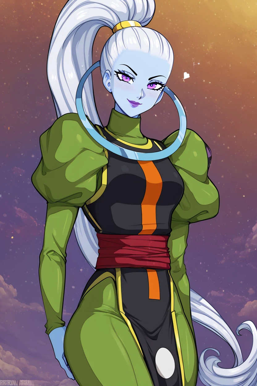 zzVados, long hair, ponytail, white hair, blue skin, hair pulled back, high ponytail, very long hair, purple eyes, long sleeves, puffy sleeves, sash, purple lips, dress, makeup, lipstick, <lora:Vados_DB_PDXL:0.8>,