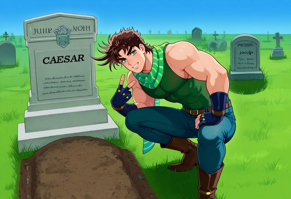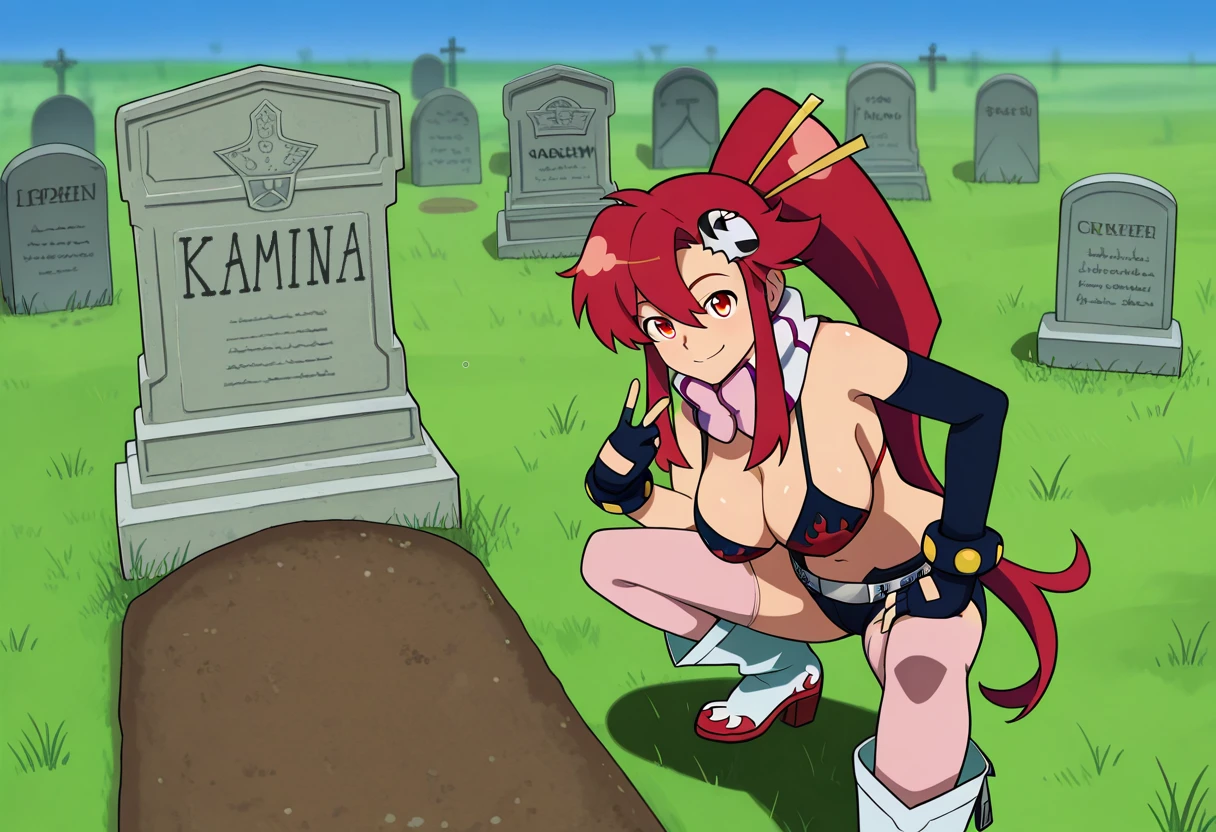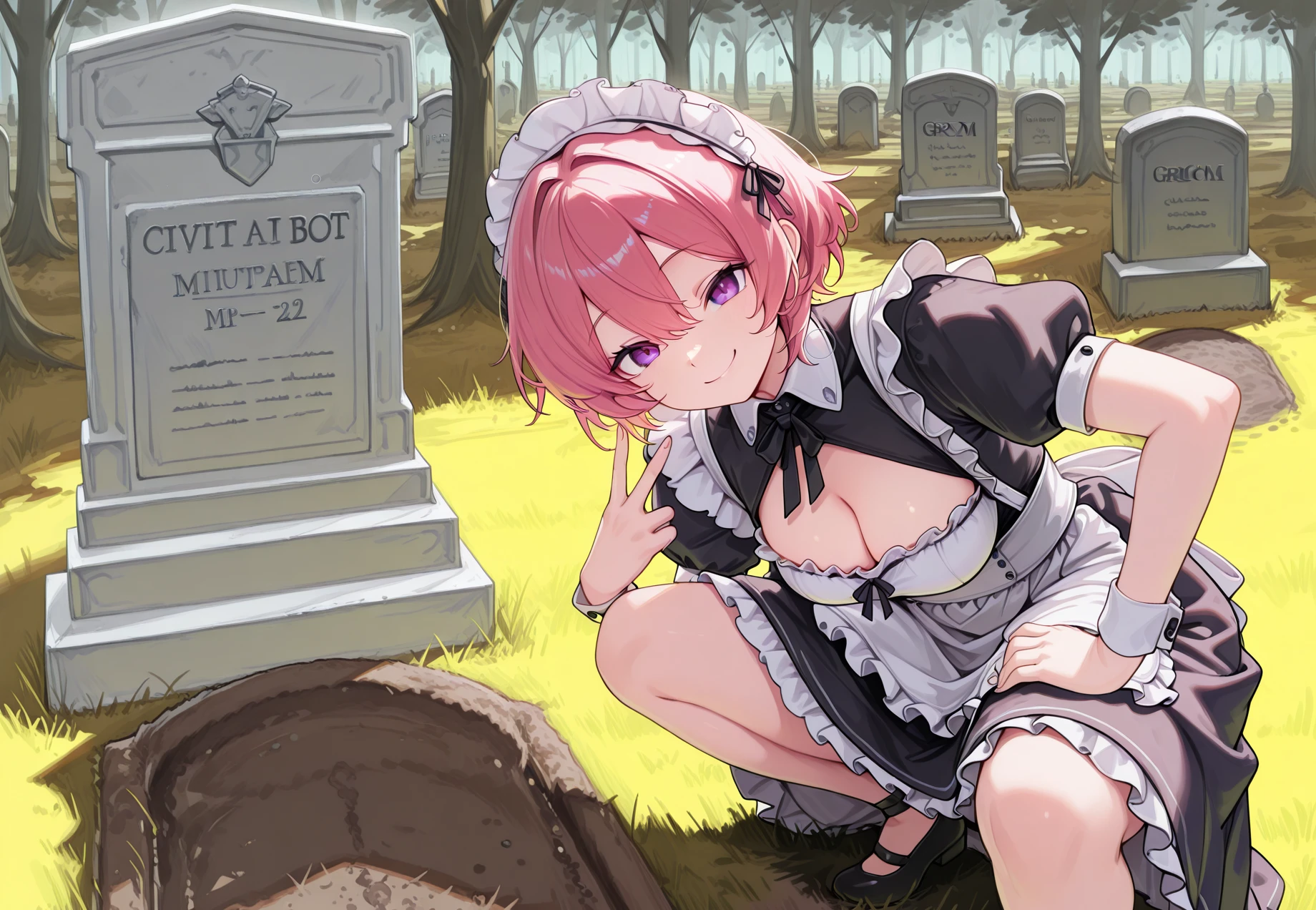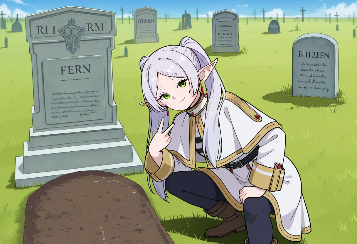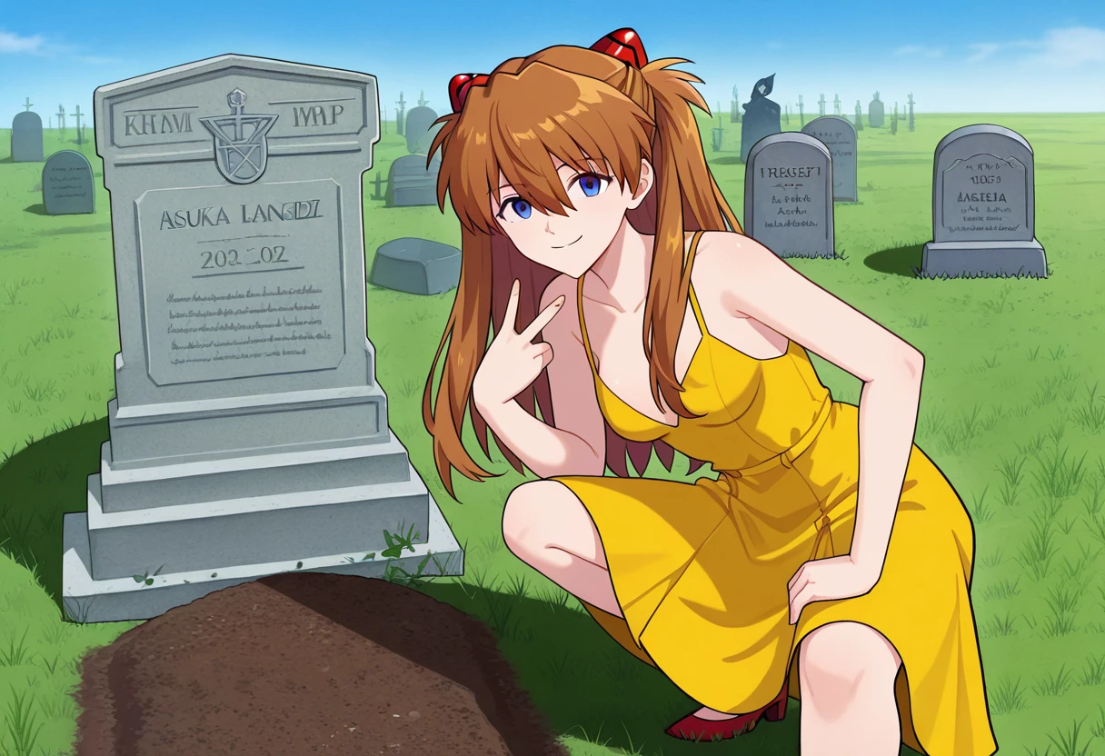 squatting, v, looking at viewer, smile, grave, tombstone,