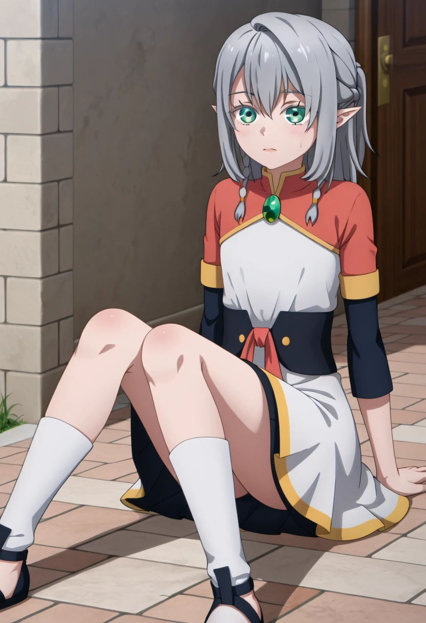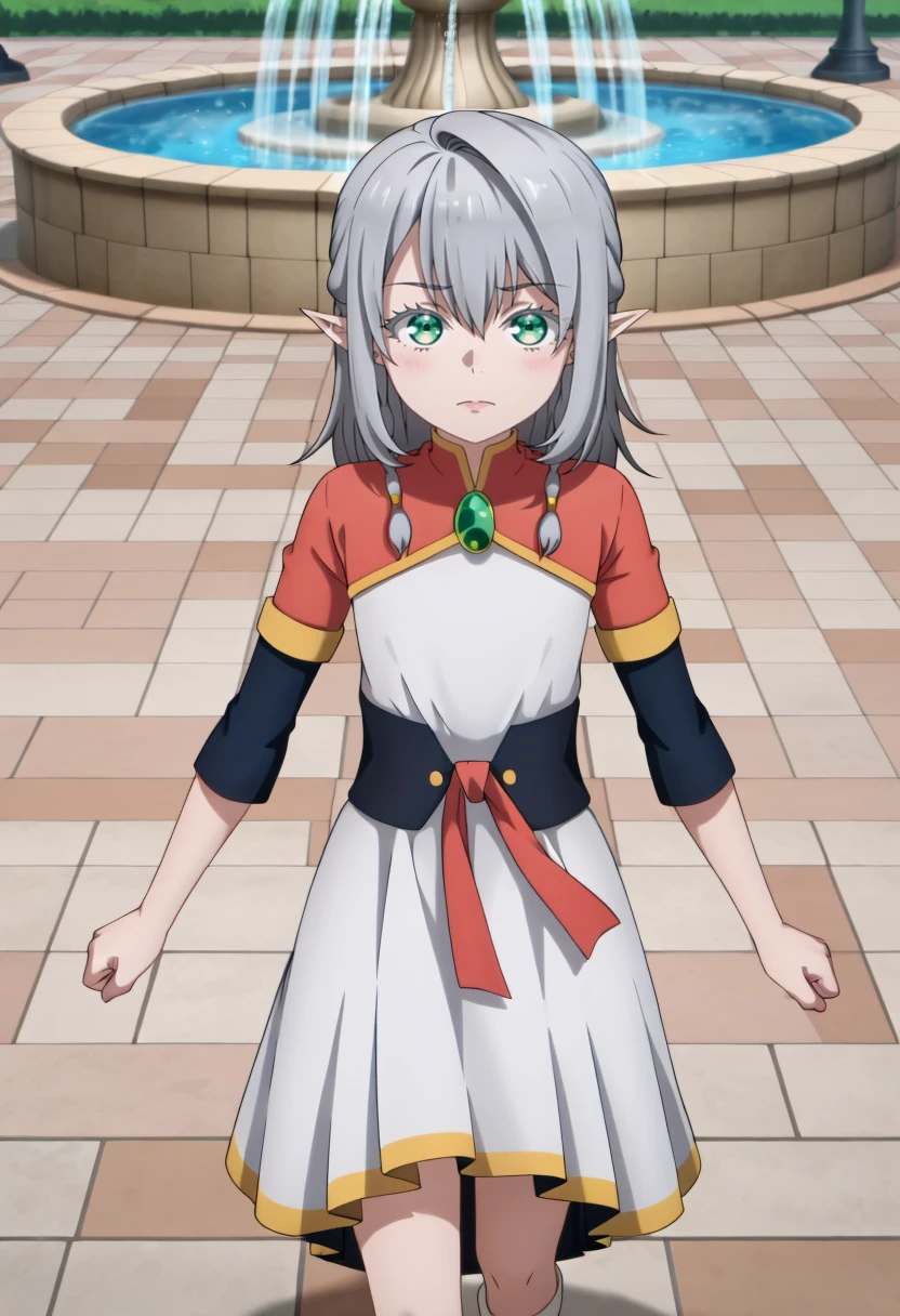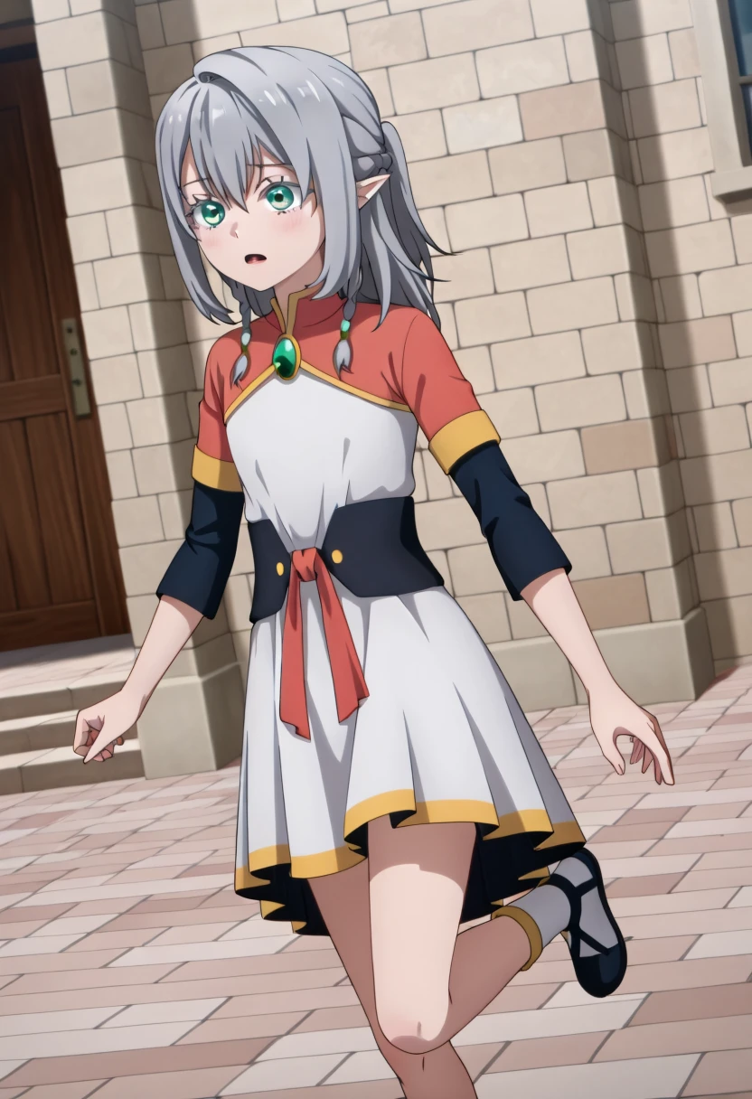 Young Tessia, 1girl, gray hair, pointed ears, elf, green eyes, white asymmetrical dress with yellow trim, red sash waist tie, black long-sleeve undershirt, green gem pendant necklace, white thigh-high socks, black crisscross strap shoes
