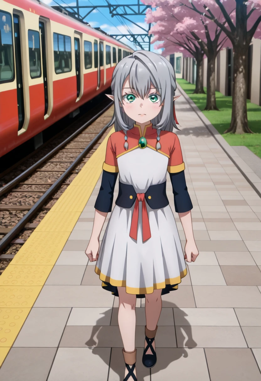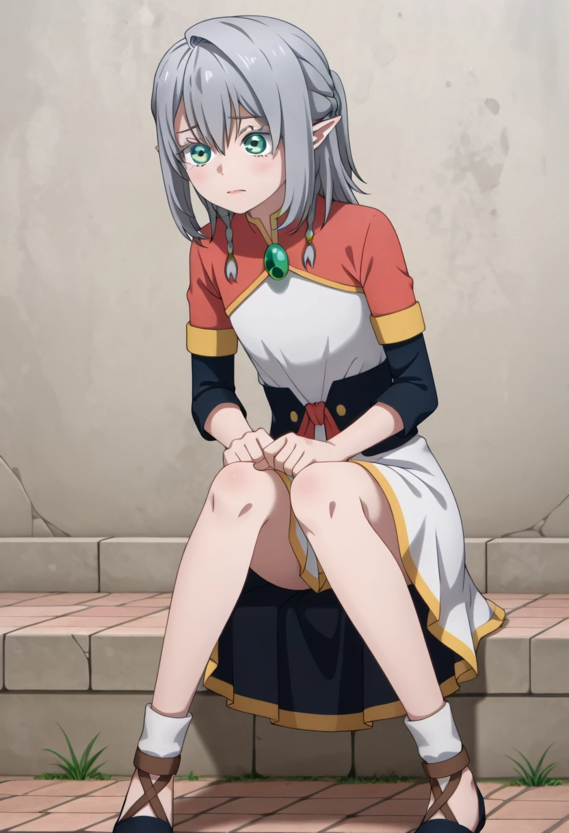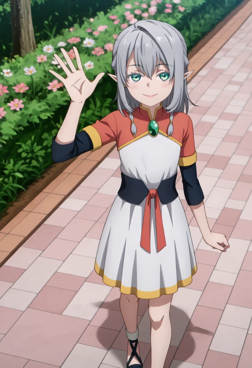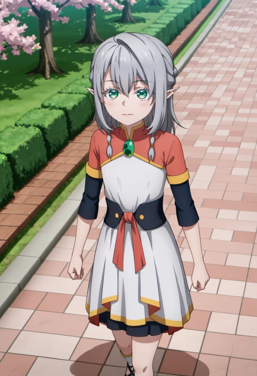 Young Tessia, 1girl, gray hair, pointed ears, elf, green eyes, white asymmetrical dress with yellow trim, red sash waist tie, black long-sleeve undershirt, green gem pendant necklace, white thigh-high socks, black crisscross strap shoes