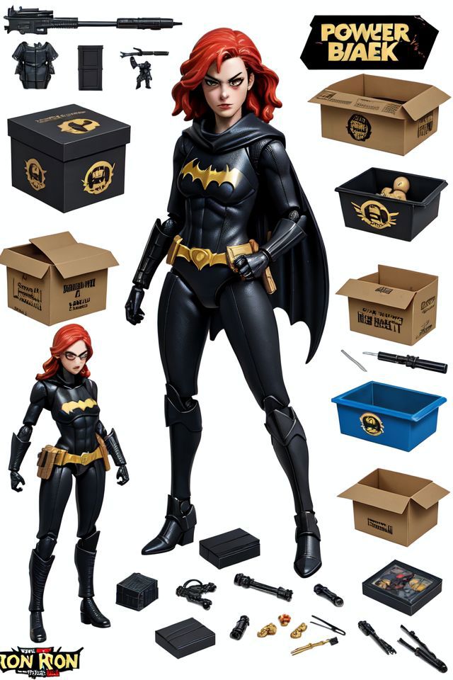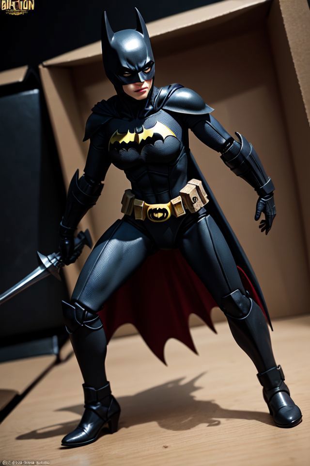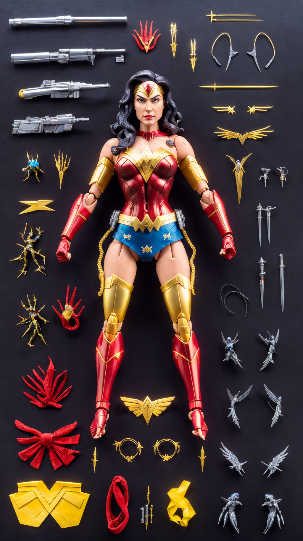 (Dutch angle:1.3), (ActionFigureQuiron style), solo, Wonder Woman (DC Comics): Wonder Woman's iconic armor, tiara, and Lasso of Truth make her a powerful and empowering character to cosplay , action figure box, weapon, wings, high heels, no humans, (reference sheet:1.4), power armor,