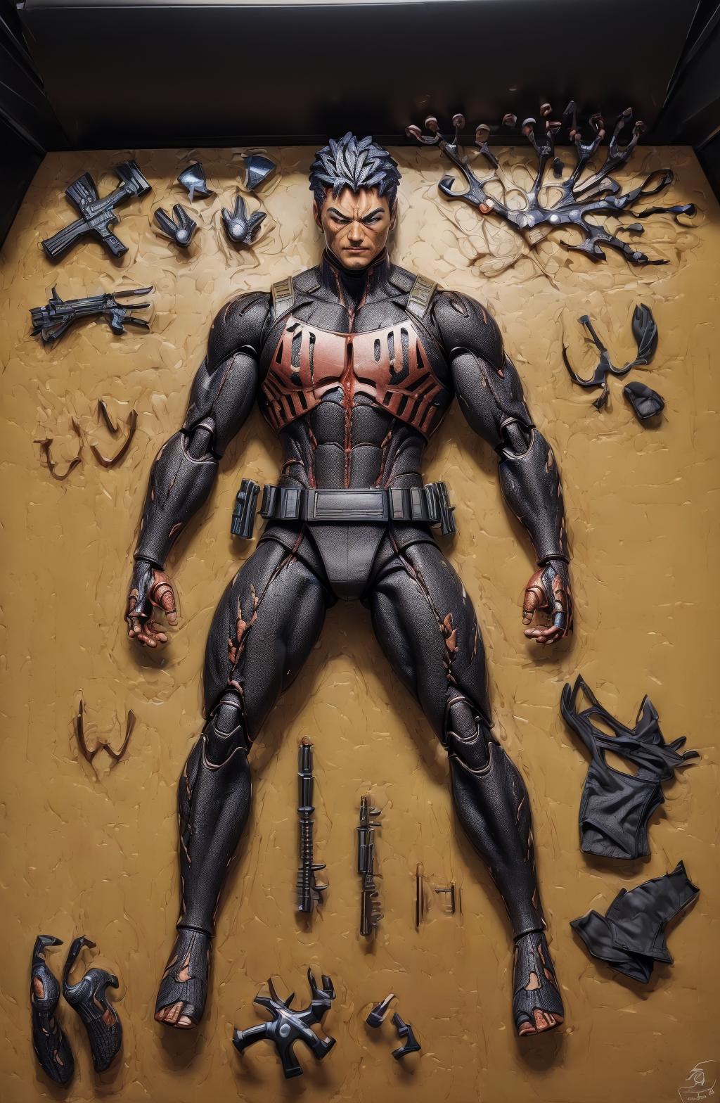 (8k, ultra quality, masterpiece:1.5), (Dutch angle:1.3), ActionFigureQuiron style,action figure box, solo, 1boy, white background, male focus, belt, bodysuit, mask, bug, superhero, <lora:quiron_ActionFigure_v2_Lora:1>
