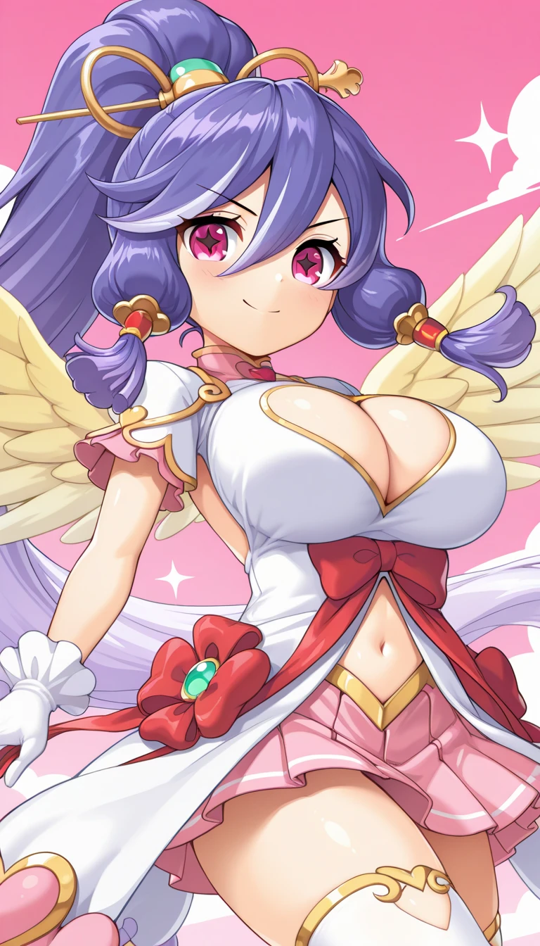 Cupid's default costume : HattoriHanzou\(legend clover\), 1girl, very long hair, white hair, purple hair, two-tone hair, gradient hair, high ponytail, sidelocks, hair between eyes, hair stick, pink eyes, star-shaped pupils, hair tubes, red bow, heart print, feathered wings, white wings, yellow wings, gold trim, large breasts, cleavage cutout, heart cutout, navel, navel cutout, white dress, short sleeves, white gloves, frilled gloves, pleated skirt, pink skirt, miniskirt, white thighhighs, high heels, platform heels, pink footwear, footwear bow