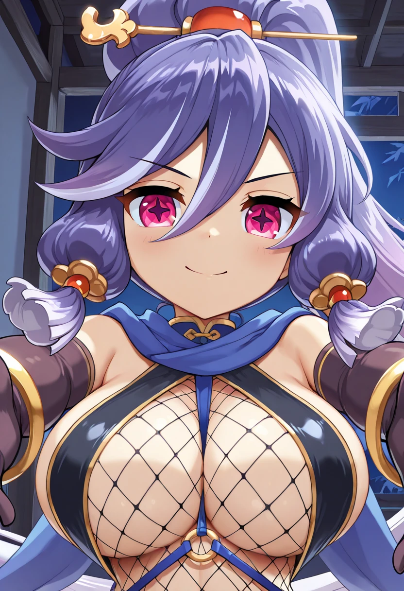 Default Costume: HattoriHanzou\(legend clover\), 1girl, very long hair, white hair, purple hair, two-tone hair, gradient hair, high ponytail, sidelocks, hair between eyes, hair stick, pink eyes, star-shaped pupils, hair tubes, large breasts, cleavage, underboob, bare shoulders, armpits, long scarf, blue scarf, gold trim, sling bikini top, black bikini, black gloves, elbow gloves, fingerless gloves, bangle, wrist guards, fishnet leotard, o-ring belt, blue belt, covered navel, waist sash, puffy pants, thigh cutout, black panties, rope, fur-trimmed footwear, black thighhighs, jika-tabi,