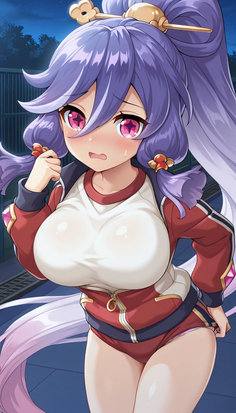 Gym uniform Costume (Hades): HattoriHanzou\(legend clover\), 1girl, very long hair, white hair, purple hair, two-tone hair, gradient hair, high ponytail, sidelocks, hair between eyes, hair stick, pink eyes, star-shaped pupils, hair tubes, large breasts, white shirt, two-tone jacket, open jacket, red jacket, track jacket, gym shirt, red track suit, long sleeves, partially unzipped, zipper, zipper pull tab, gold trim, red buruma, kneehighs, white socks, sneakers, white footwear, ankle_lace-up,