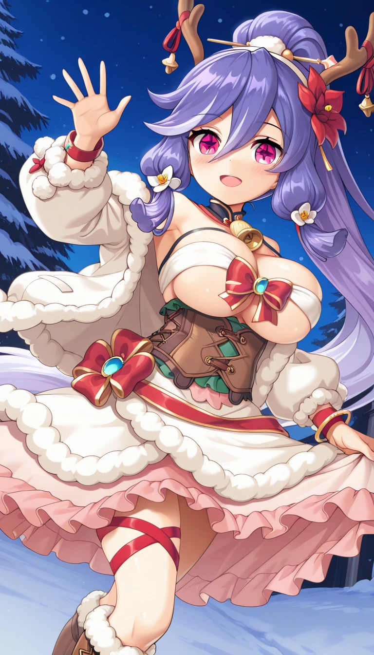 Christmas Costume (Katia): HattoriHanzou\(legend clover\), 1girl, very long hair, white hair, purple hair, two-tone hair, gradient hair, high ponytail, sidelocks, hair between eyes, hair stick, pink eyes, star-shaped pupils, hair tubes, , red ribbon, hair flower, reindeer antlers, fake antlers, neck bell, brooch, detached collar, black collar, gold trim, wool, bracelet, red wristband, red flower, large breasts, cleavage, underboob, underbust, bare shoulders, off shoulder, strapless, ribbon as bra, bow bra, criss-cross halter, corset, white jacket, fur-trimmed jacket, fur-trimmed sleeves, puffy sleeves, white sleeves, white skirt, pink skirt, layered skirt, frilled skirt, fur-trimmed skirt, leg ribbon, knee boots, lace-up boots, fur-trimmed boots, brown footwear, pom pom footwear, footwear bell,